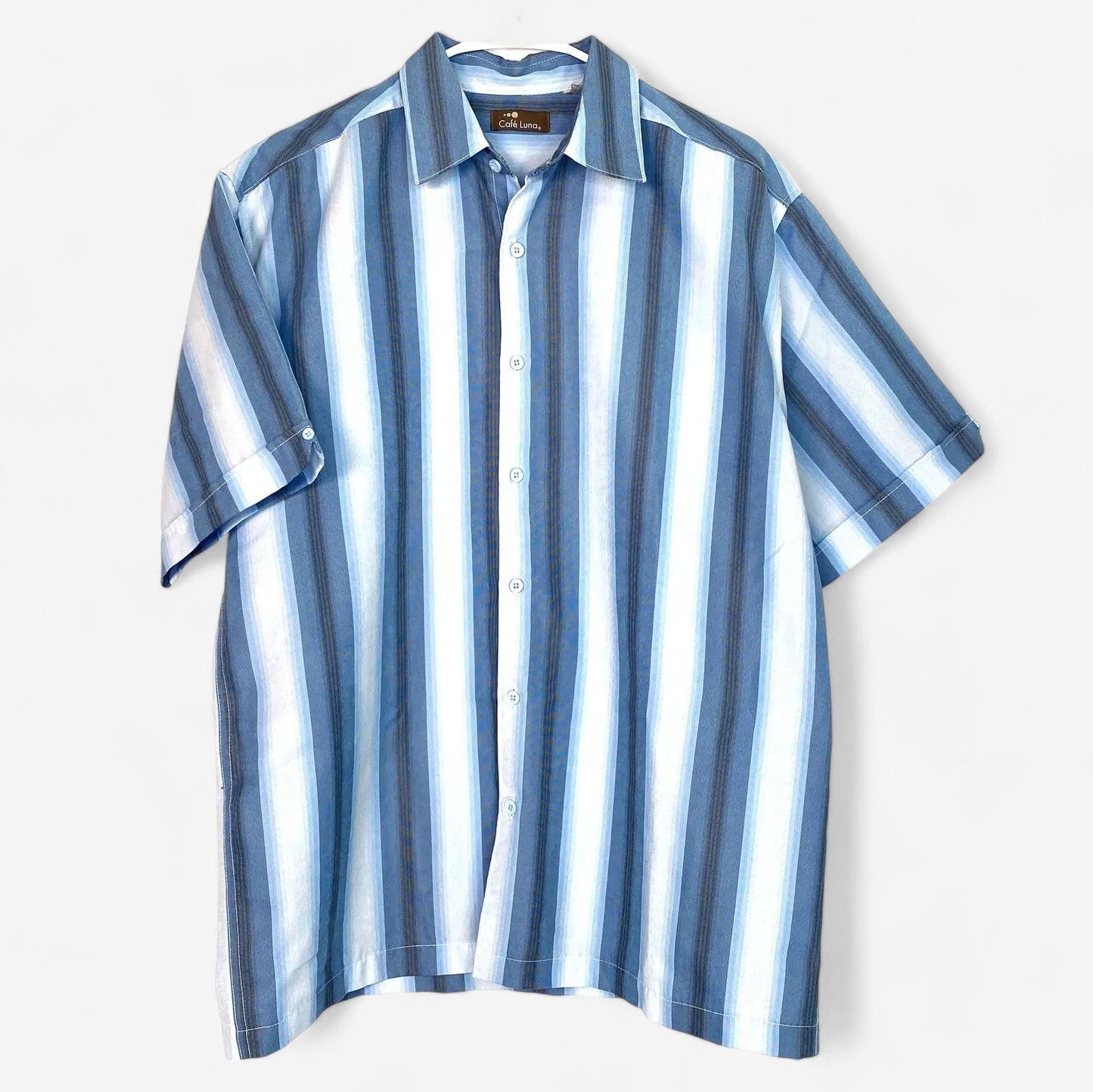 Elevate your casual wardrobe with the Cafe Luna Men's Striped Short Sleeve Button-Up Lounge Shirt. This blue, size Large shirt combines comfort and style, making it an ideal choice for relaxed occasions.