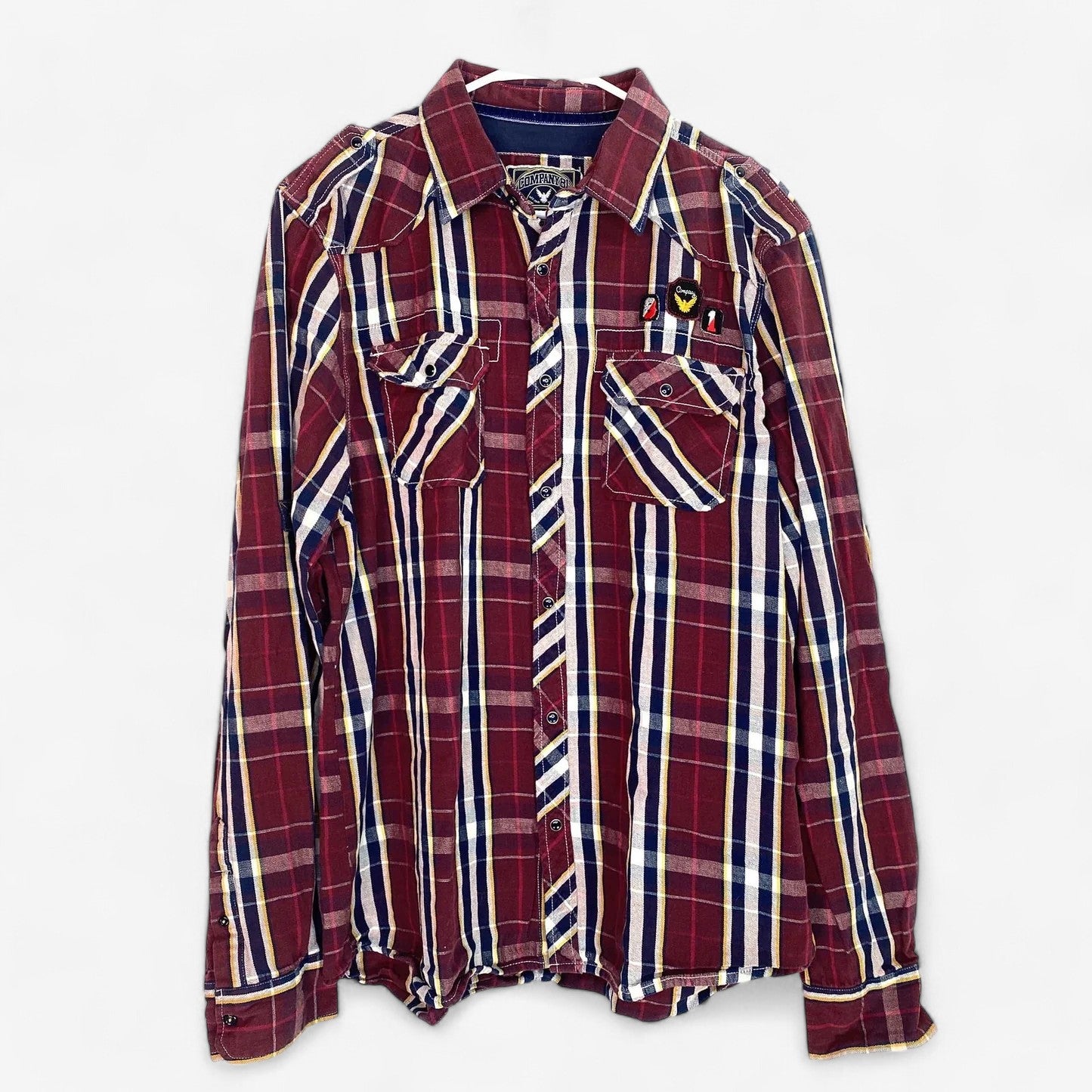 Enhance your casual wardrobe with this Company 81 Men's Western Shirt. Featuring a maroon and brown plaid pattern, this long sleeve button-up is crafted from a comfortable cotton blend, offering both style and comfort.