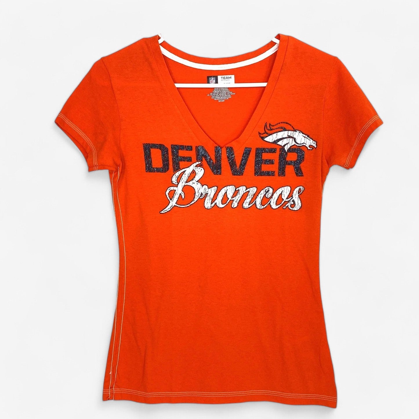 Denver Broncos Women's V-Neck T-Shirt - Sparkle Logo - Small - Orange/Blue