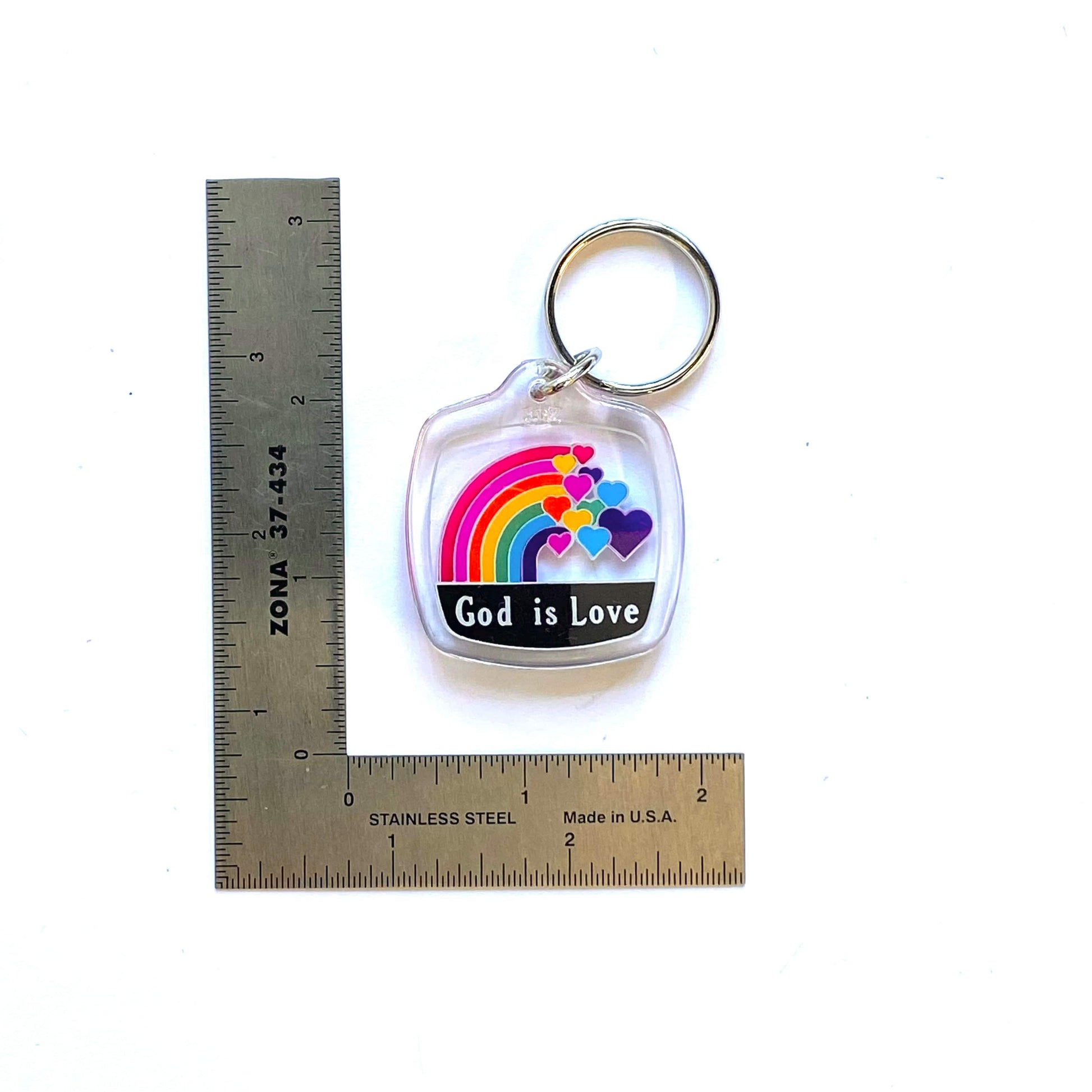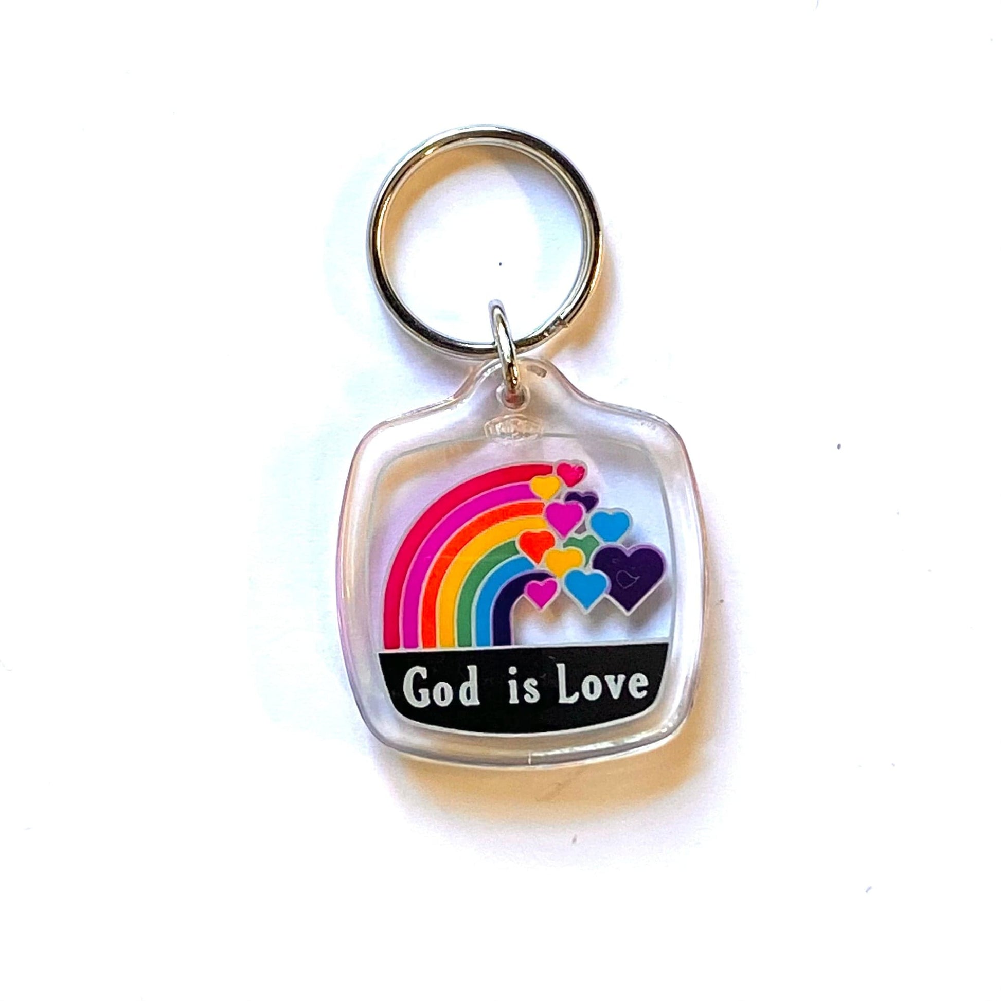 “God is Love” Rainbow Hearts Souvenir Keychain Key Ring Square Clear Acrylic