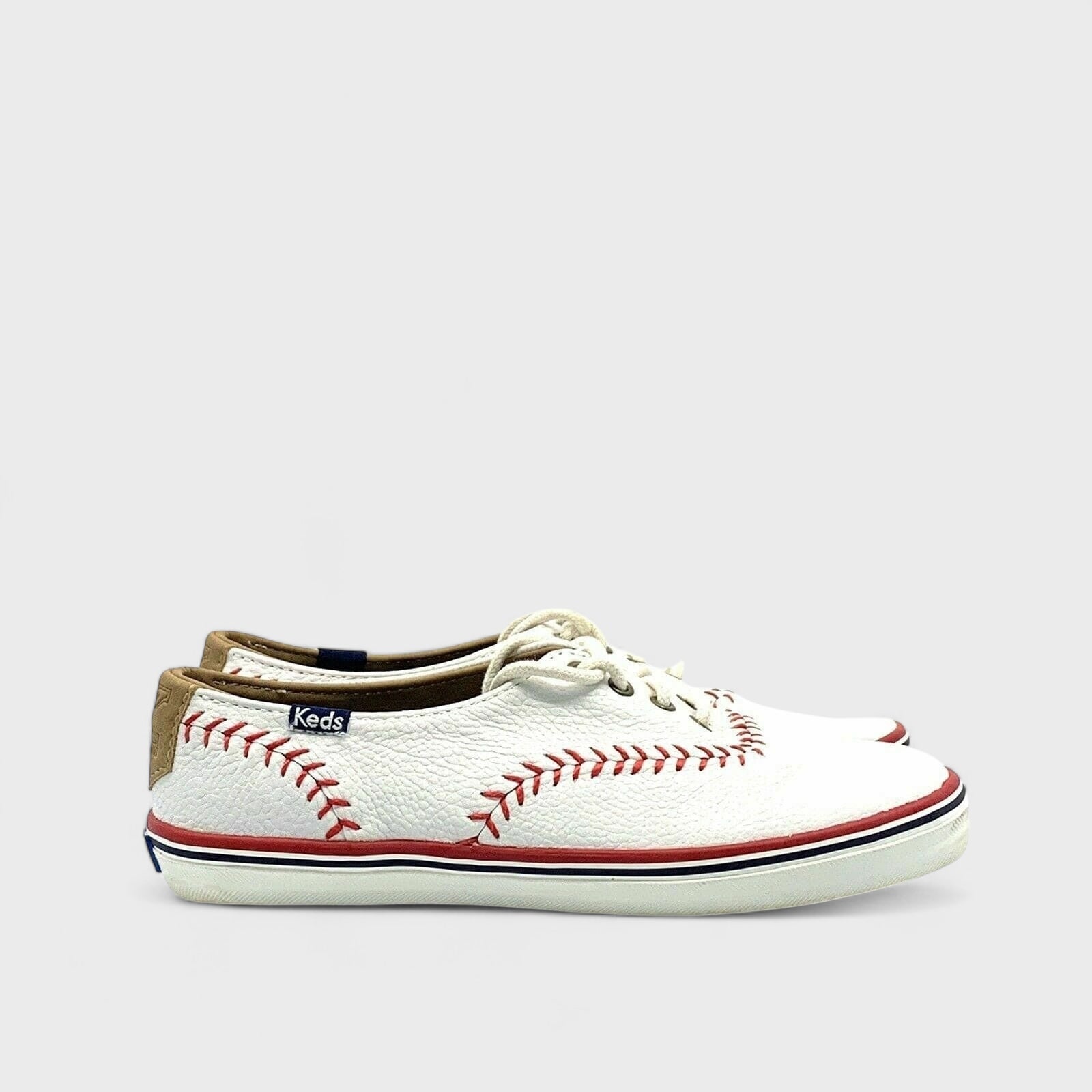 Step into effortless style and comfort with our Keds Sneakers - Womens Baseball Stitch Lace-Up. Crafted from premium white leather, these sneakers feature a charming baseball stitch design that adds a playful touch to your casual wardrobe. Perfect for everything from leisurely strolls to casual outings, these shoes are not just footwear; they are a statement of your laid-back lifestyle.