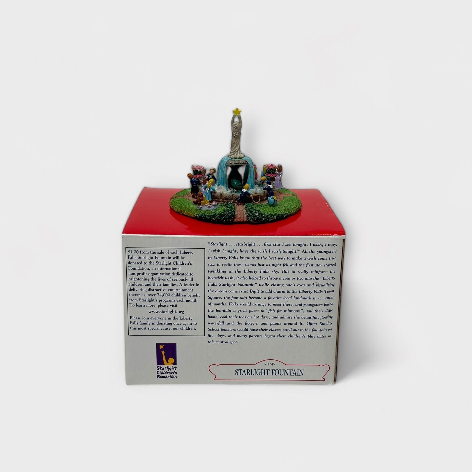 Celebrate the charm and magic of Liberty Falls with the Starlight Fountain miniature. This beautifully hand-painted collectible features intricate details that depict a whimsical scene of community and joy around the iconic fountain centerpiece.
