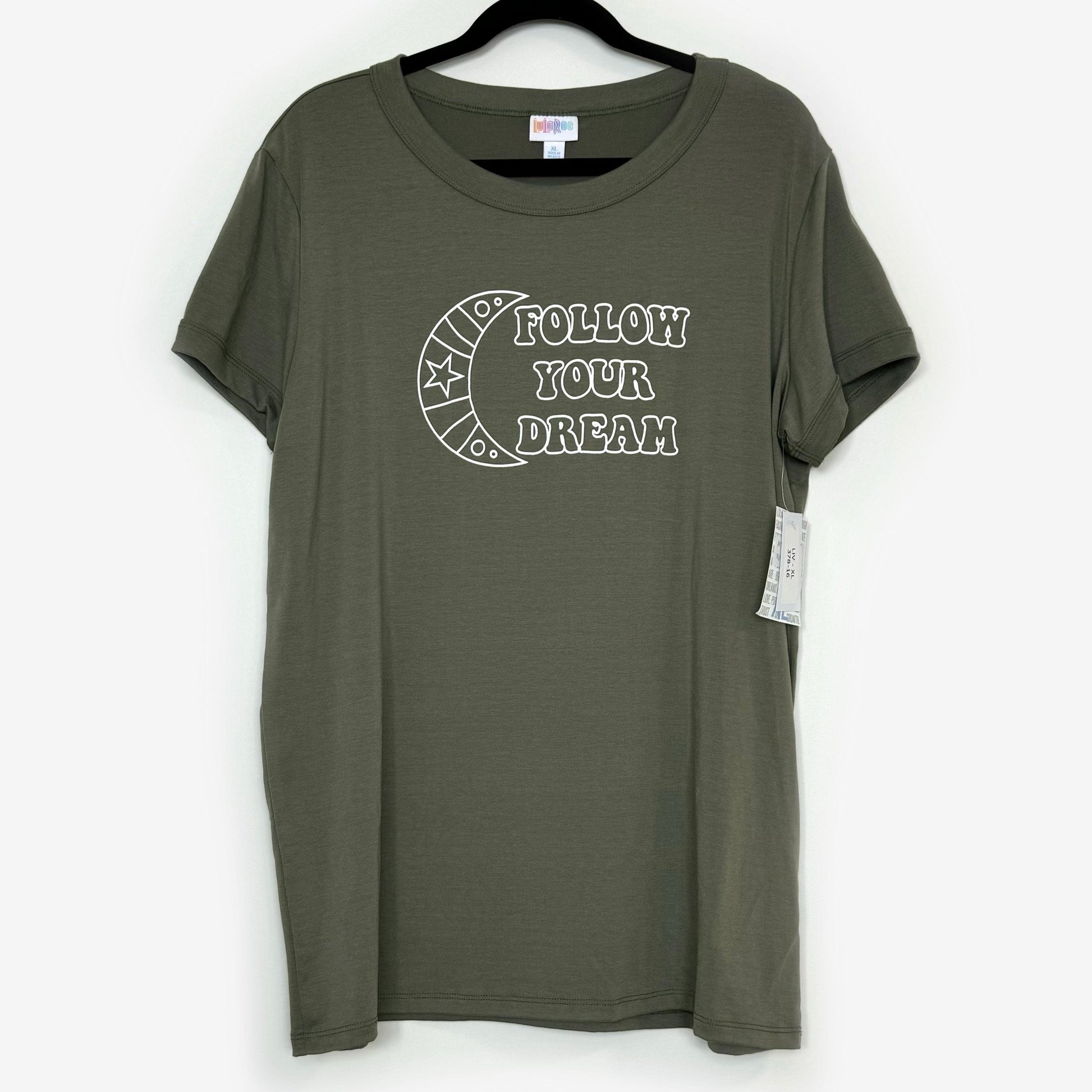 LuLaRoe | Liv T | XL (18-20) | Olive Green | ‘FOLLOW YOUR DREAMS’ | Cap Sleeves | NWT