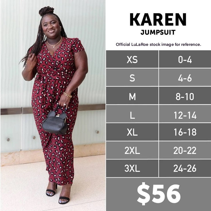 The LuLaRoe KAREN Jumpsuit is feminine and sweet with its cross-front neckline, shirring at the shoulder, and cap sleeves. Designed for ultimate comfort and ease of movement, the elastic waistband and self waist belt provide a flattering fit for sizes 3XL (24-26). Perfect for on-the-go, this jumpsuit even has side-seam pockets for your essentials.