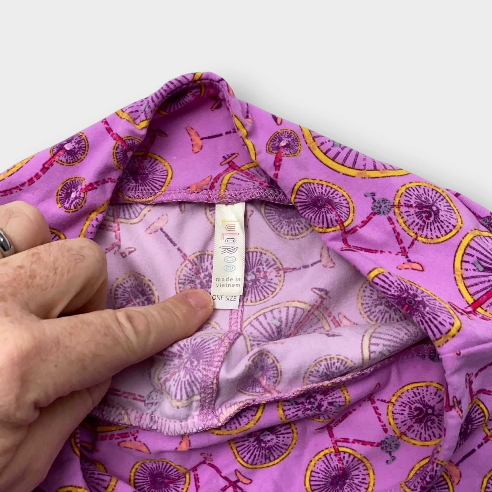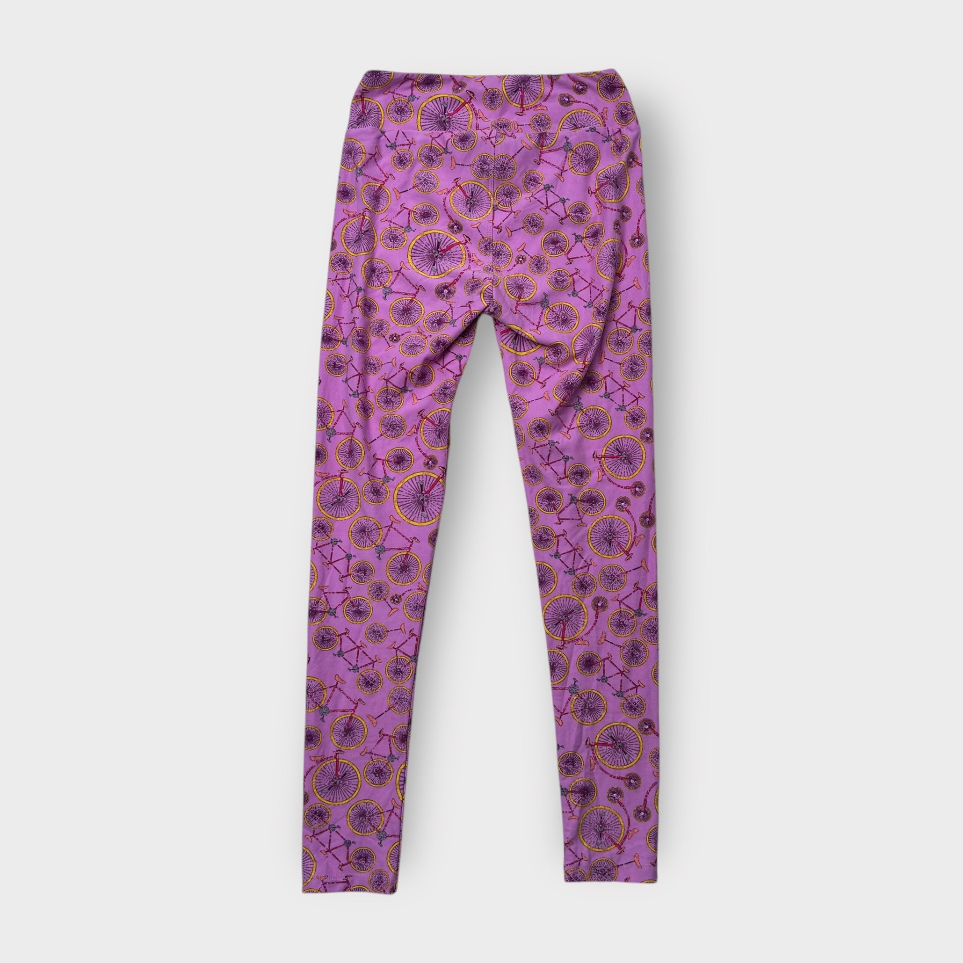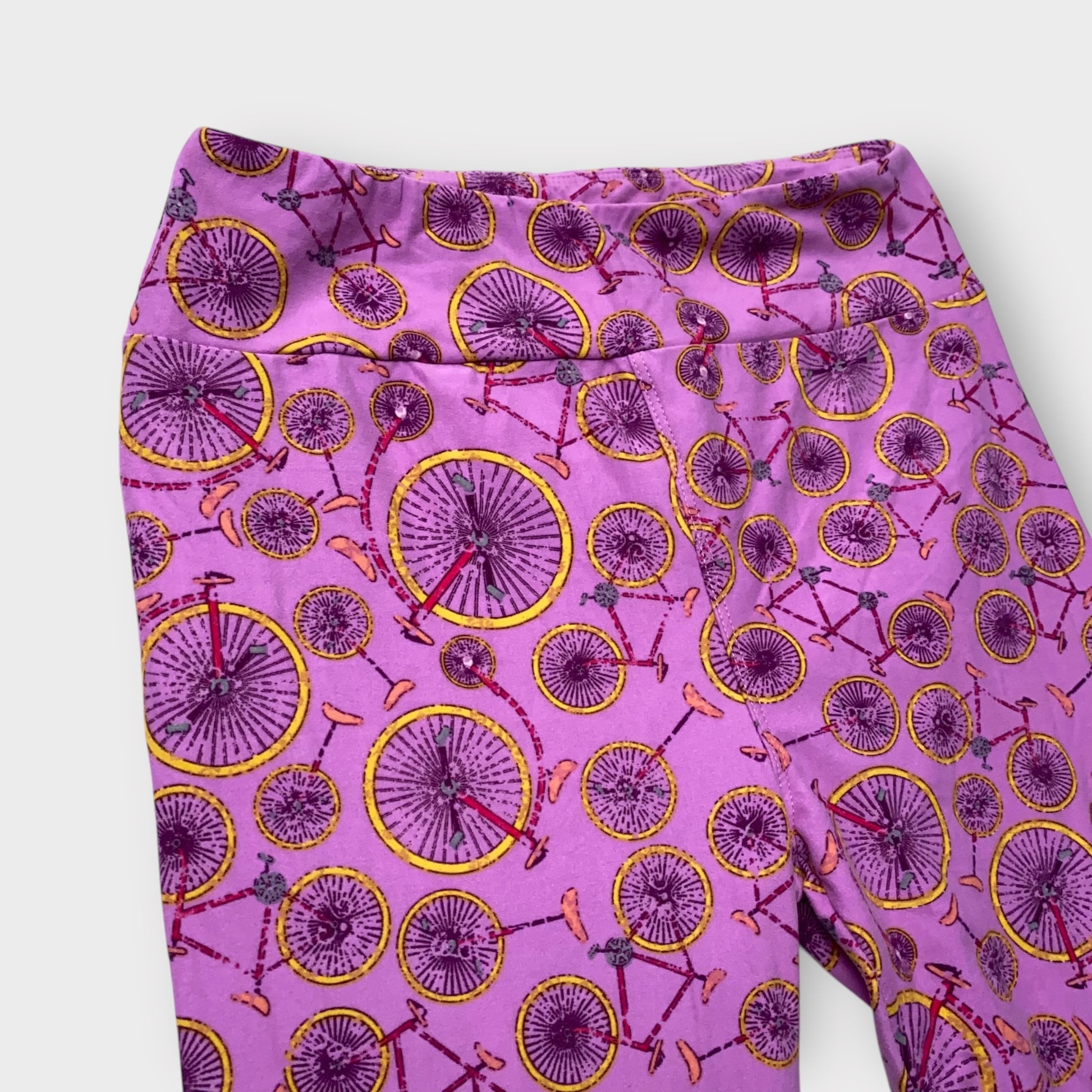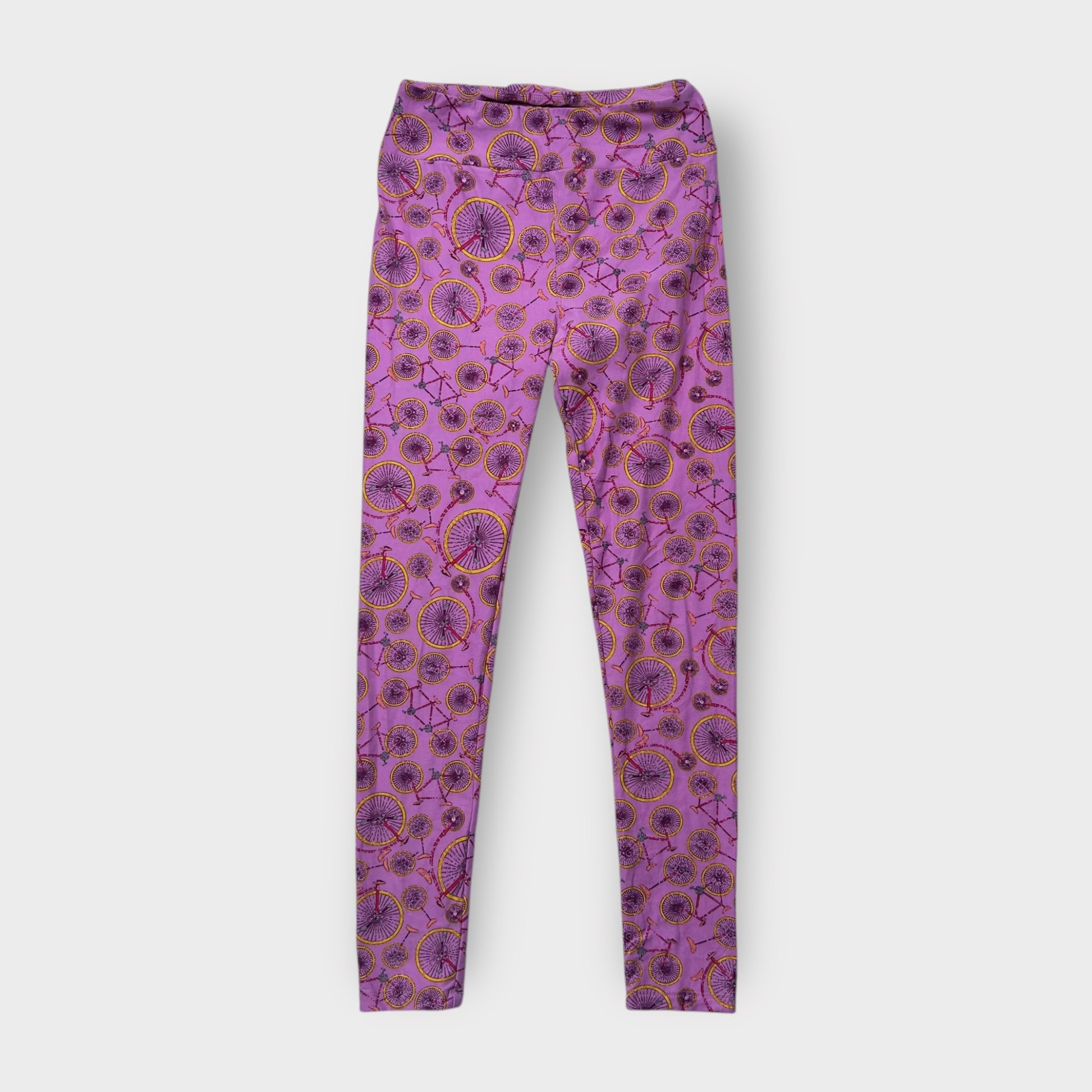 Pedal into style with LuLaRoe's buttery-soft leggings, showcasing a vibrant purple base adorned with a playful yellow bicycle wheel print. These leggings are designed to provide exceptional comfort and a unique aesthetic, perfect for cycling enthusiasts and fashion-forward individuals alike.