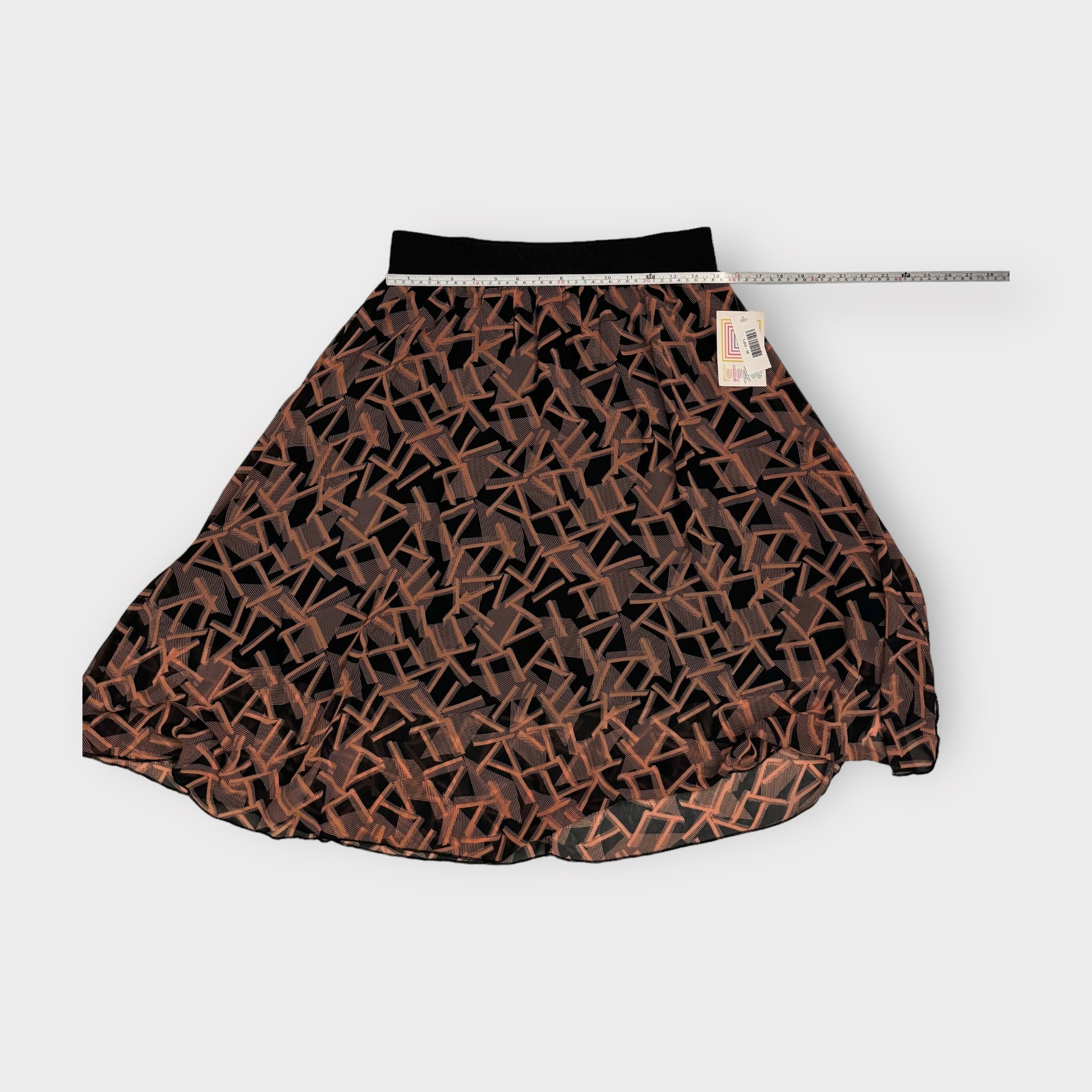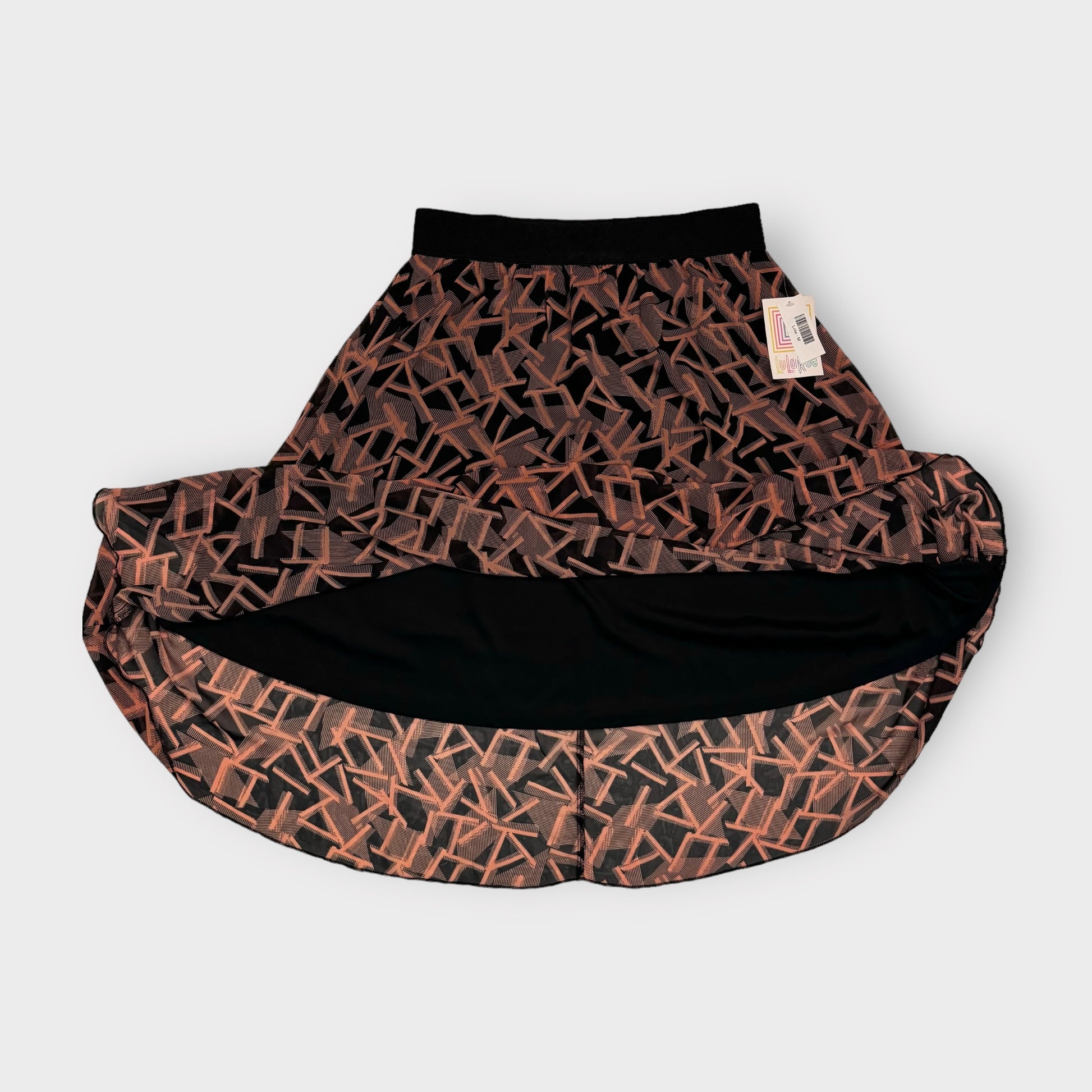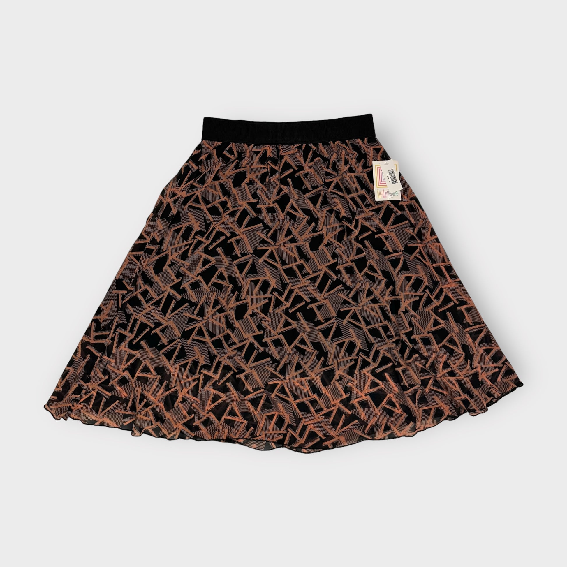 Step into elegance and comfort with the stunning LuLaRoe Lined Lola Skirt in a captivating Gold/Black Geometric pattern. This exquisite skirt, crafted from soft and breathable polyester chiffon, envelops you in a luxurious feel while making a bold fashion statement. Perfect for evening outings or special occasions, its unique design and flattering fit will have you turning heads and feeling confident.