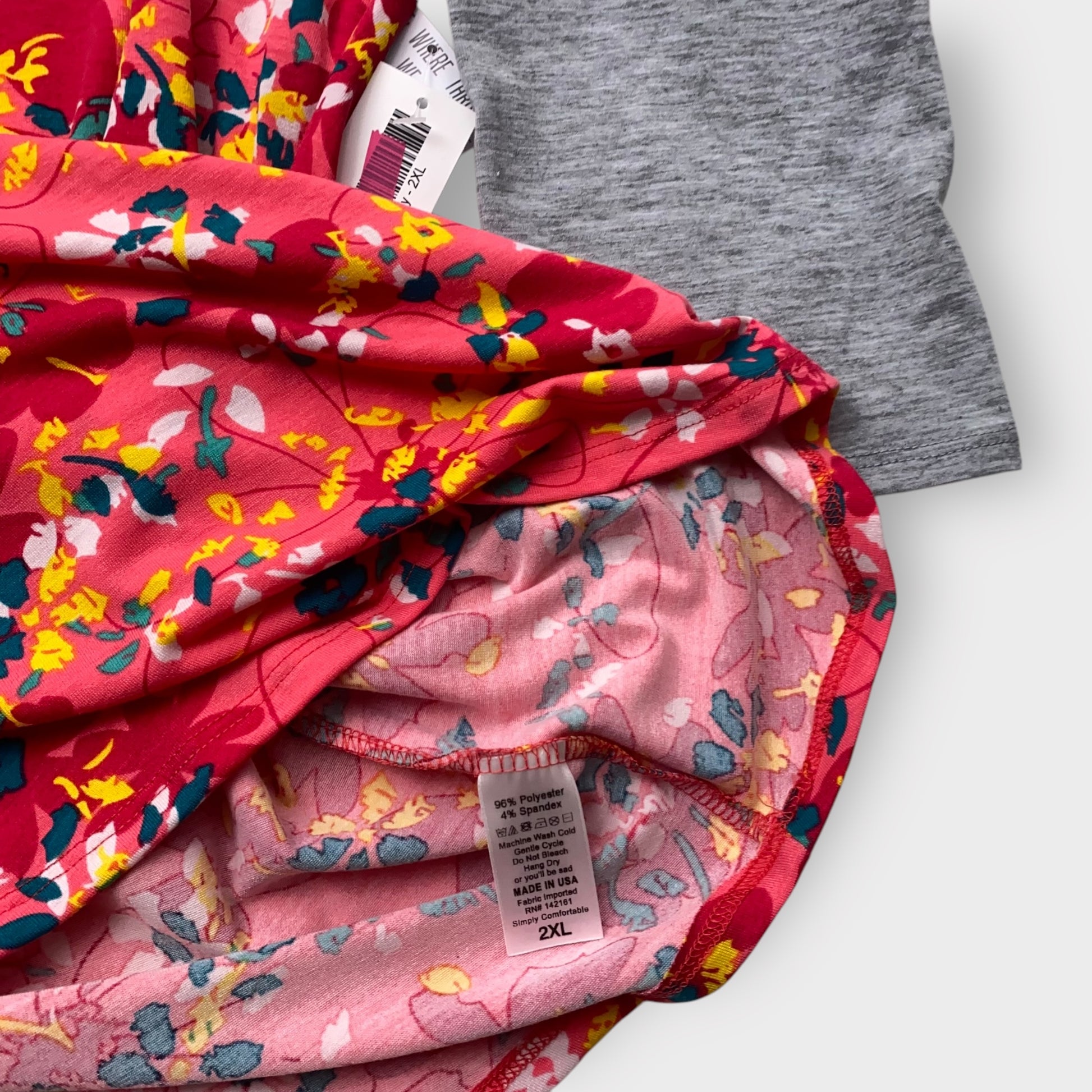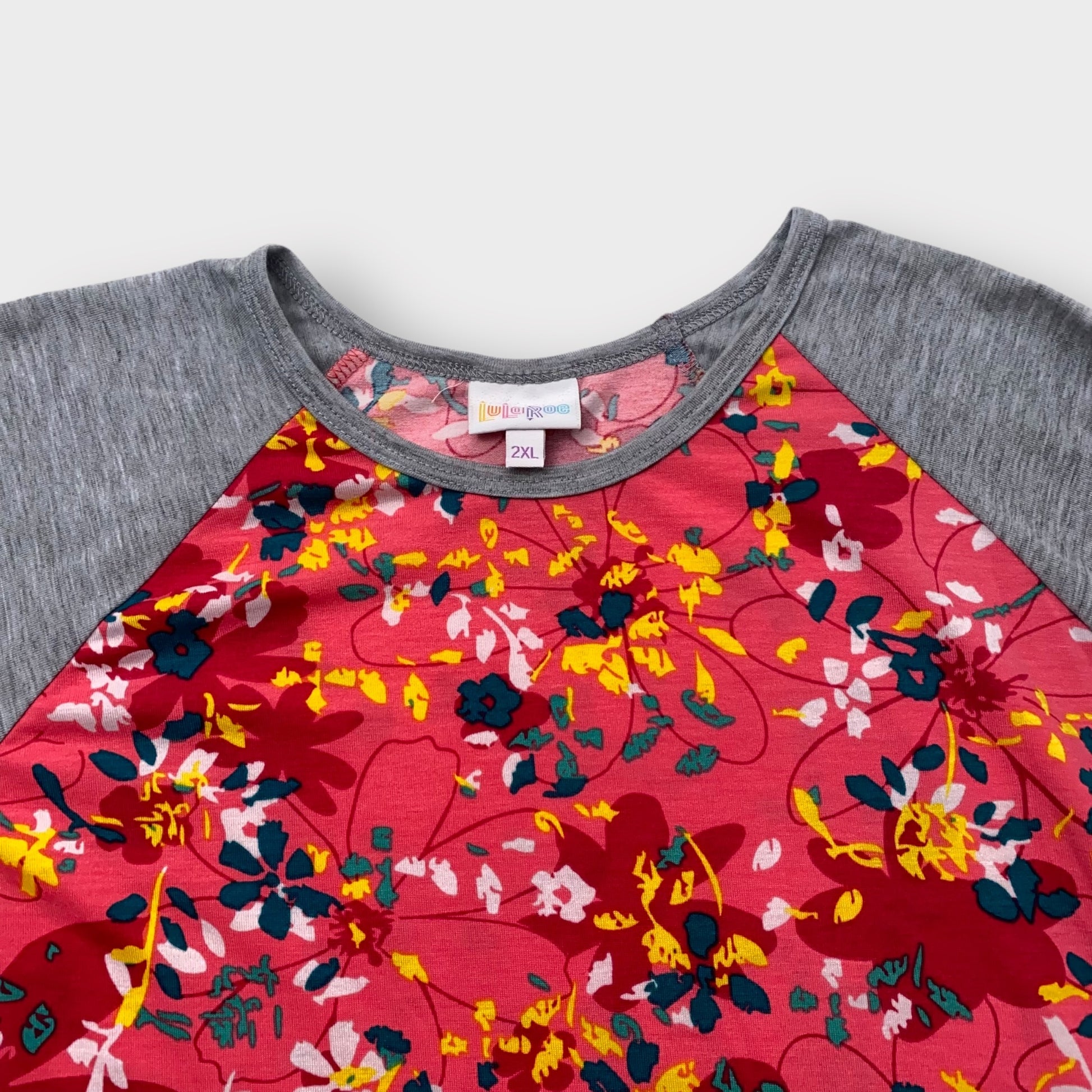 LuLaRoe Randy Baseball Tee 2XL (20-22) - Red/Pink/Yellow Floral Print with Heather Gray Sleeves - Soft Stretch Fabric