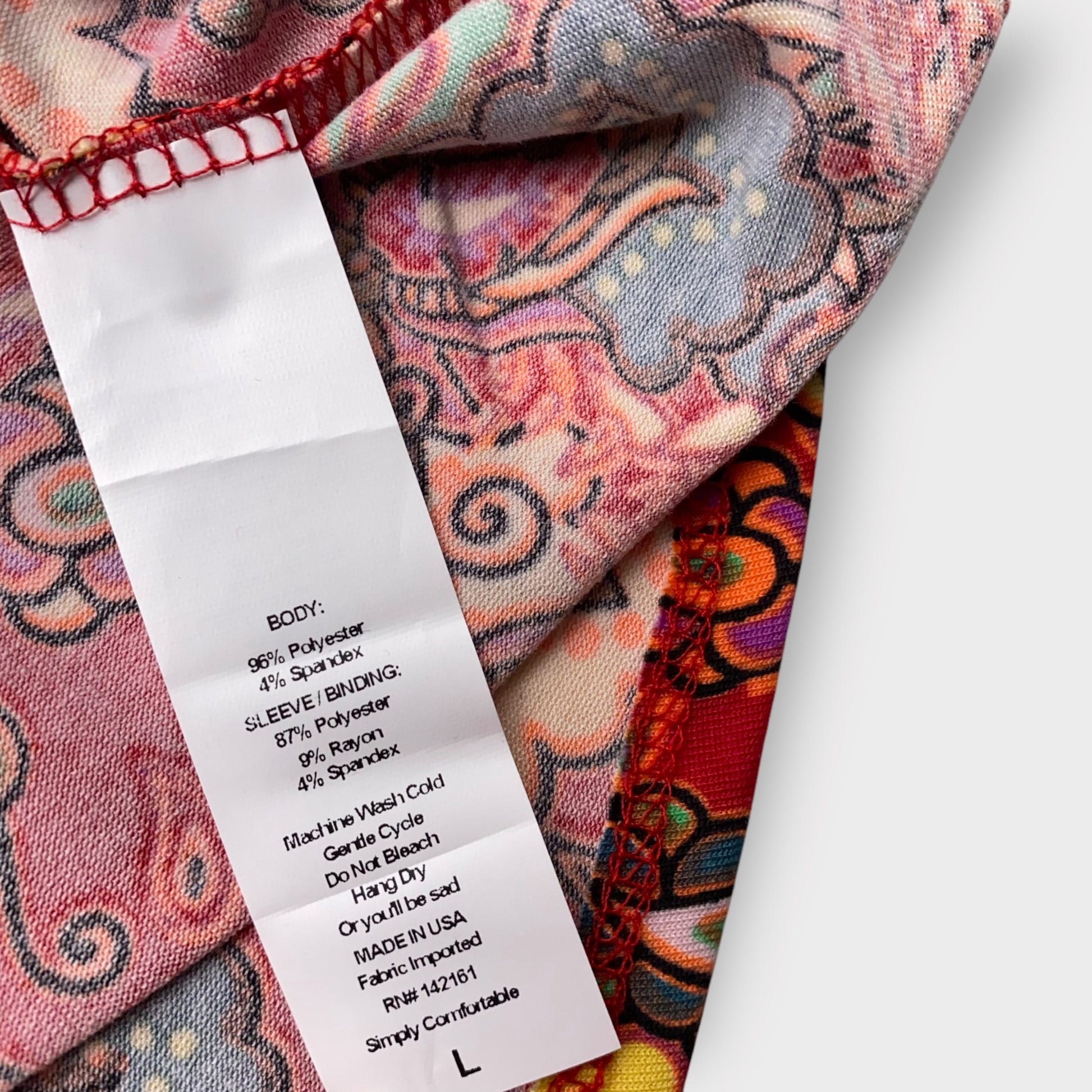 LuLaRoe Randy Baseball Tee L (12-14) - Red/Yellow Paisley Floral Print with Charcoal Gray Sleeves - Soft Stretch Fabric