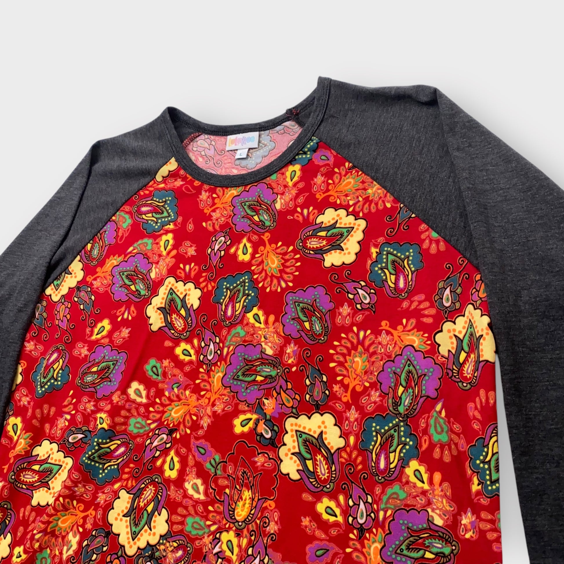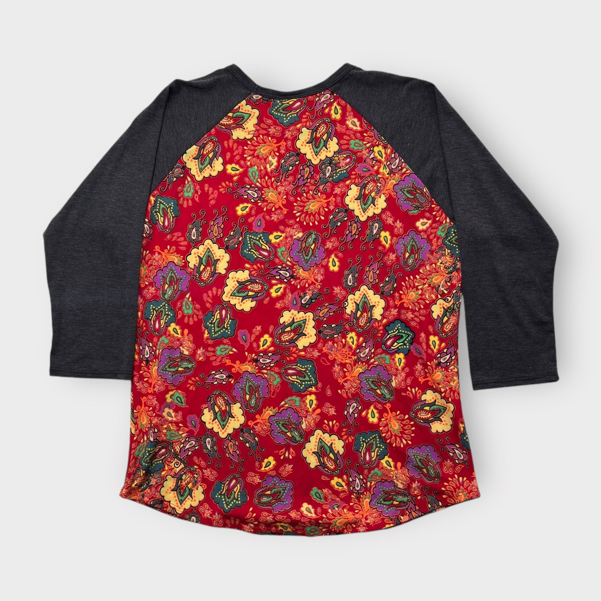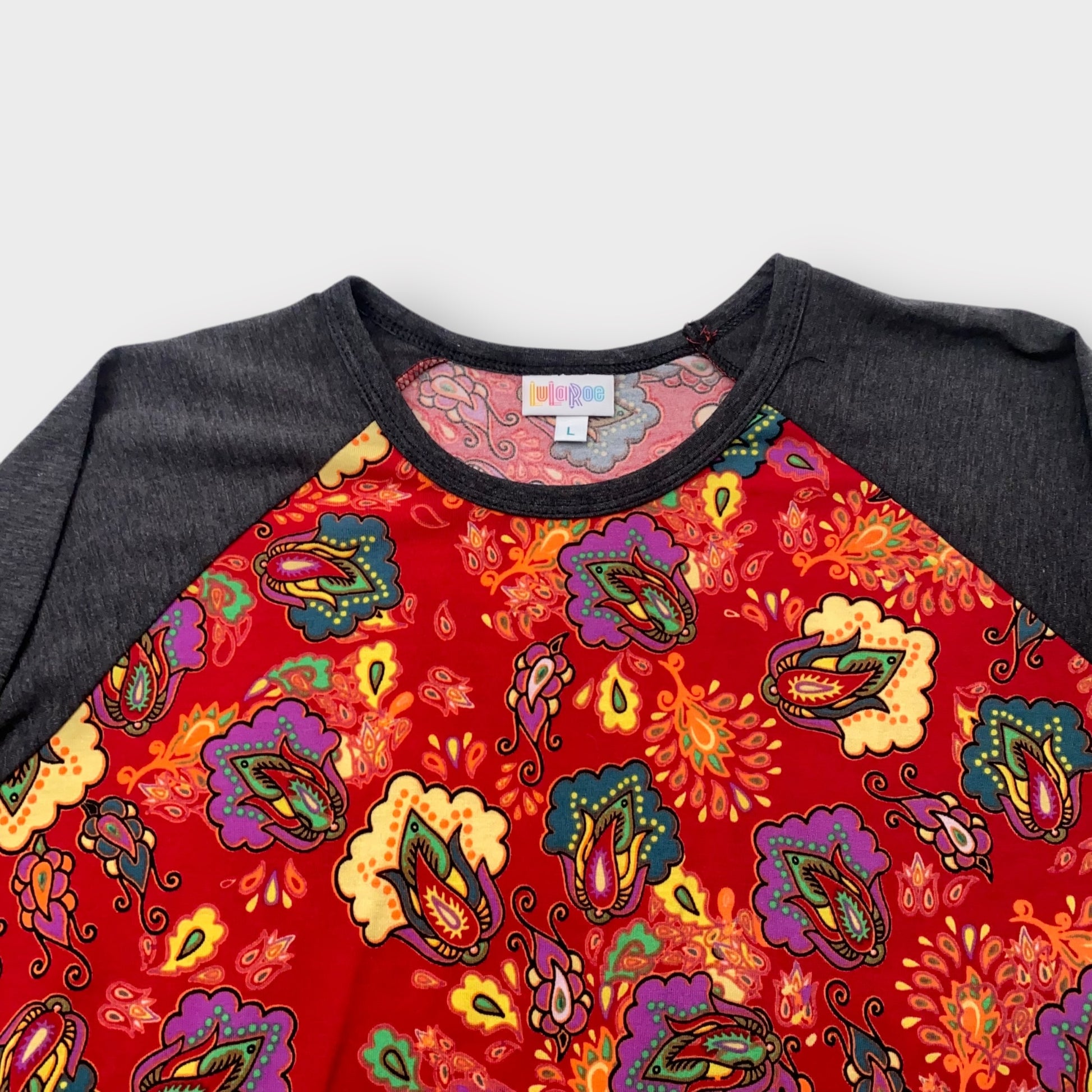 LuLaRoe Randy Baseball Tee - L (12-14) - Red/Yellow Paisley Floral with Charcoal Gray Sleeves