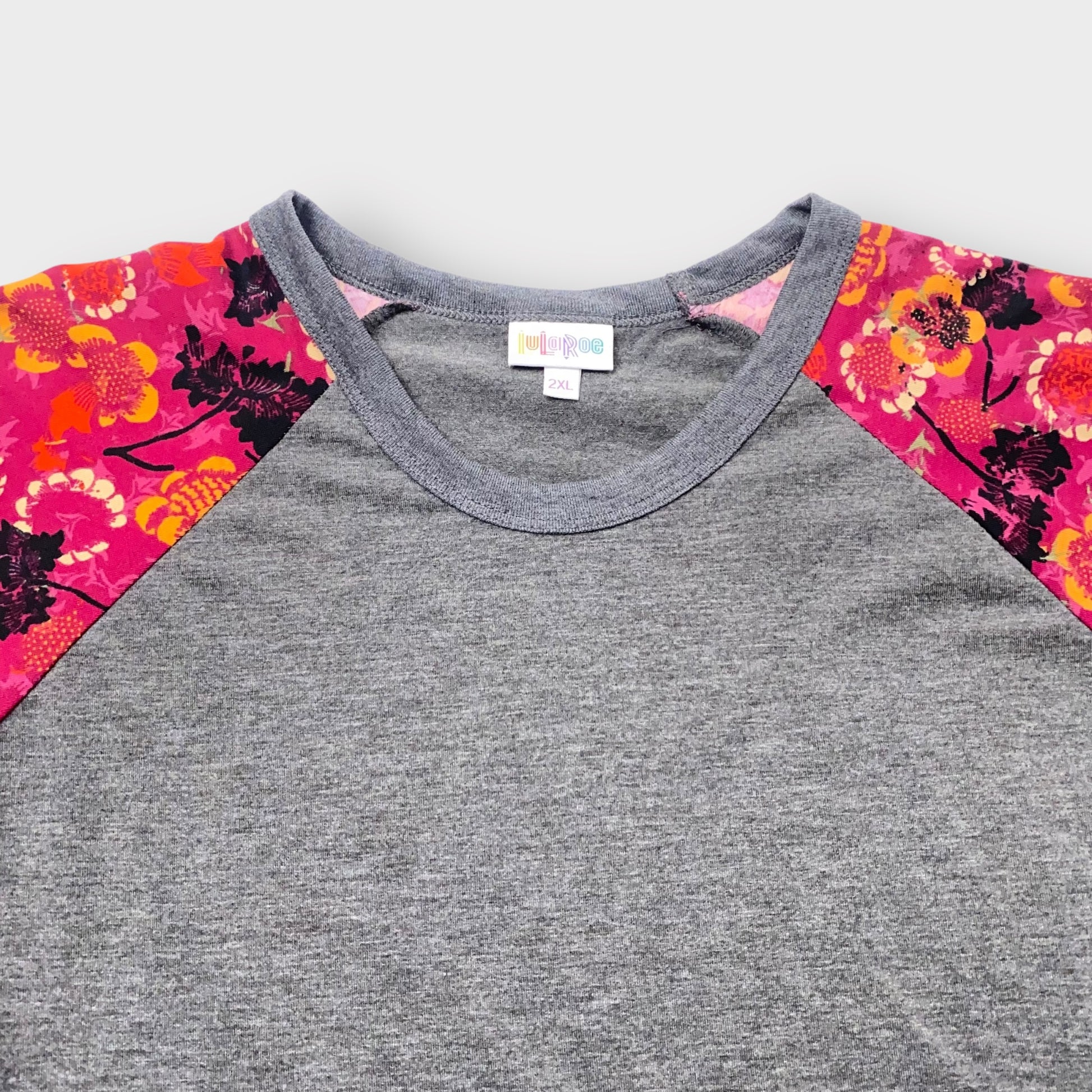 LuLaRoe Randy Raglan T-Shirt 2XL (20-22) - Charcoal Gray with Red/Yellow Floral Sleeves - Soft Stretch Fabric