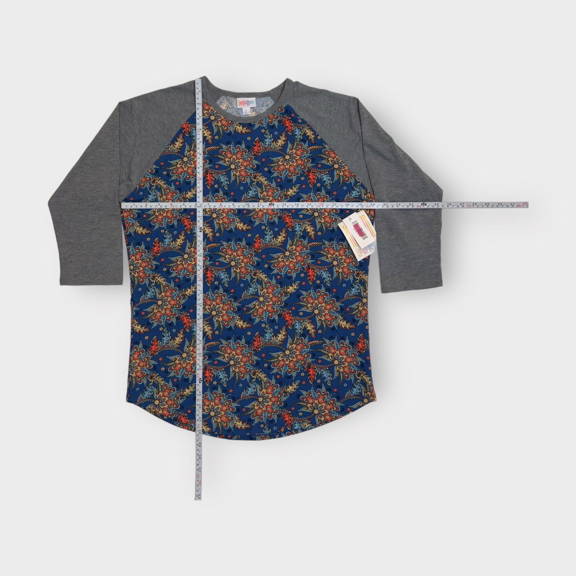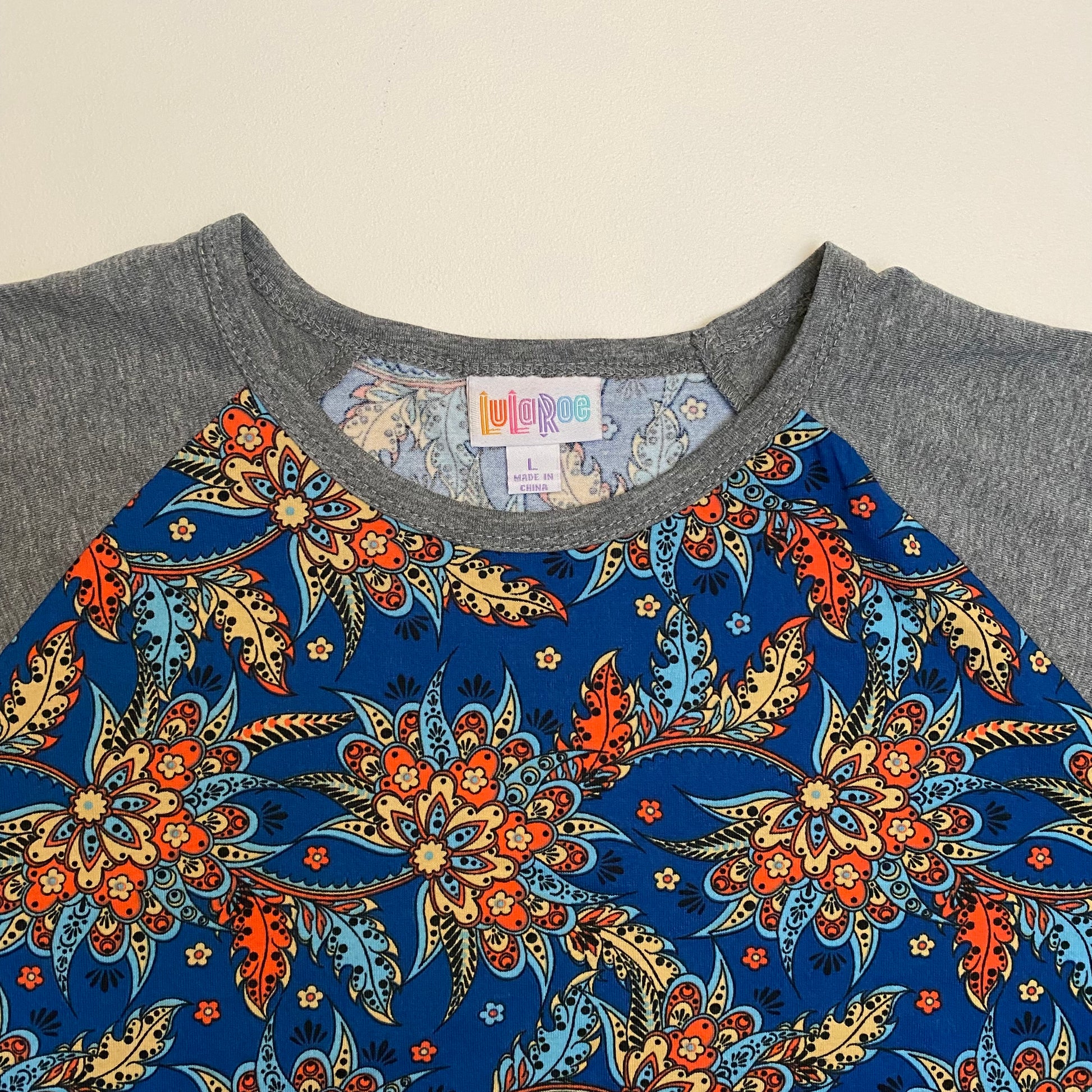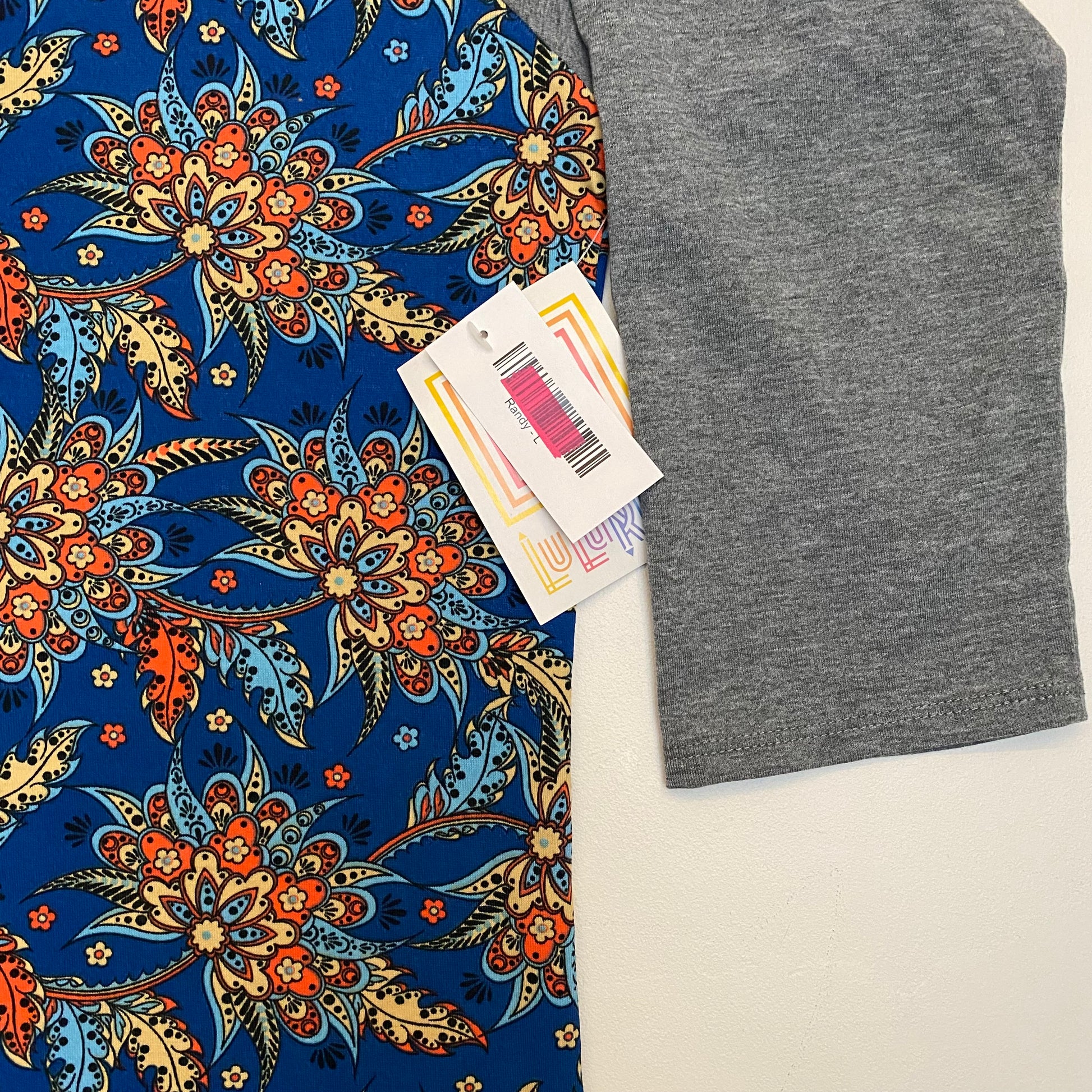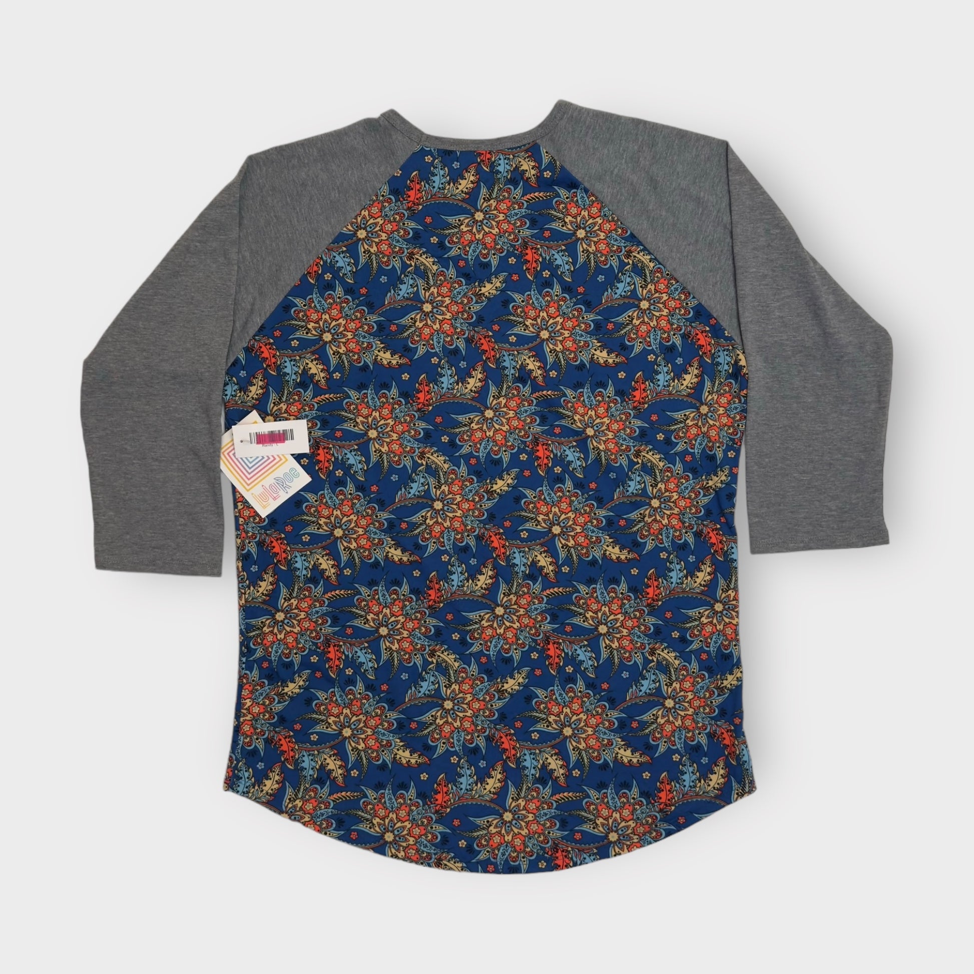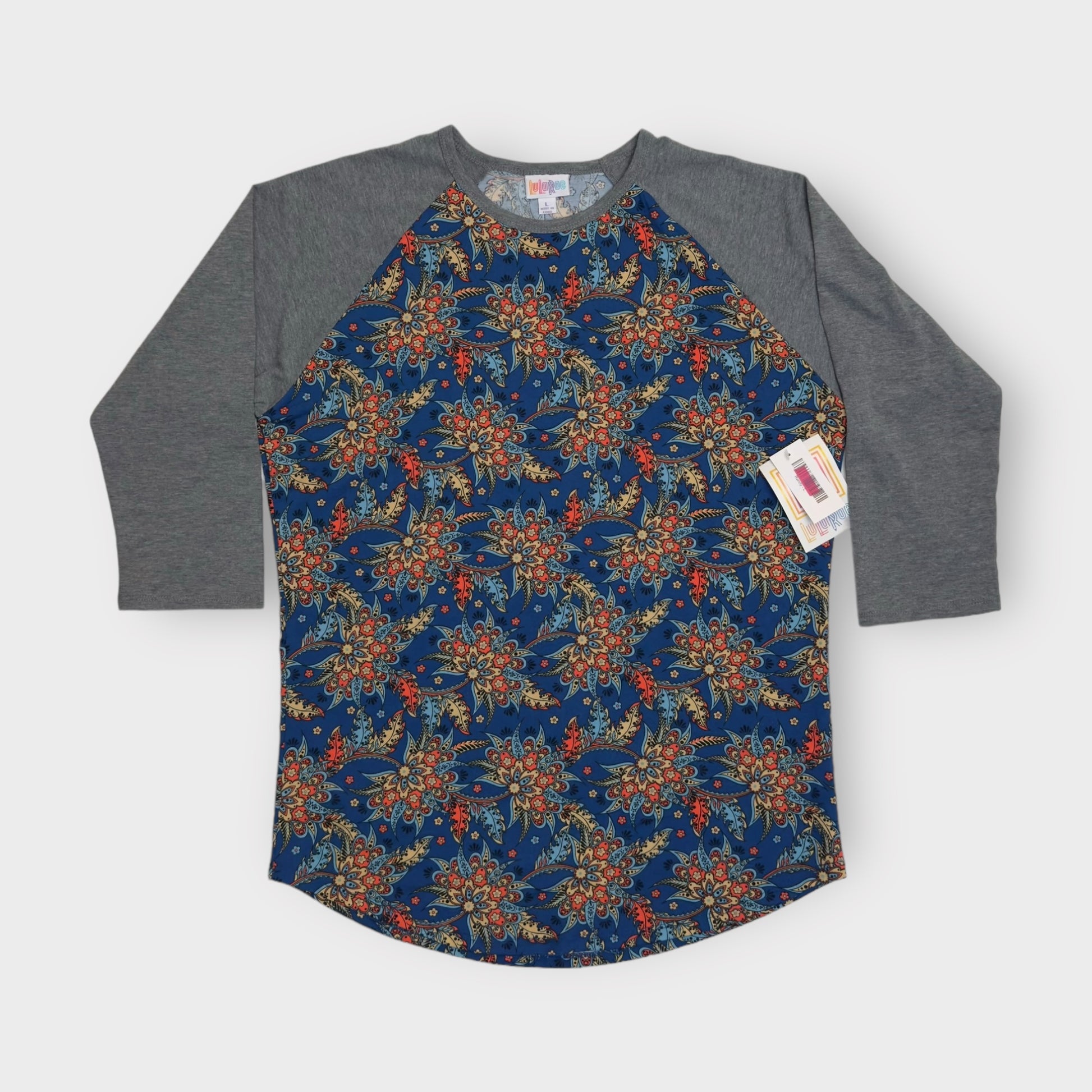 LuLaRoe Randy Raglan Tee | L | Gray/Blue Botanical | Colorblock | NWT