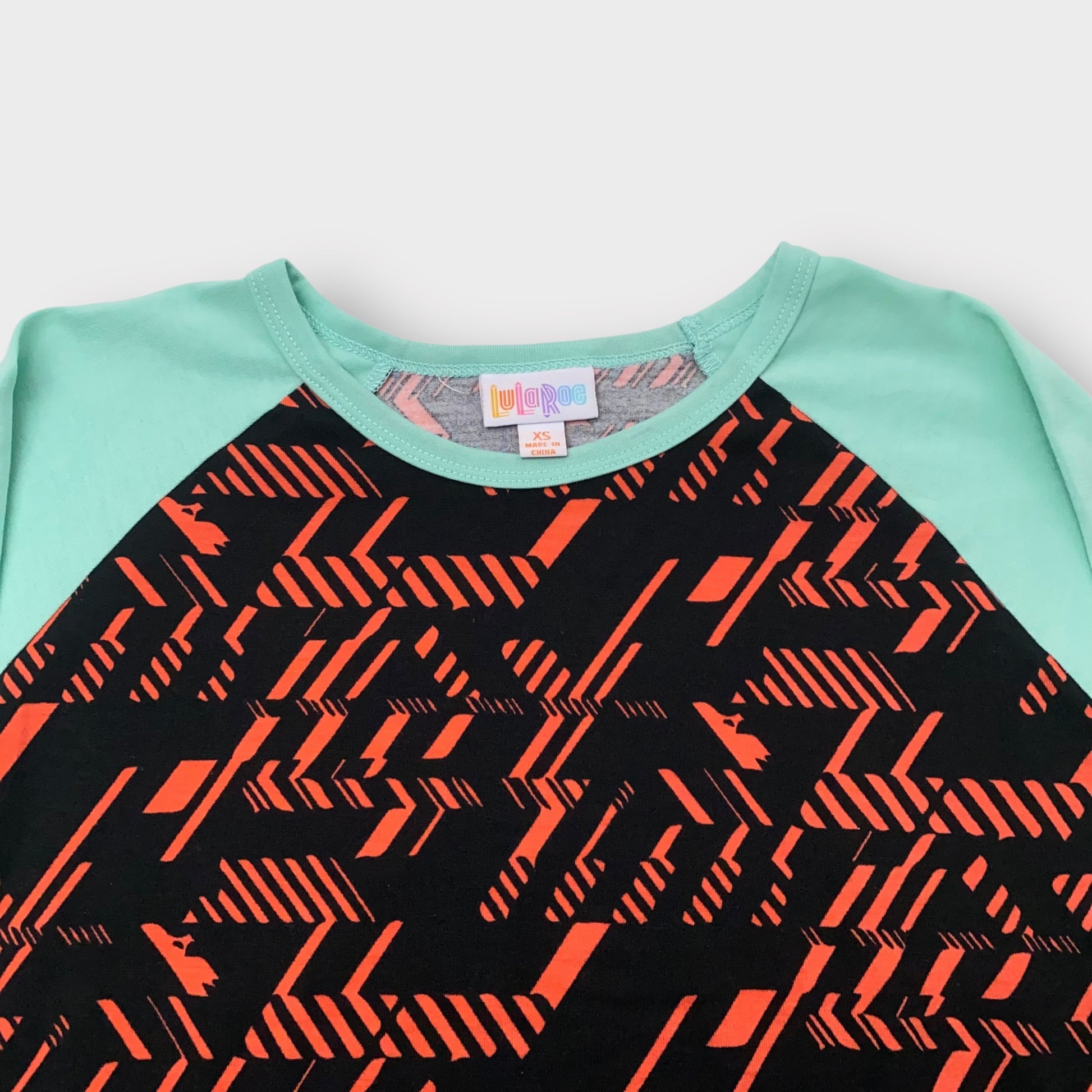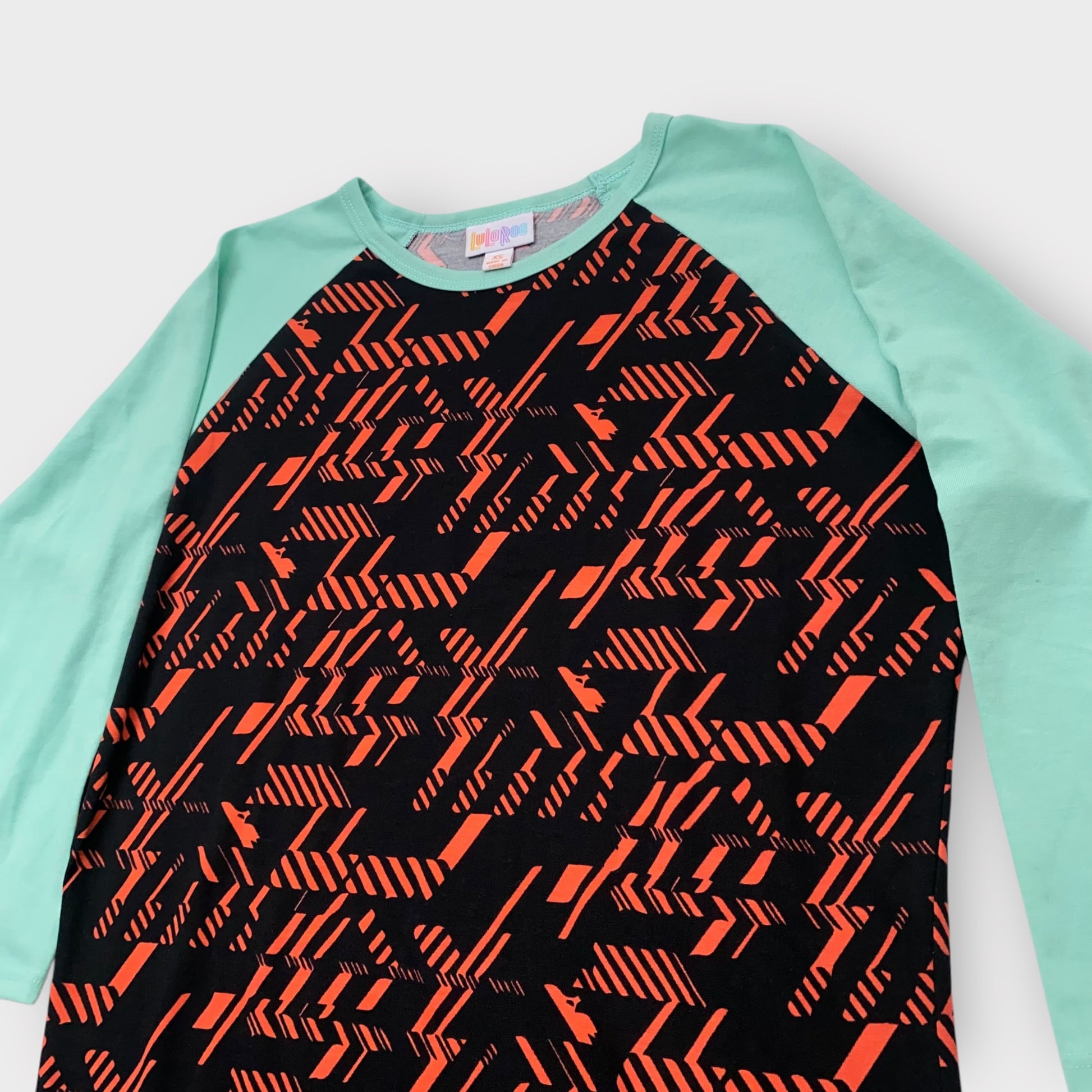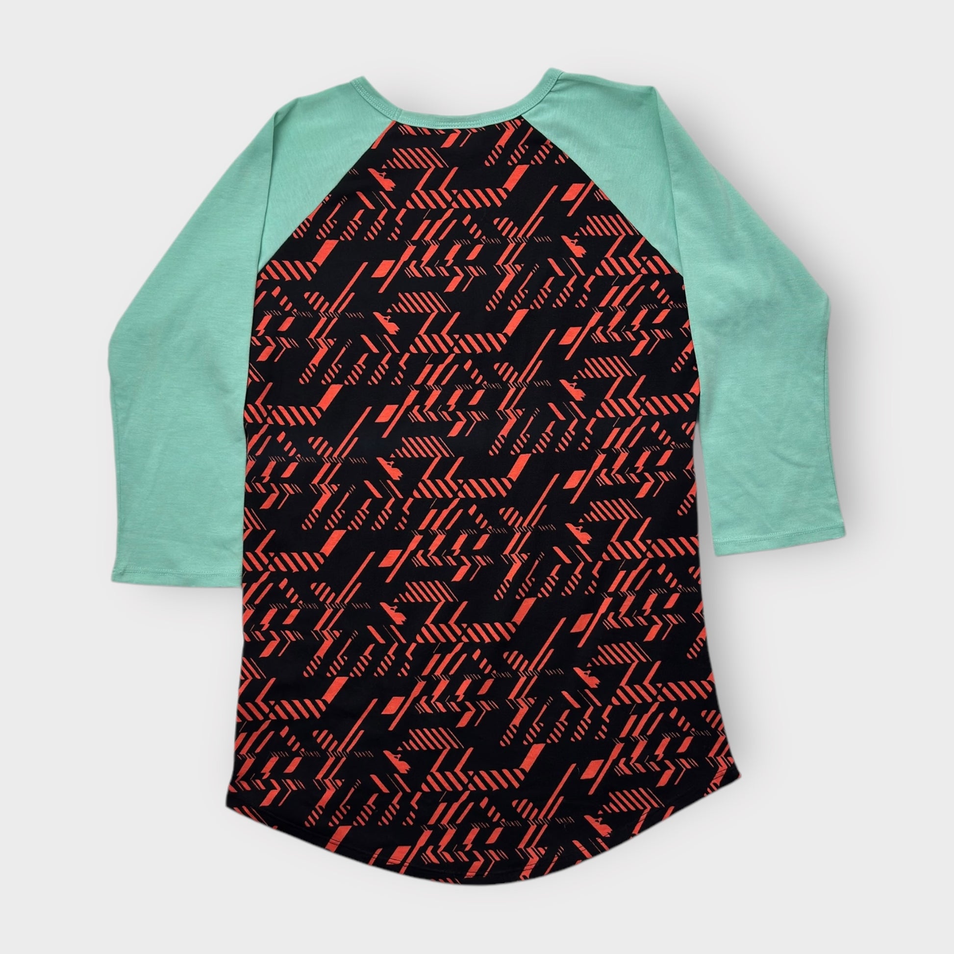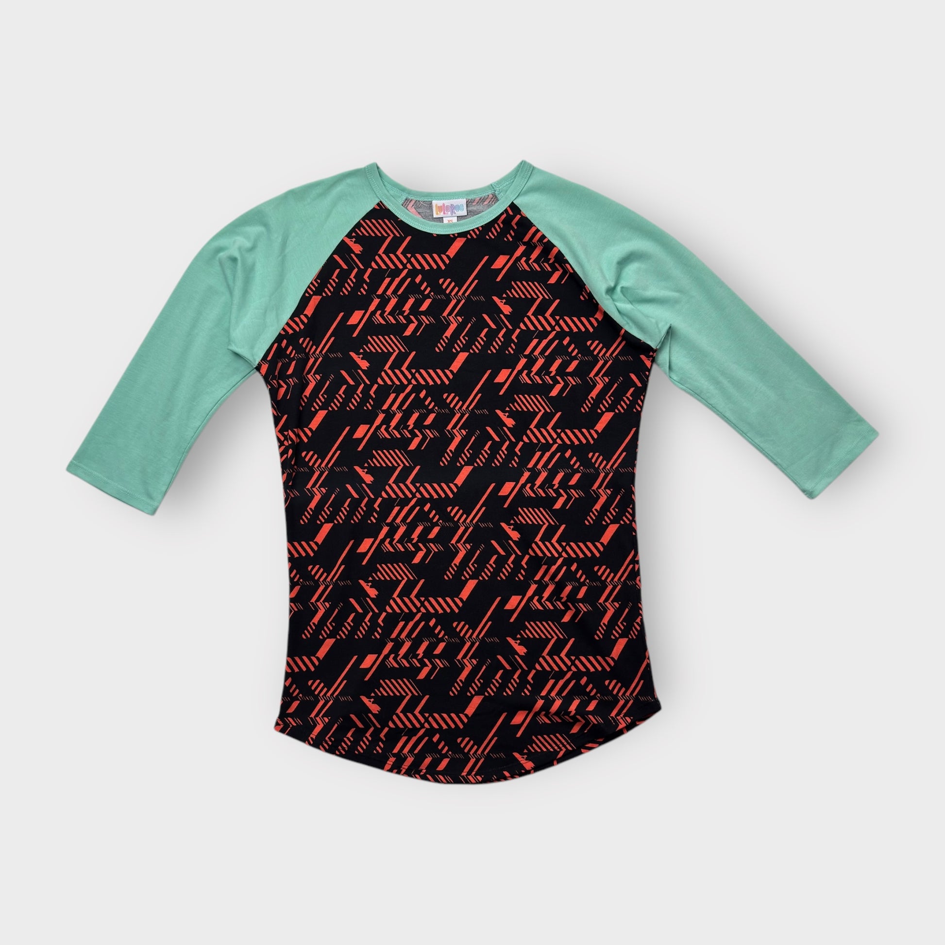 LuLaRoe Randy Raglan Tee - XS (0-2) - Black/Red Geometric Abstract Print with Mint Green Sleeves