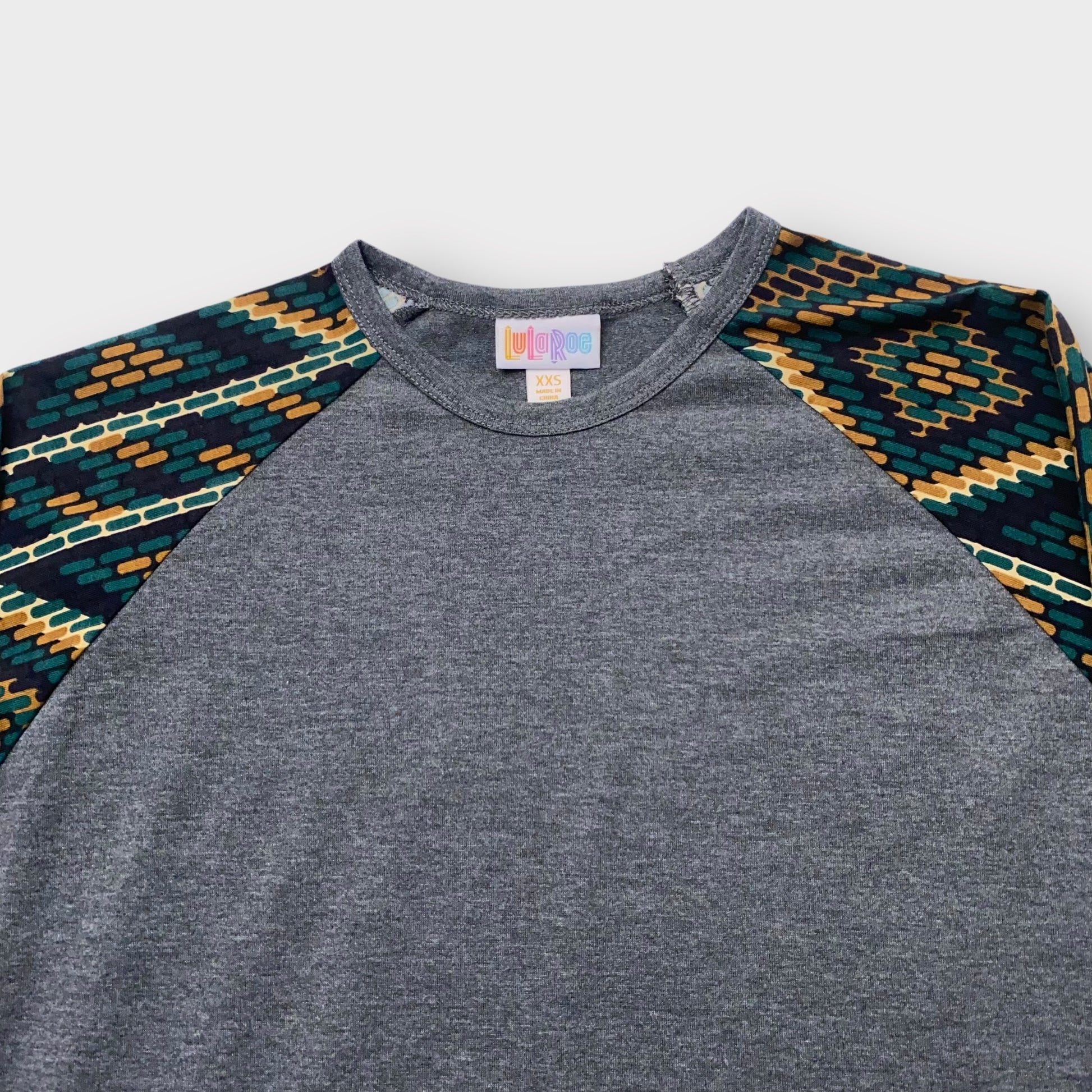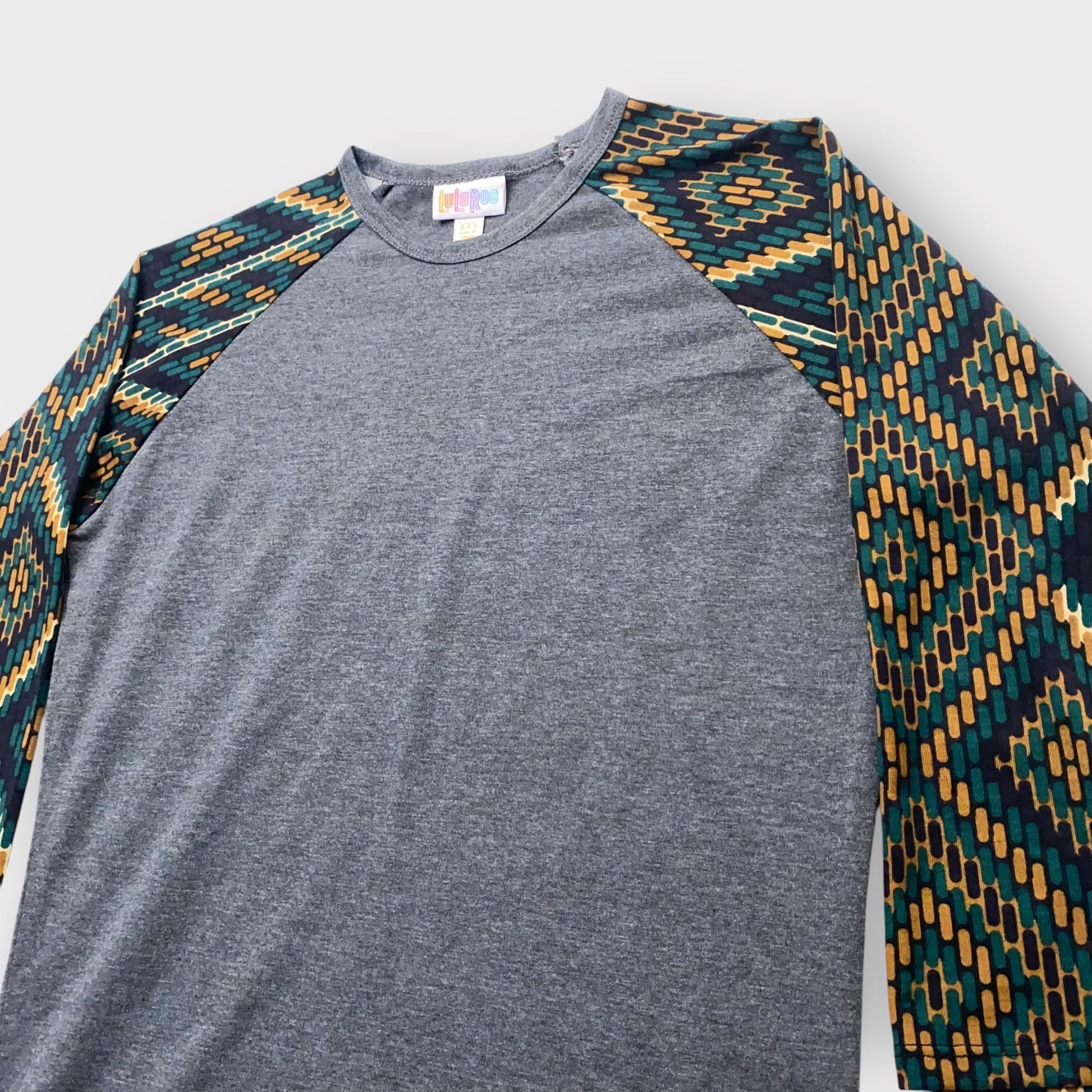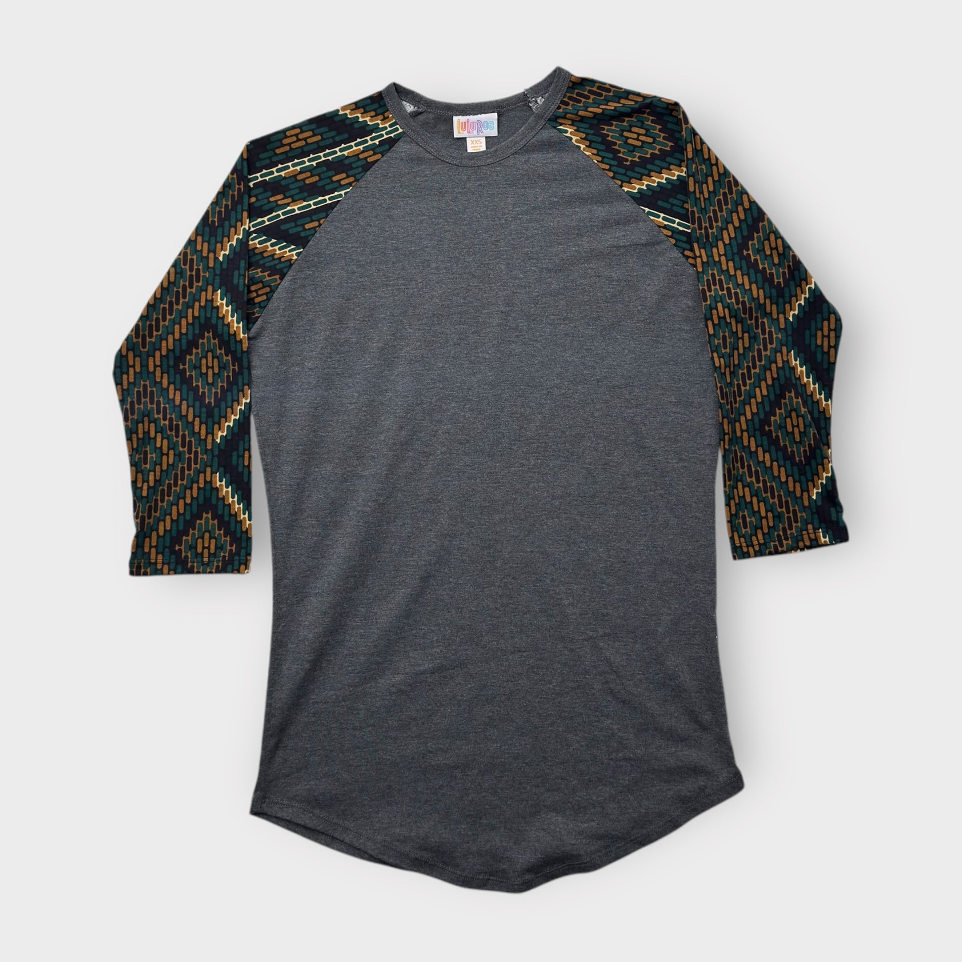 LuLaRoe Randy Raglan Tee XXS (00) - Charcoal Gray with Green/Gold/Black Aztec Geometric Sleeves - Soft Stretch Fabric