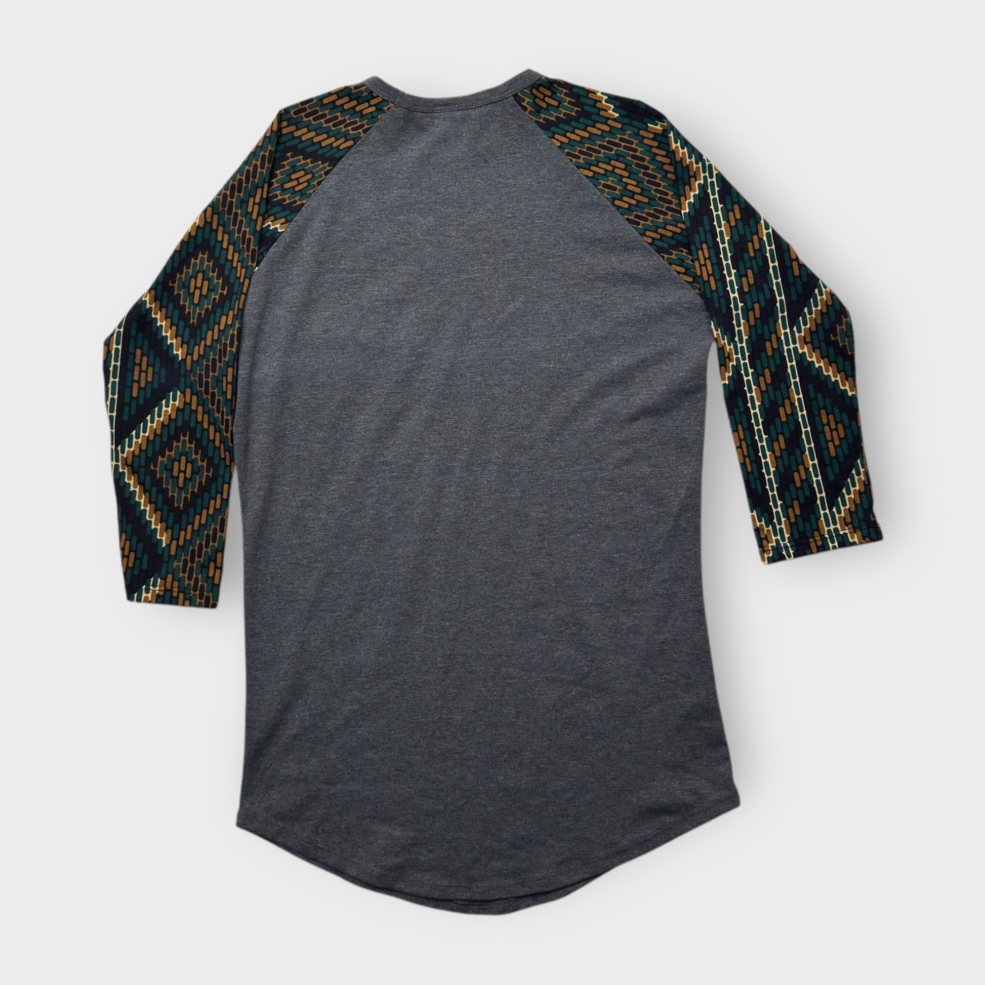 LuLaRoe Randy Raglan Tee - XXS (00) - Charcoal Gray with Green/Gold/Black Aztec Geometric Sleeves