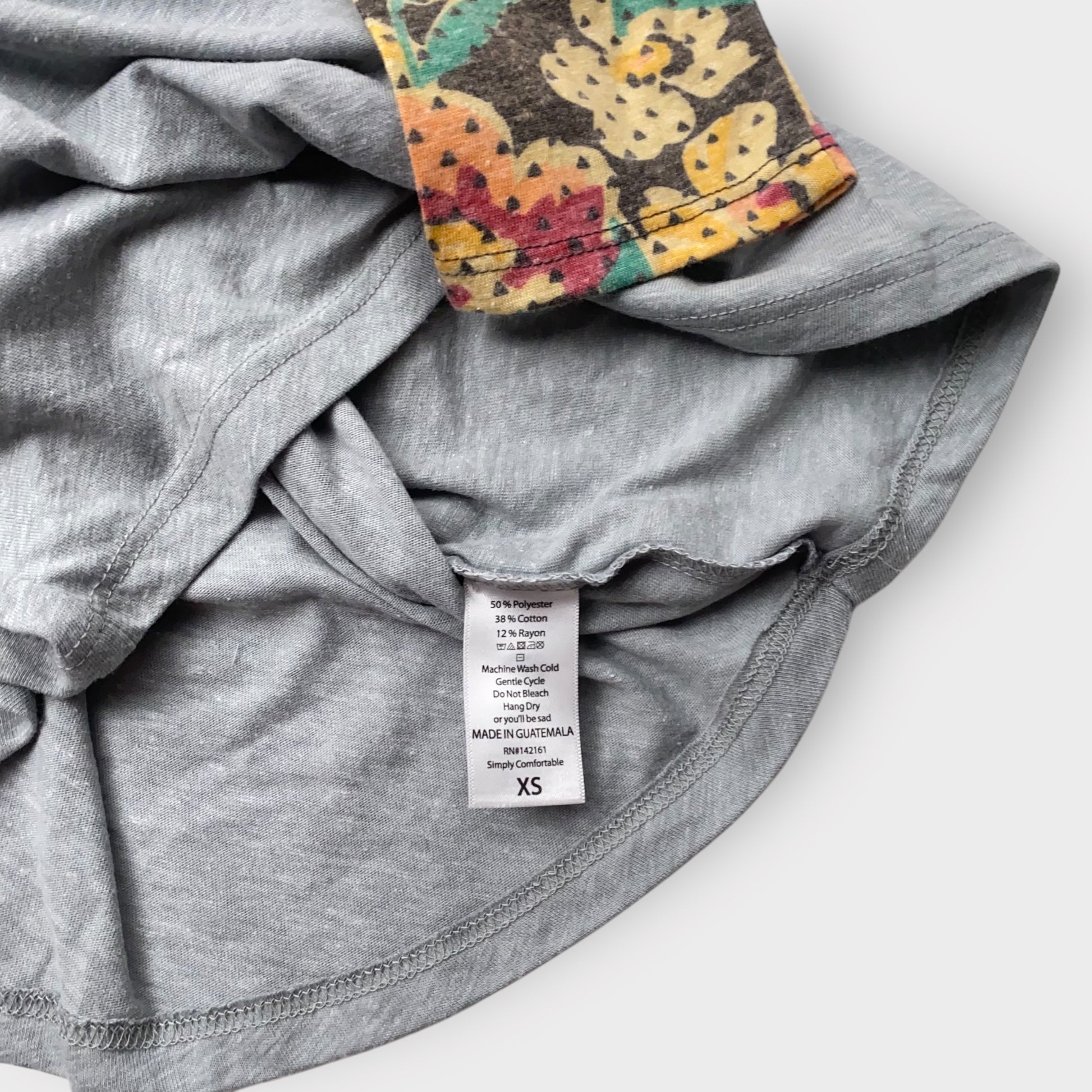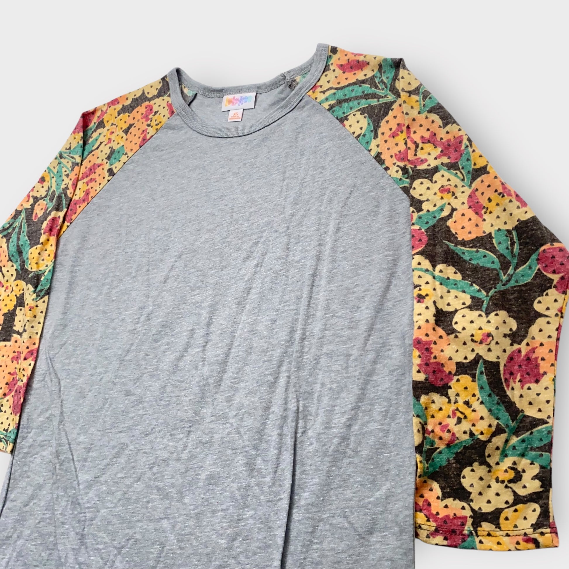 LuLaRoe Randy T-Shirt XS (0-2) - Heather Gray with Yellow/Orange Floral Sleeves - Soft Cotton Rayon Blend