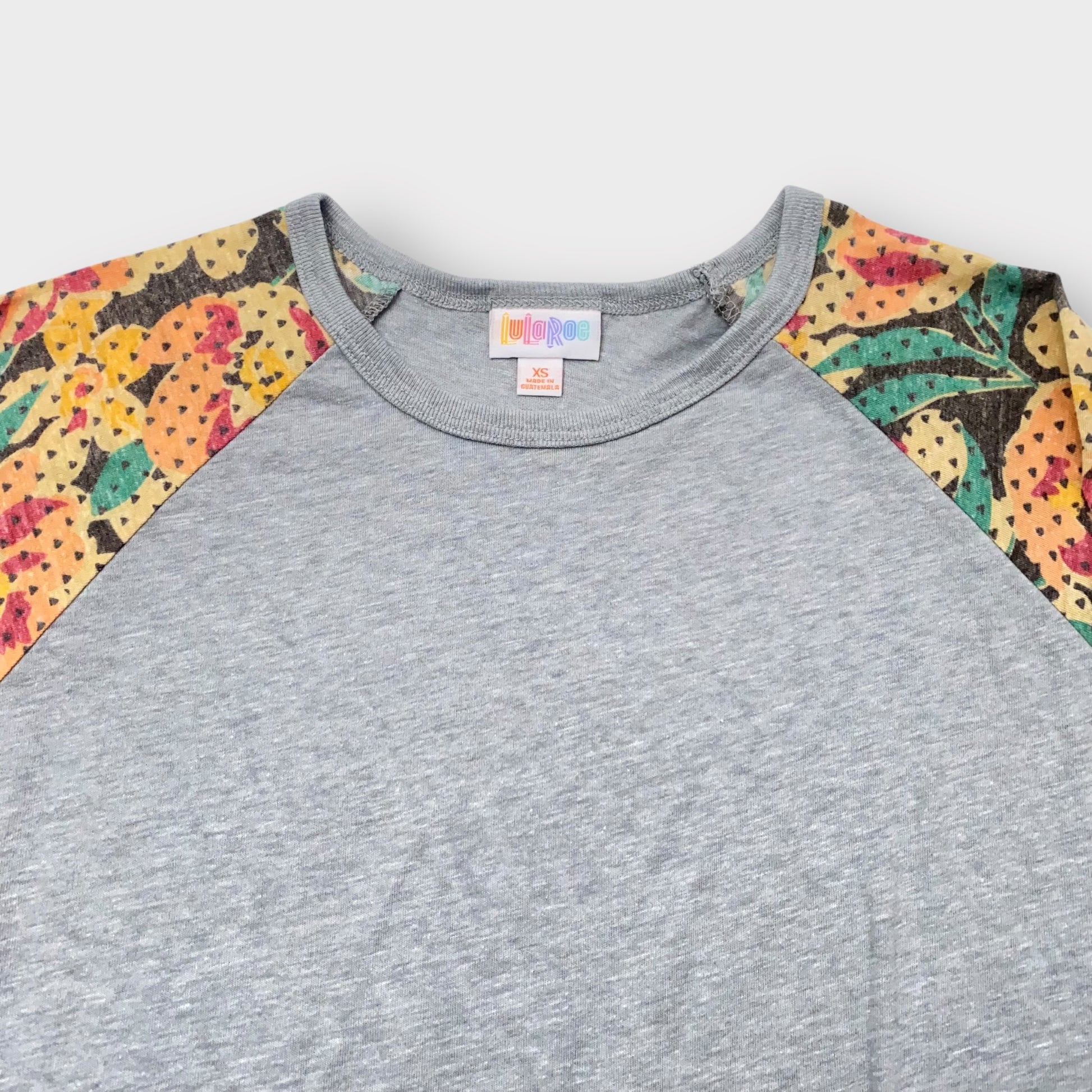 LuLaRoe Randy T-Shirt - XS (0-2) - Heather Gray with Yellow/Orange Floral Sleeves
