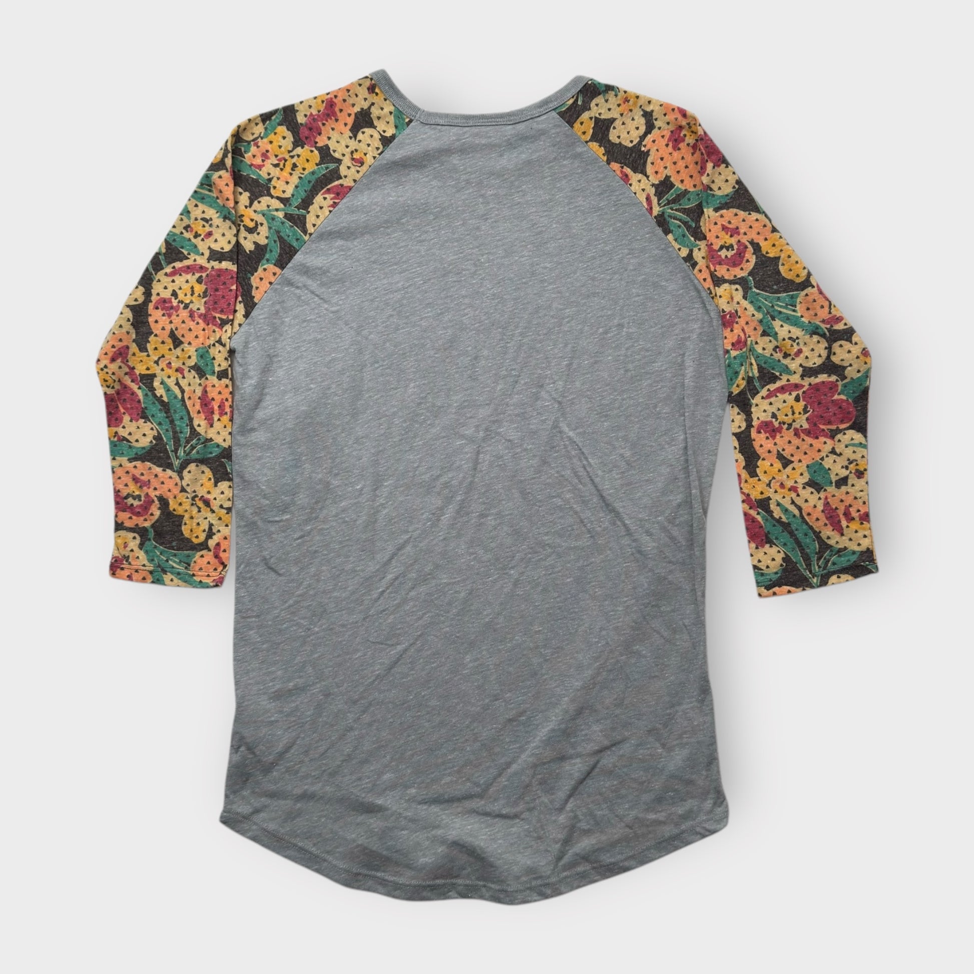 - Chic Floral Design: Bright yellow and orange floral-patterned raglan sleeves add a pop of color to the classic heather gray body.