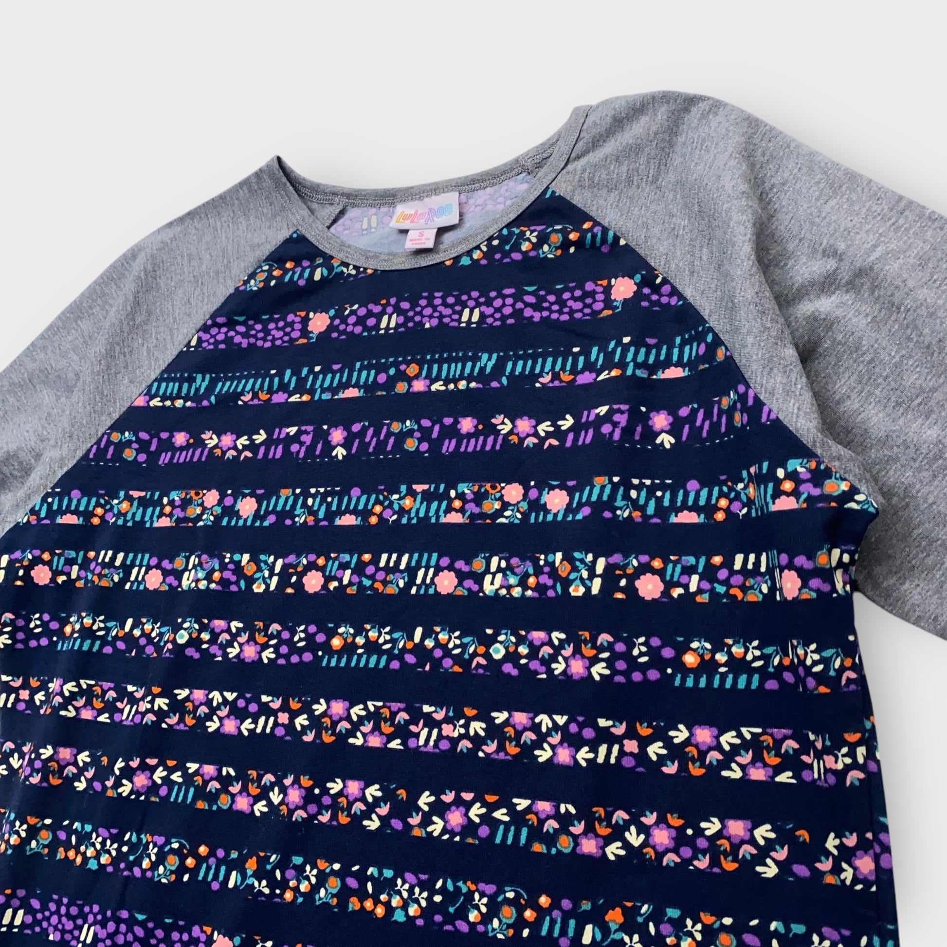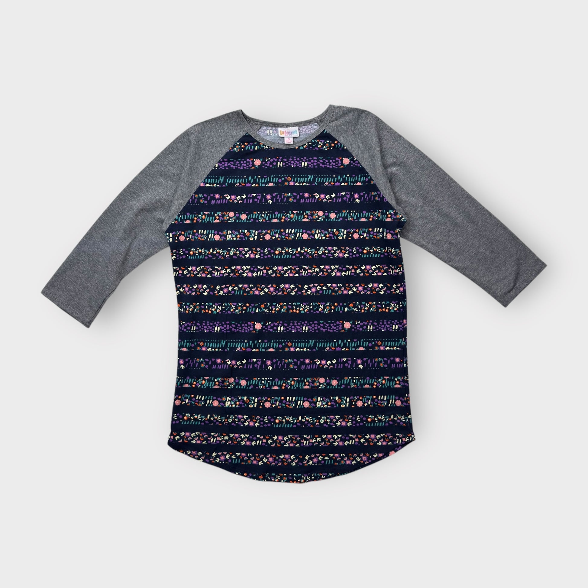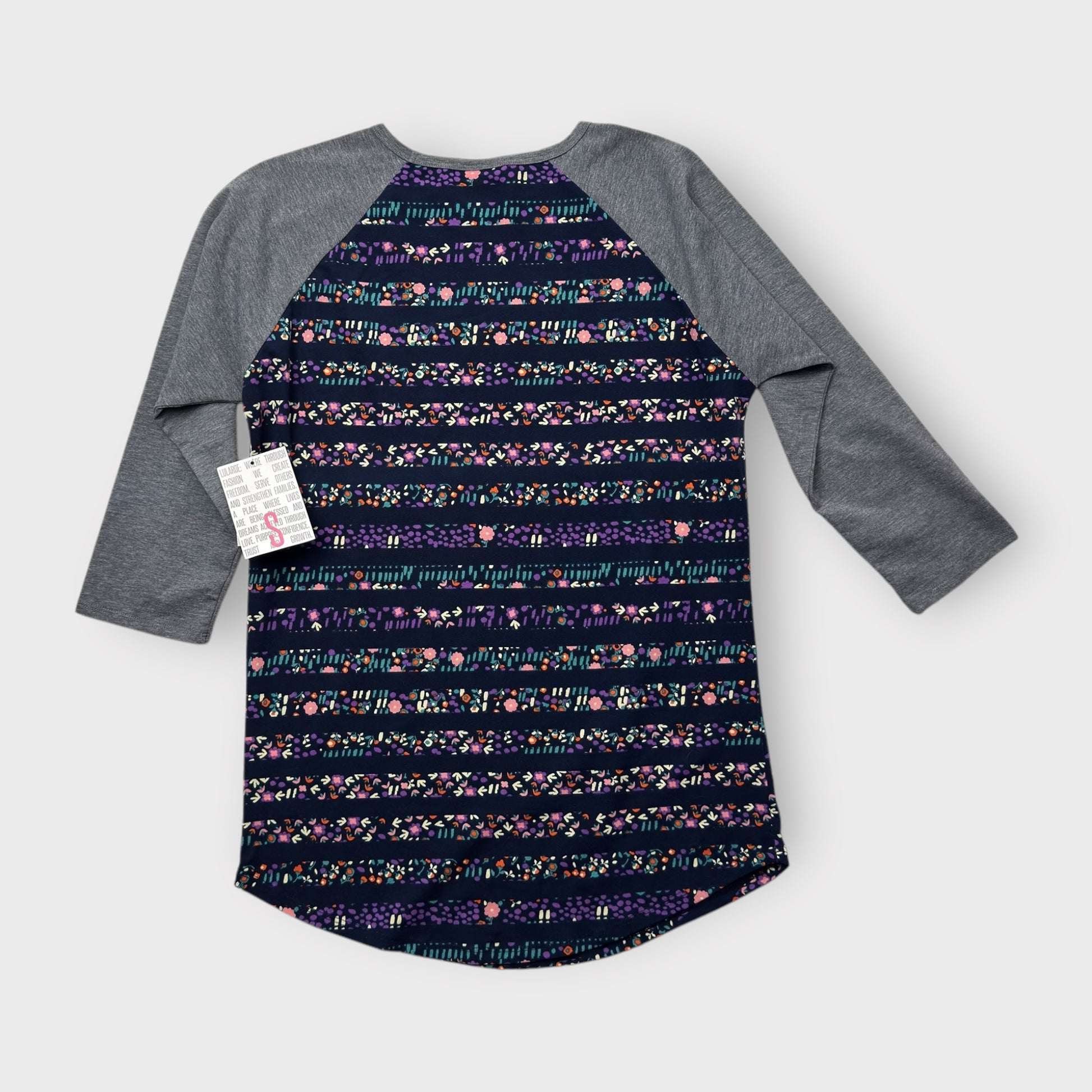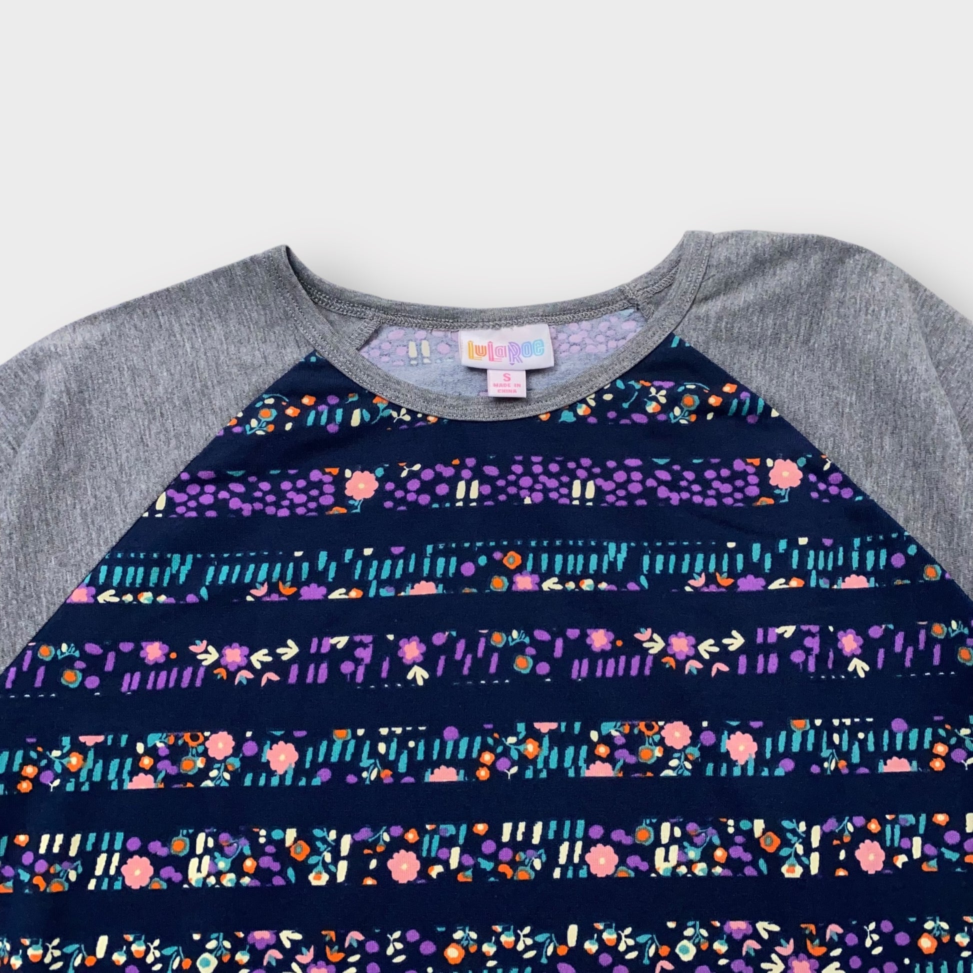 LuLaRoe Randy Tee - S (4-6) - Navy and Multicolor Floral Striped Print with Gray Raglan Sleeves
