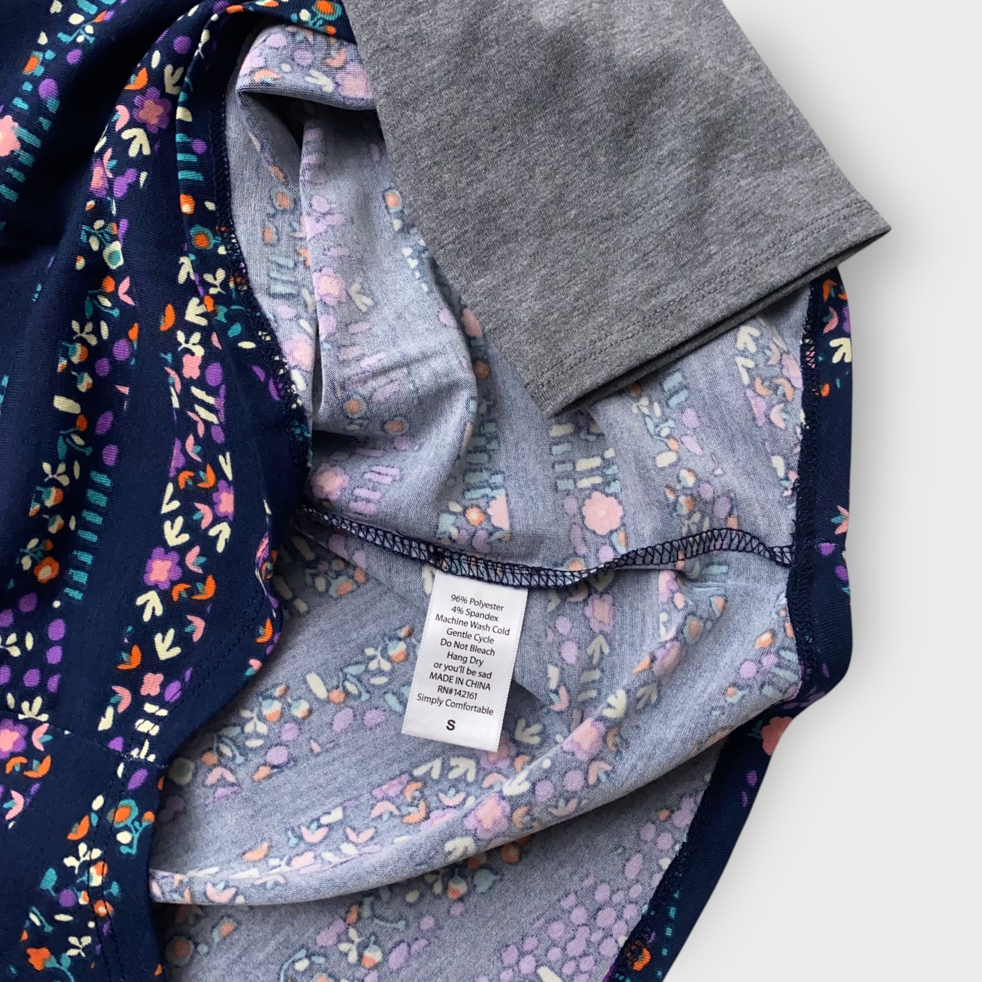 LuLaRoe Randy Tee S (4-6) - Navy and Multicolor Floral Striped Print with Gray Raglan Sleeves - Soft Stretch Polyester Spandex