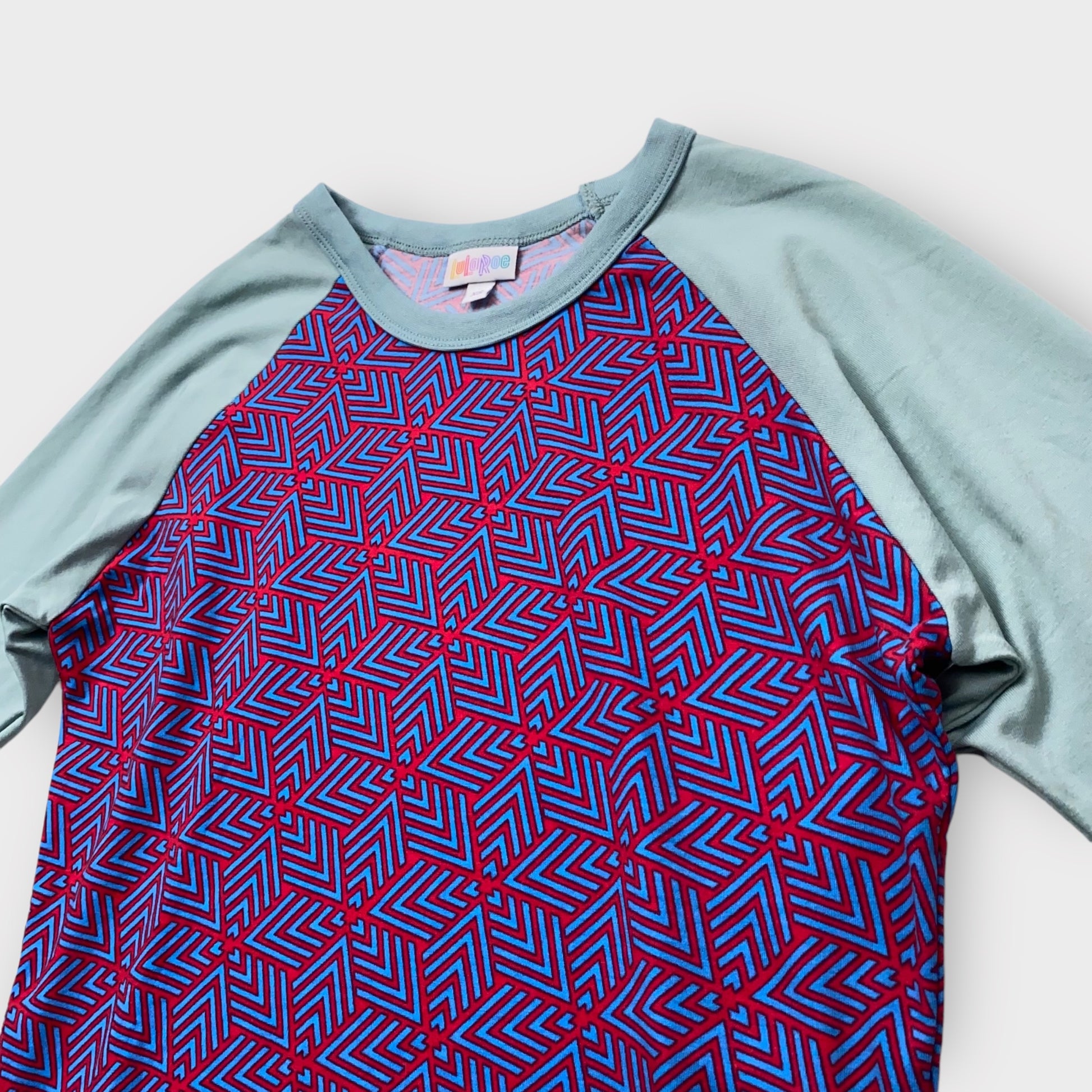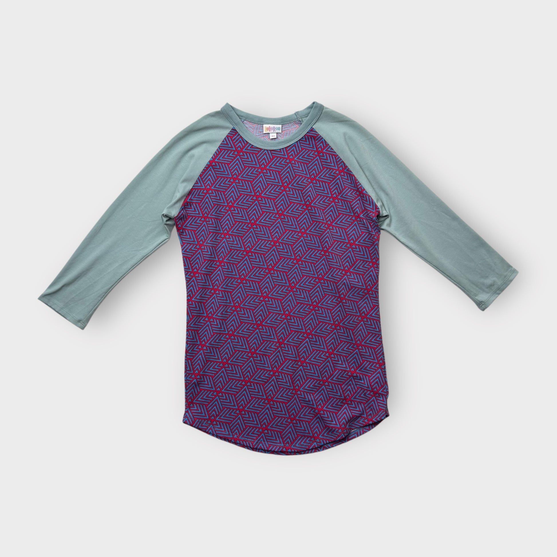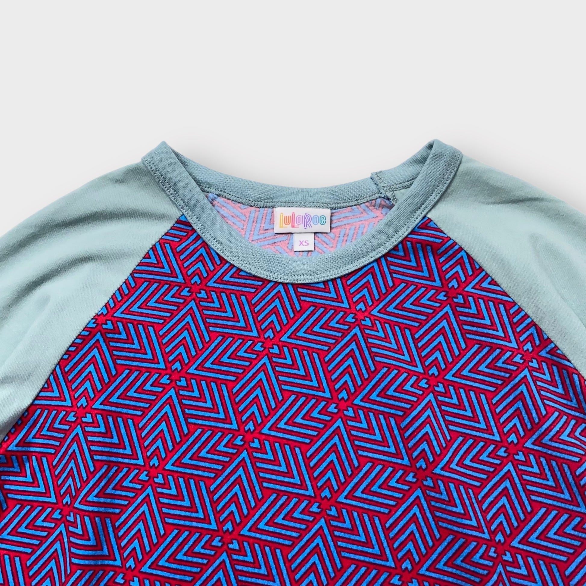 LuLaRoe Randy Tee - XS (0-2) - Burgundy & Blue Geometric Print with Sage Green Raglan Sleeves