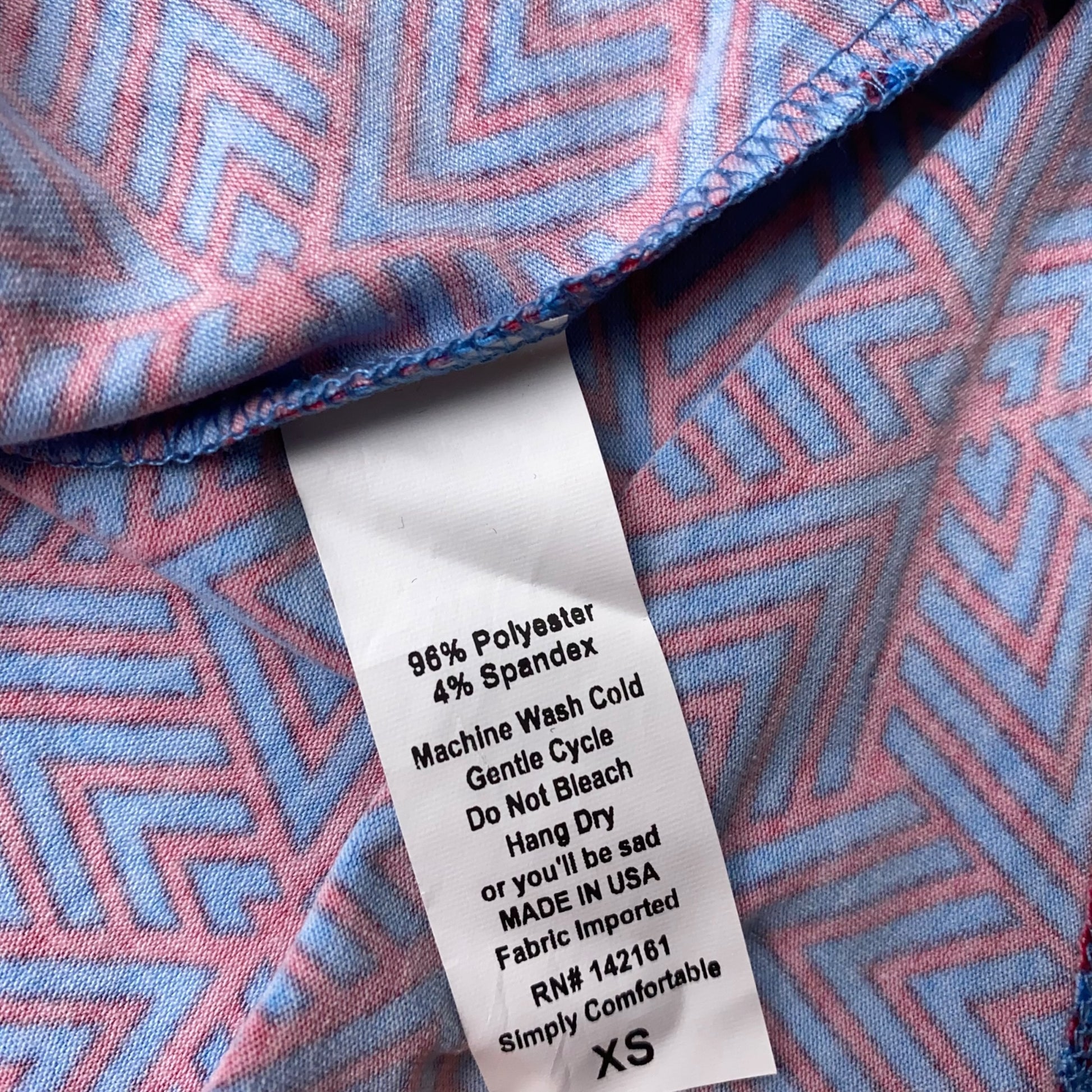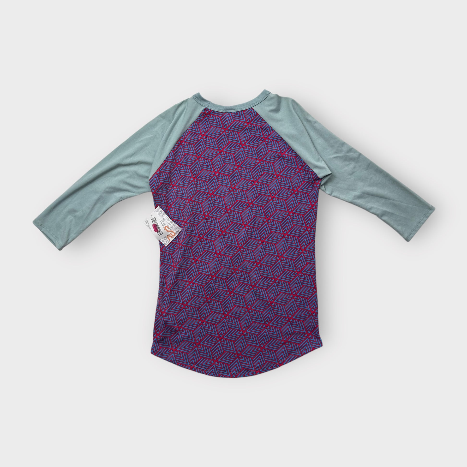 LuLaRoe Randy Tee XS (0-2) - Burgundy & Blue Geometric Print with Sage Green Raglan Sleeves - Soft Stretch Polyester Spandex