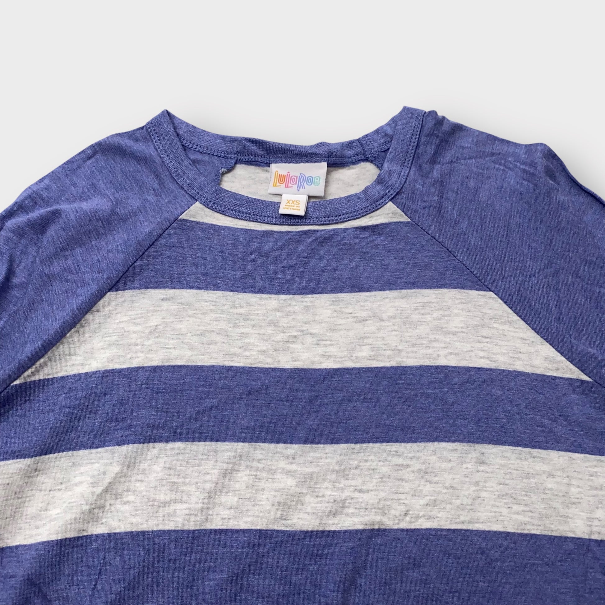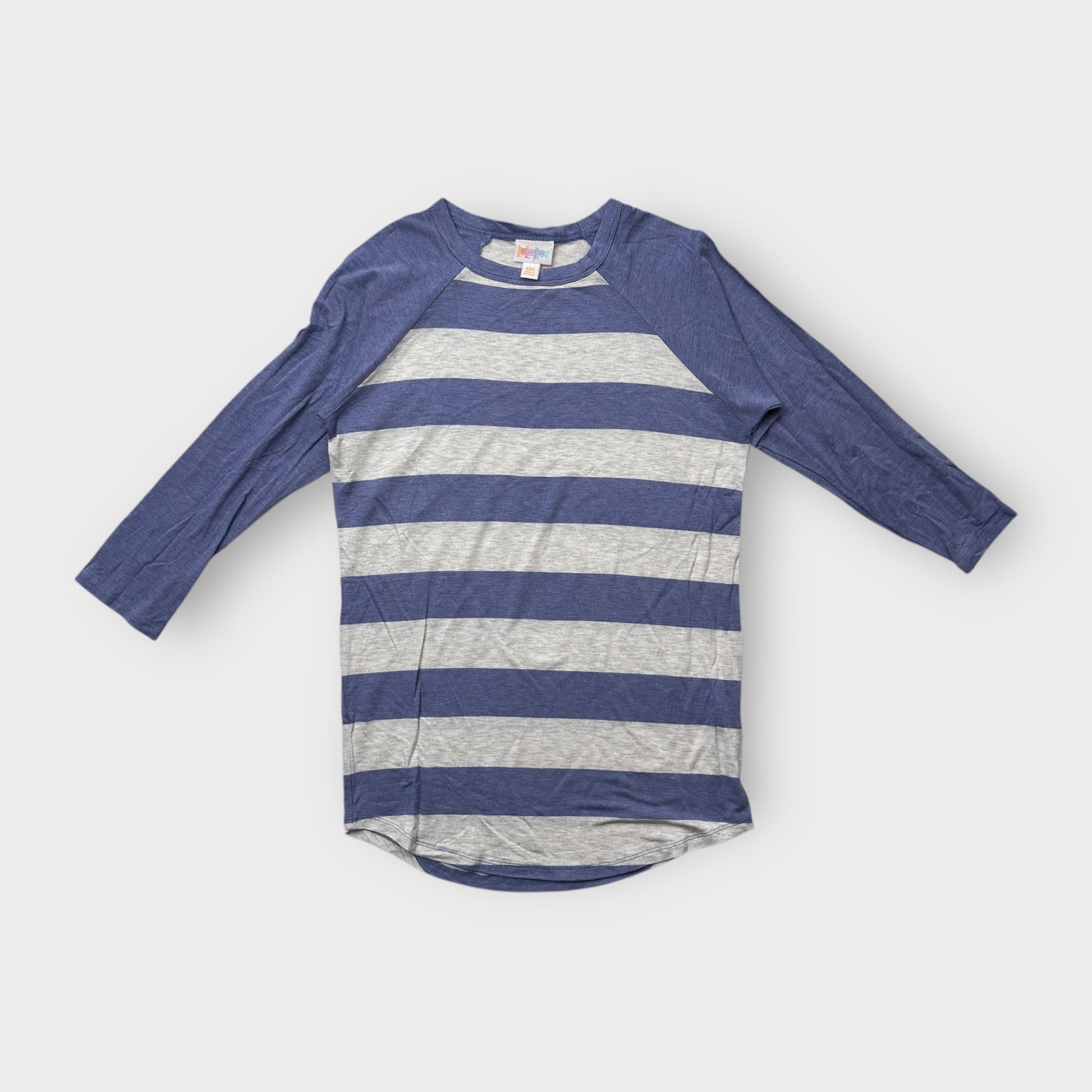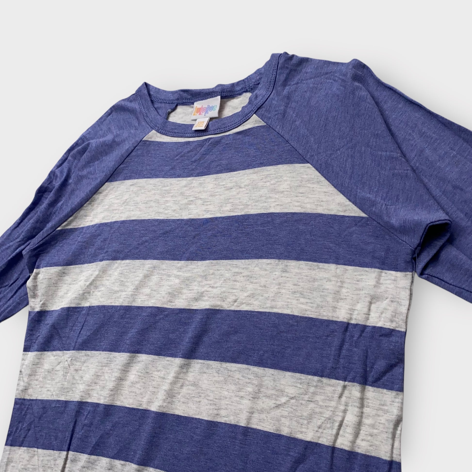 LuLaRoe Randy Tee XXS (00) - Blue and Gray Striped Raglan - Soft Stretch Rayon Spandex