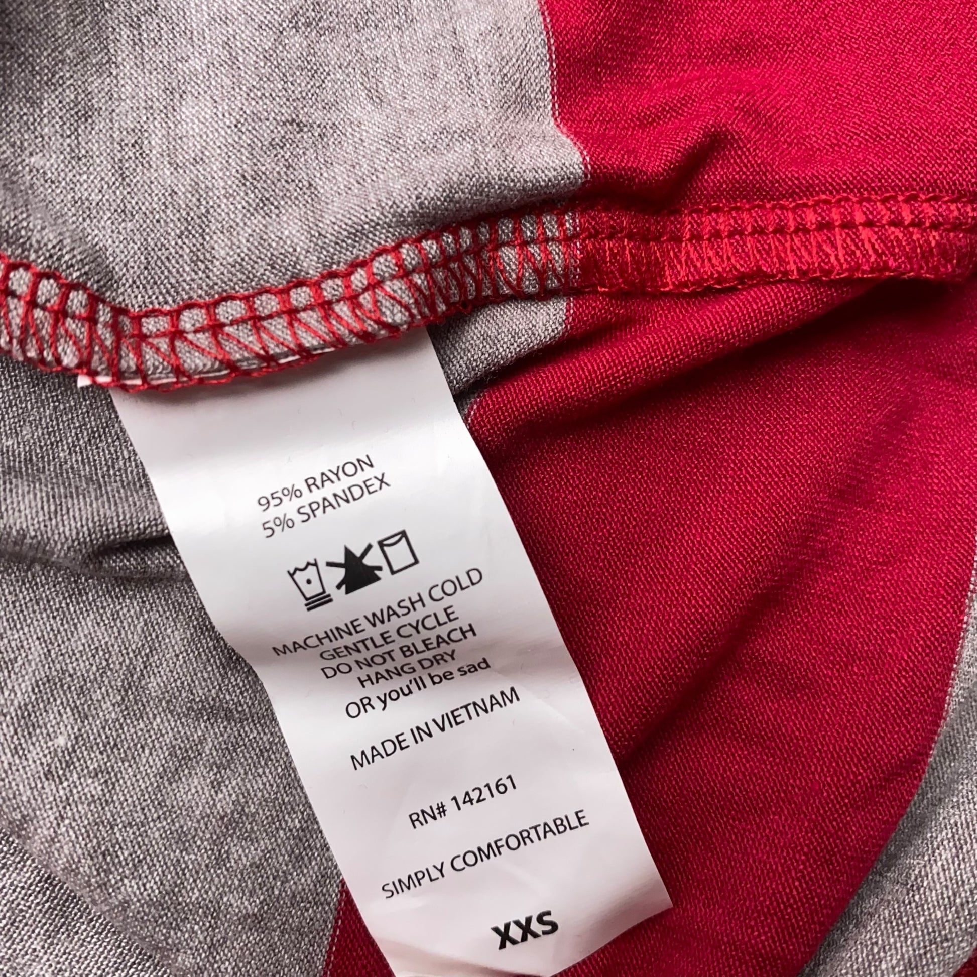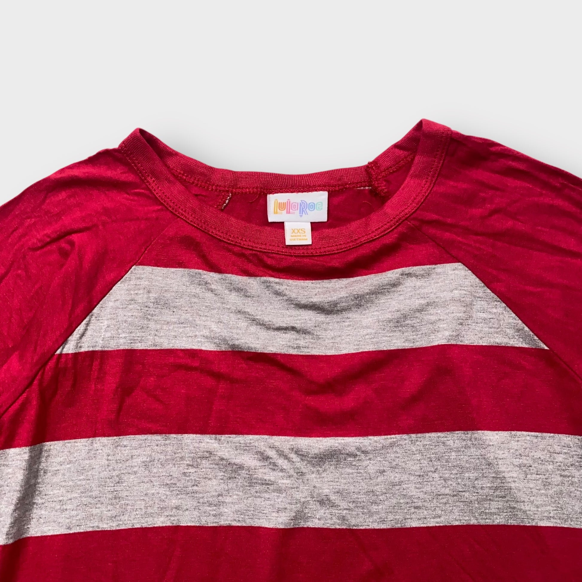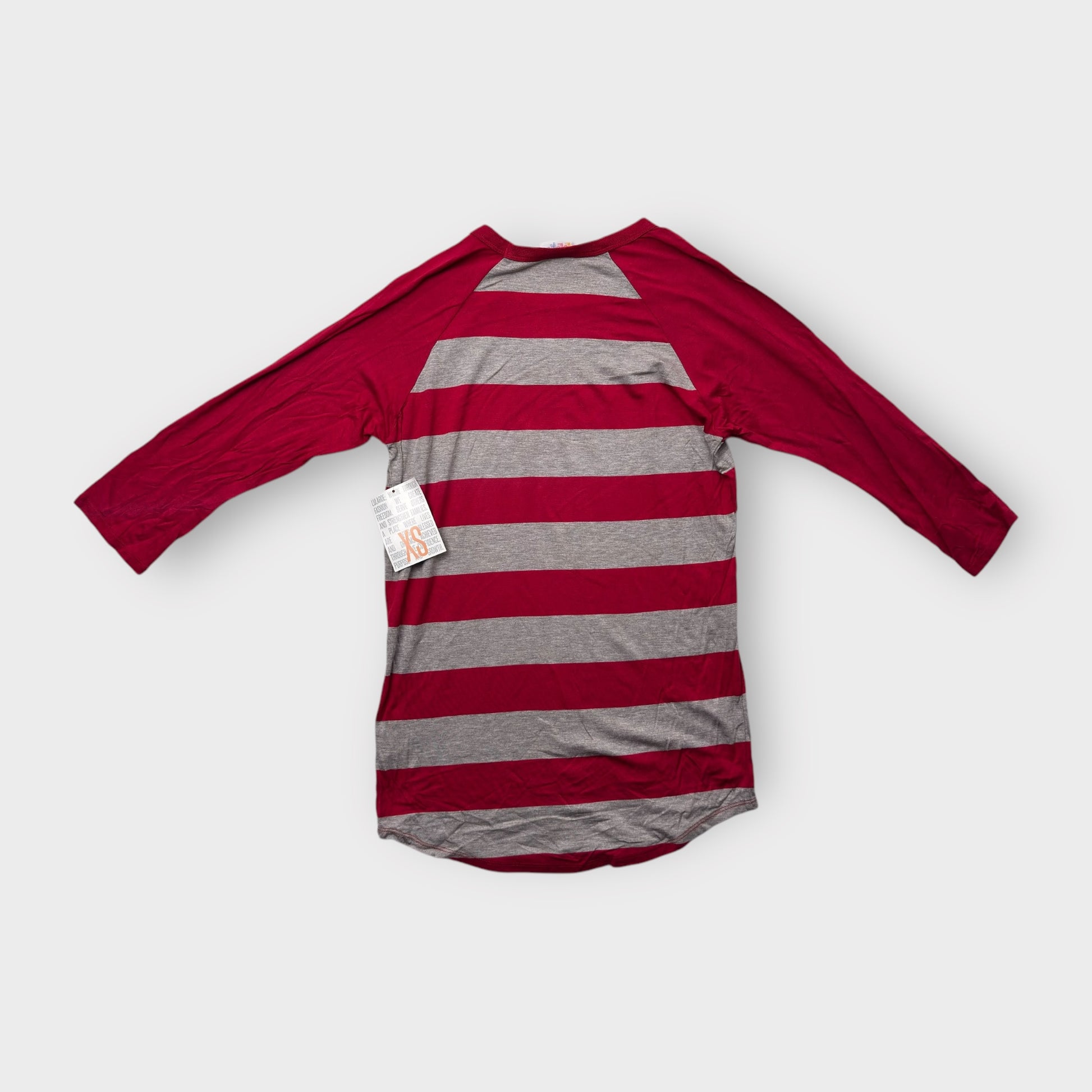 LuLaRoe Randy Tee XXS (00) - Burgundy and Gray Striped Raglan - Soft Stretch Rayon Spandex Blend