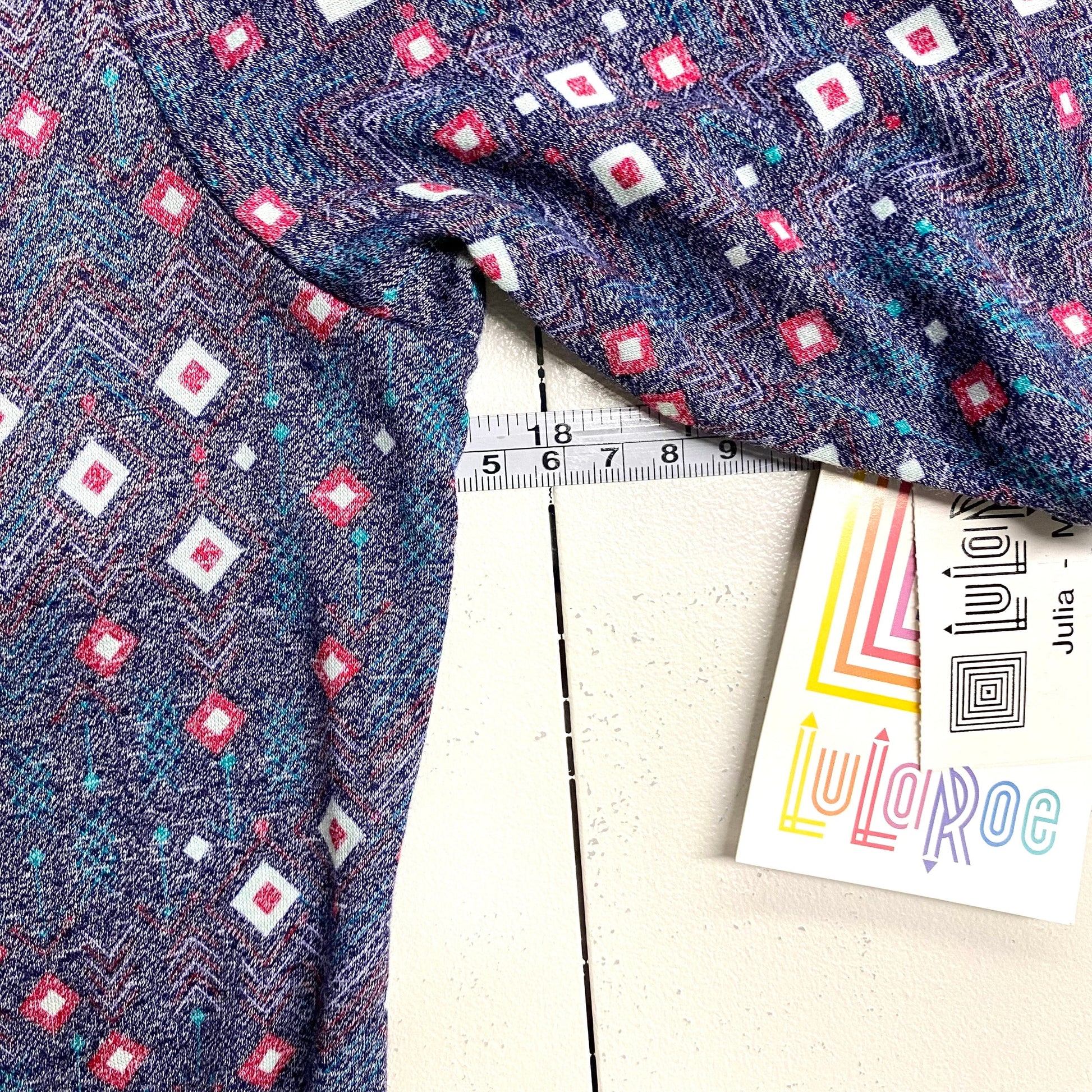 Step into a world of vibrant elegance with the LuLaRoe Julia Bodycon Dress. This stunning dress, adorned in a captivating blue, red, and white chevron pattern, is designed to hug your curves in all the right places, making it the perfect choice for date nights or any special occasion. Crafted from a luxurious blend of polyester, rayon, and spandex, this dress promises not only a flattering fit but also exceptional comfort that moves with you.