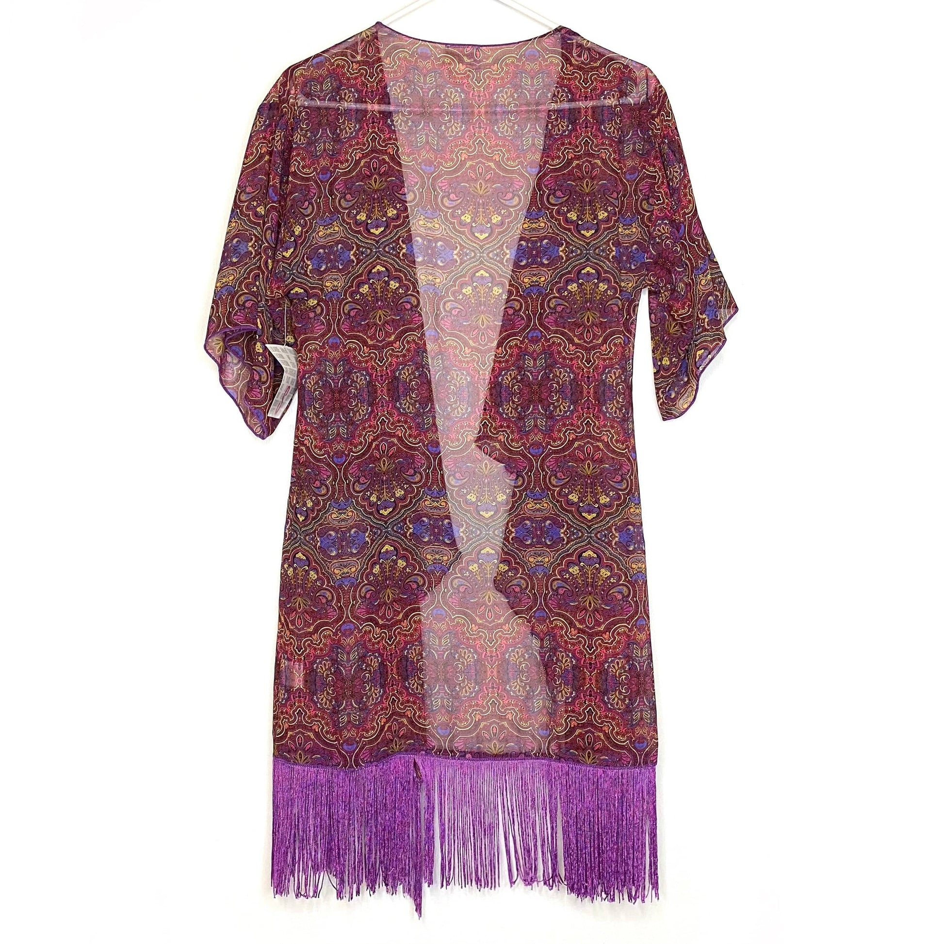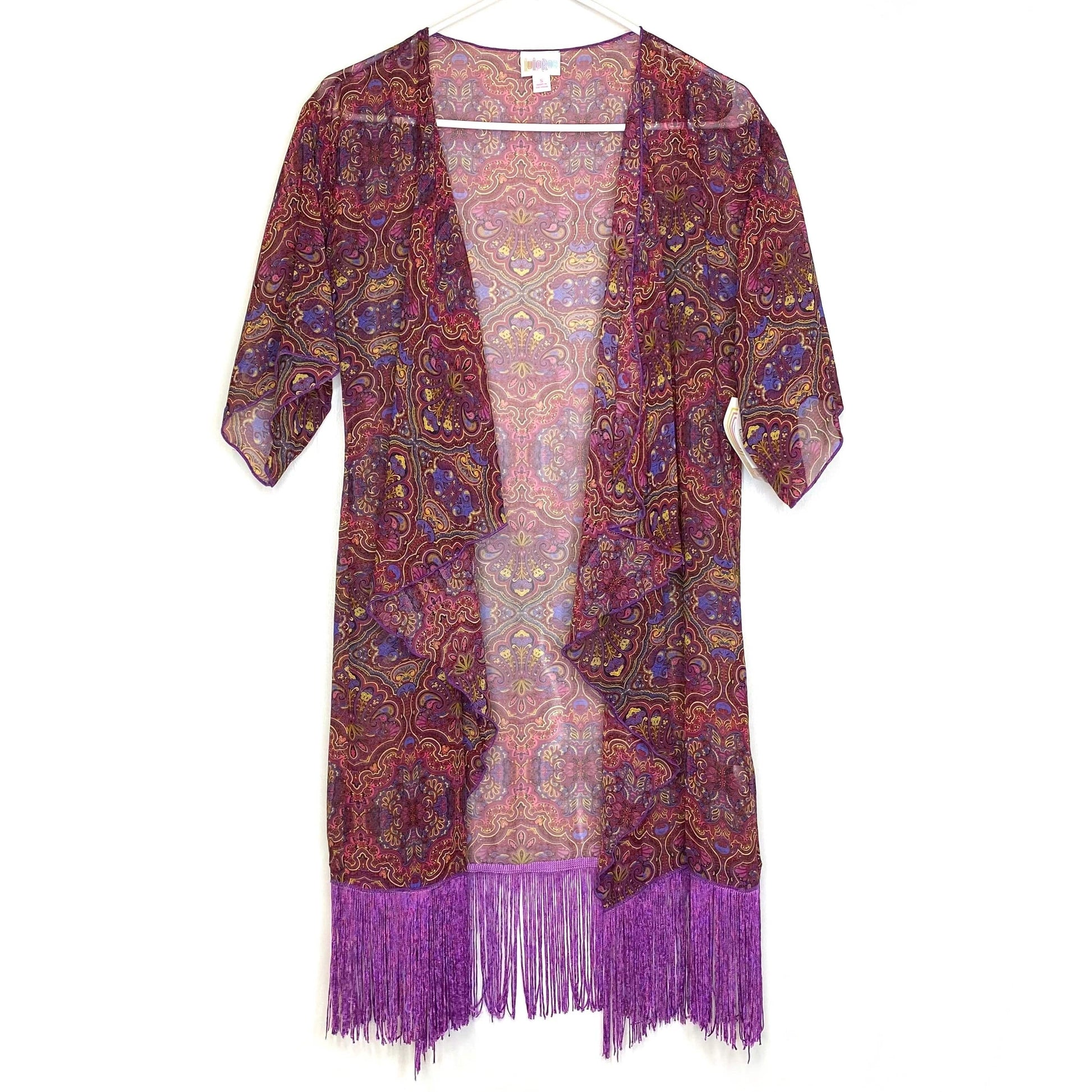 LuLaRoe Womens Size S (0-12) Red/Blue/Purple Damask ‘Monroe’ Kimono Fringe Cover-Up NWT