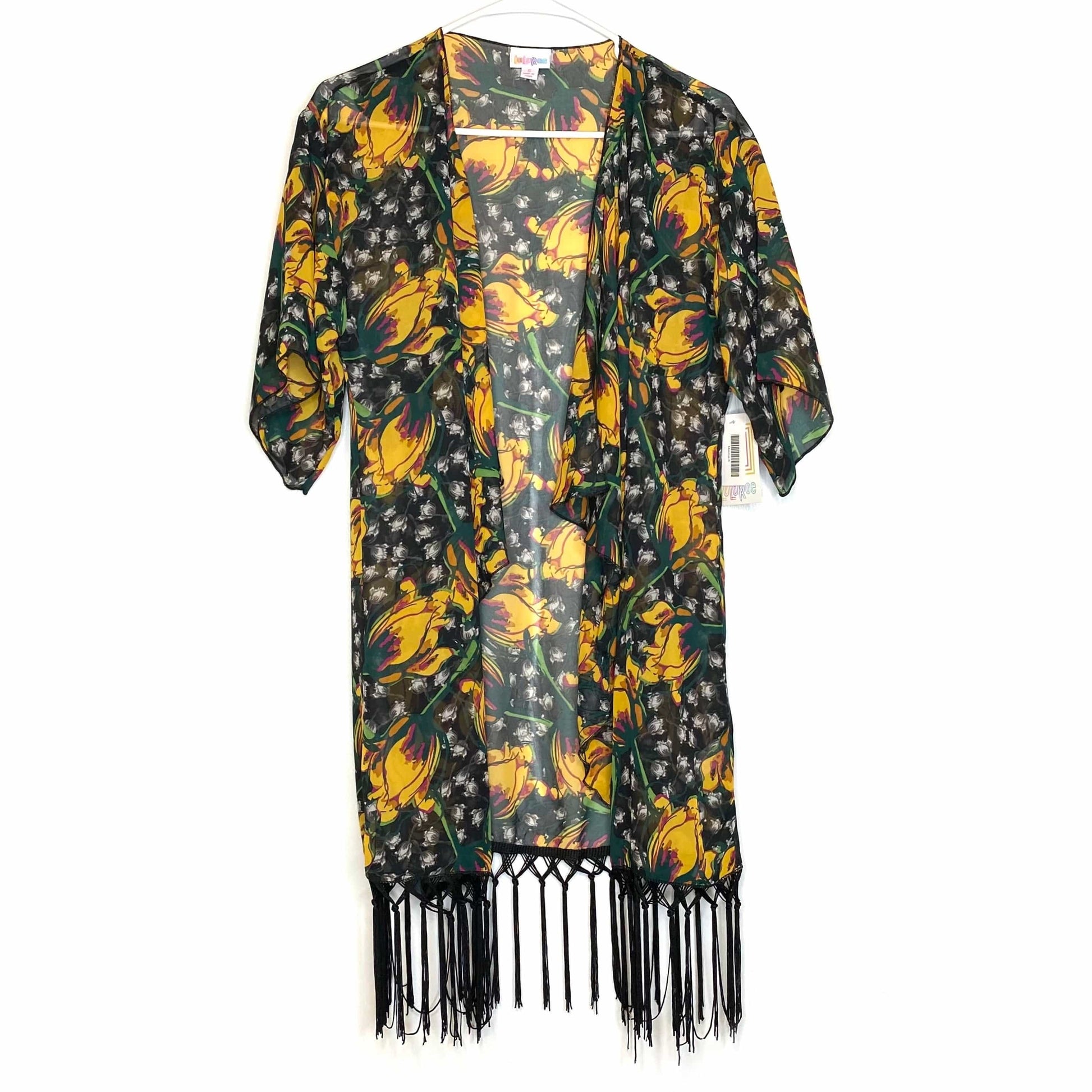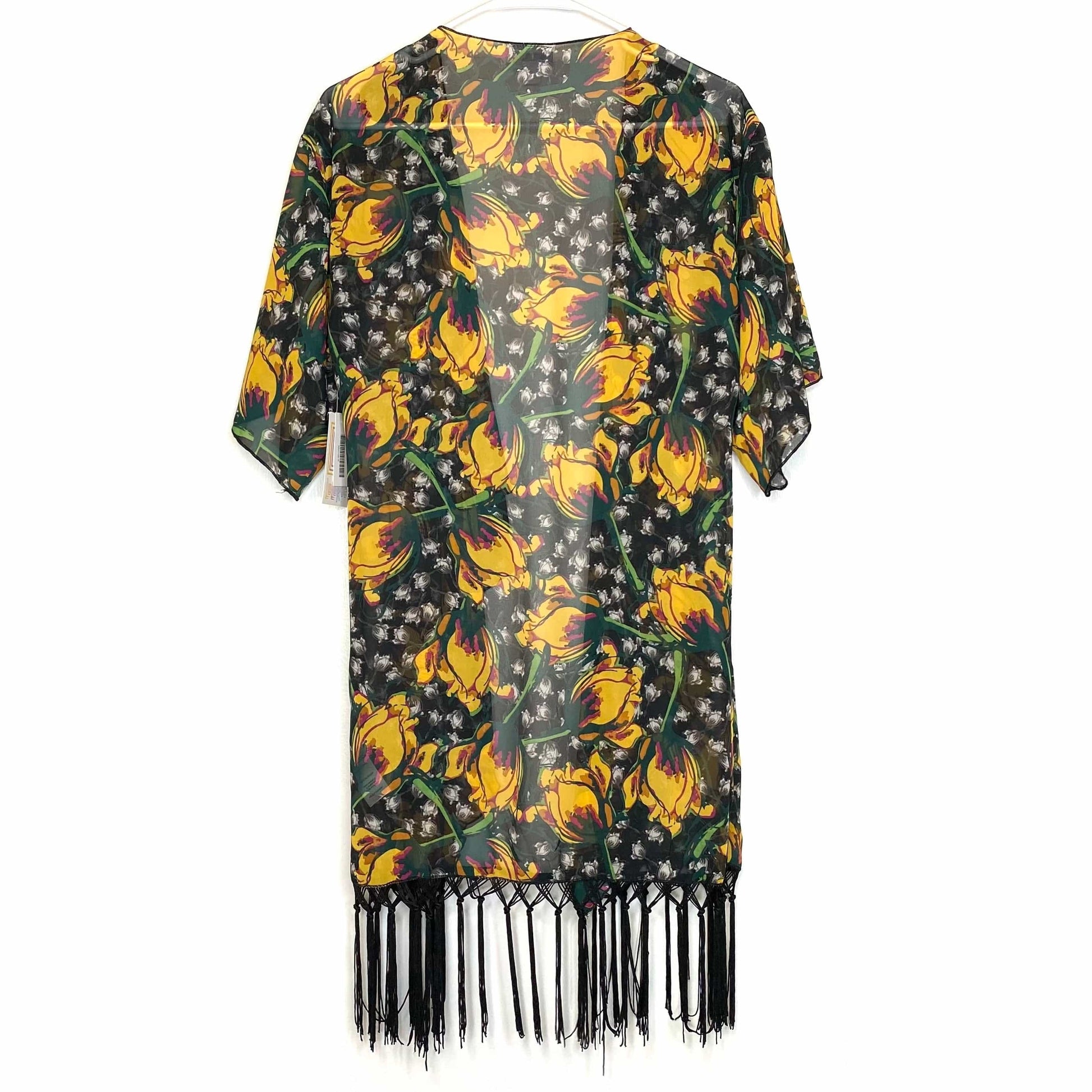 LuLaRoe Womens Size S (0-12) Yellow/Black Floral ‘Monroe’ Kimono Fringe Cover-Up NWT