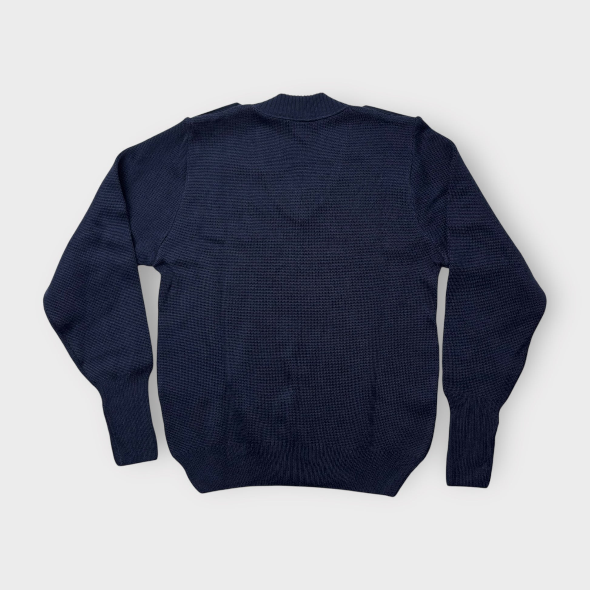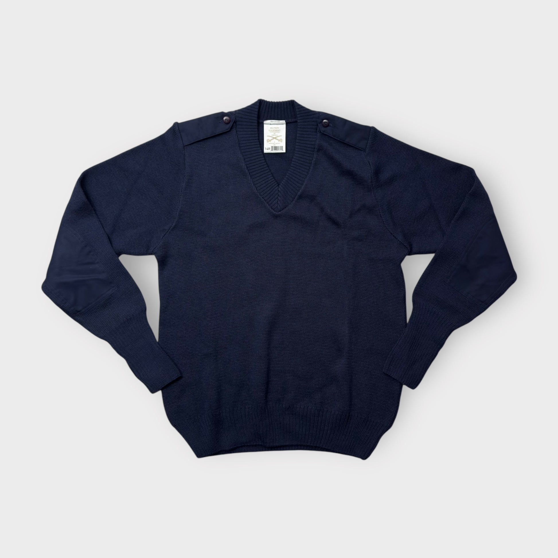 This navy blue V-neck sweater is ideal for those seeking a blend of military-inspired style and practical comfort.