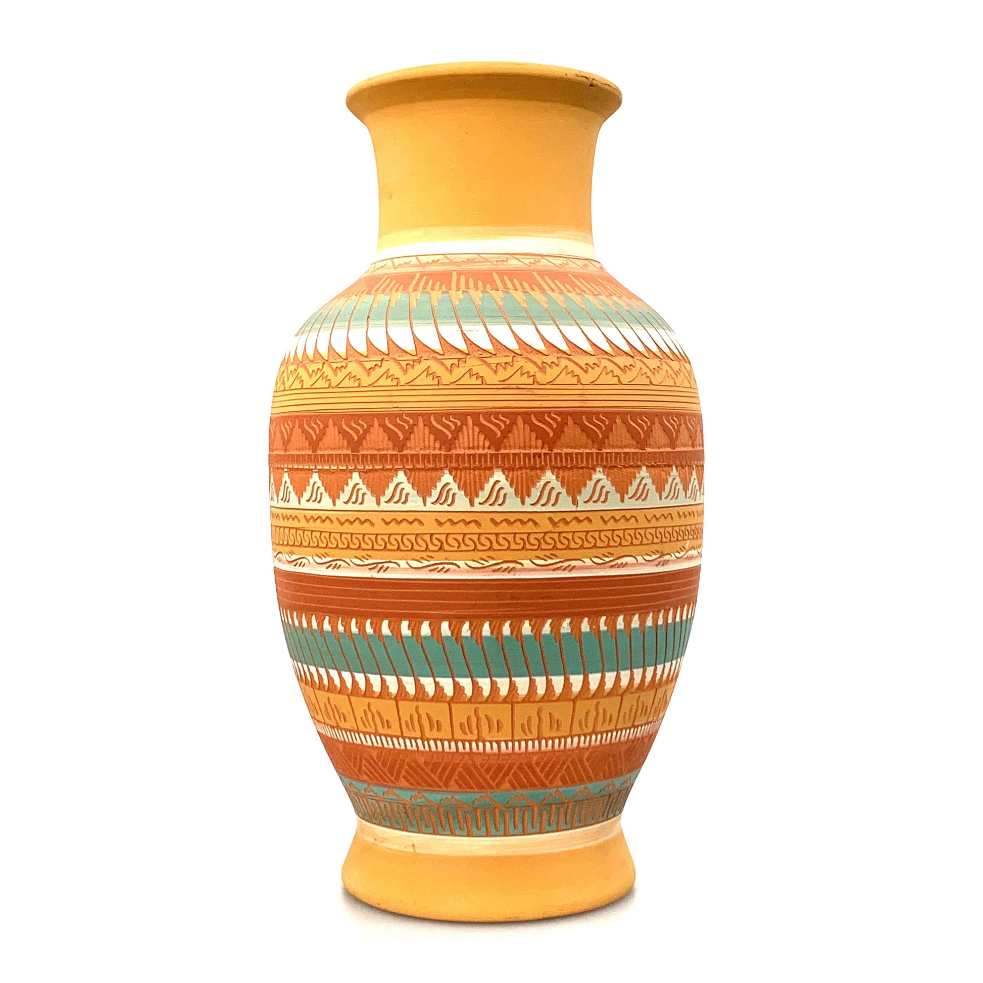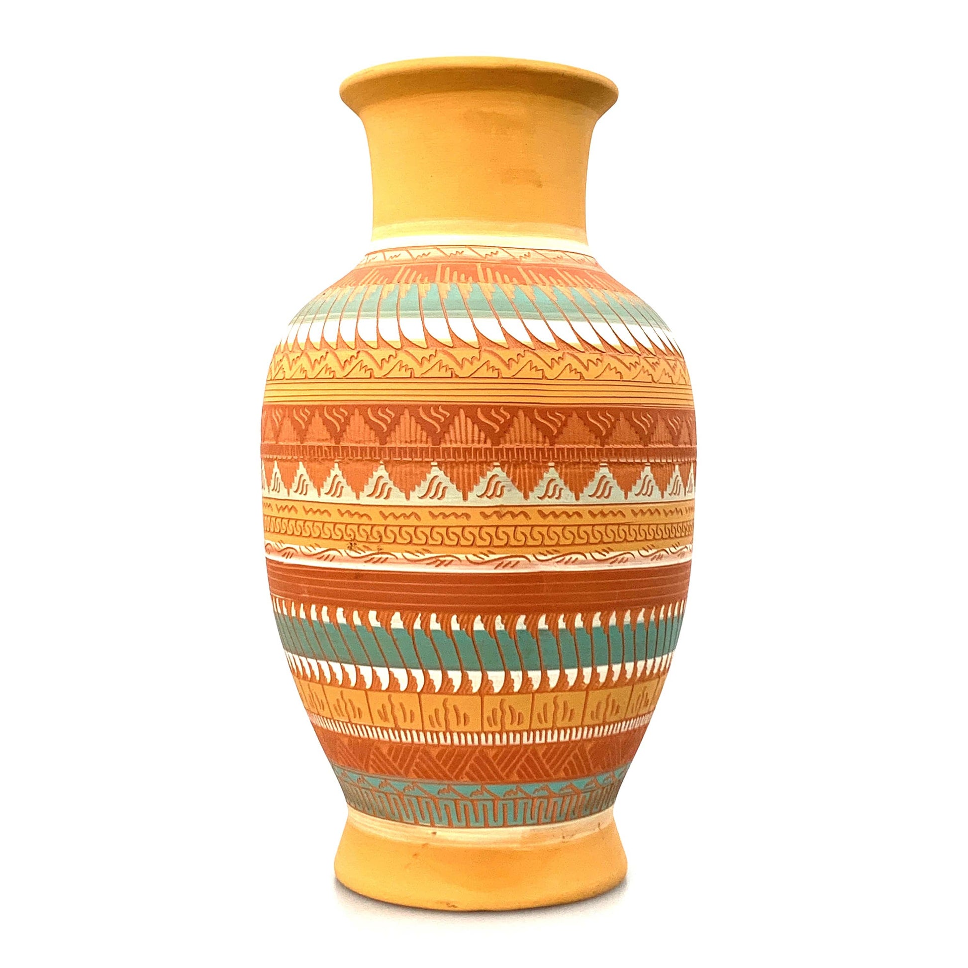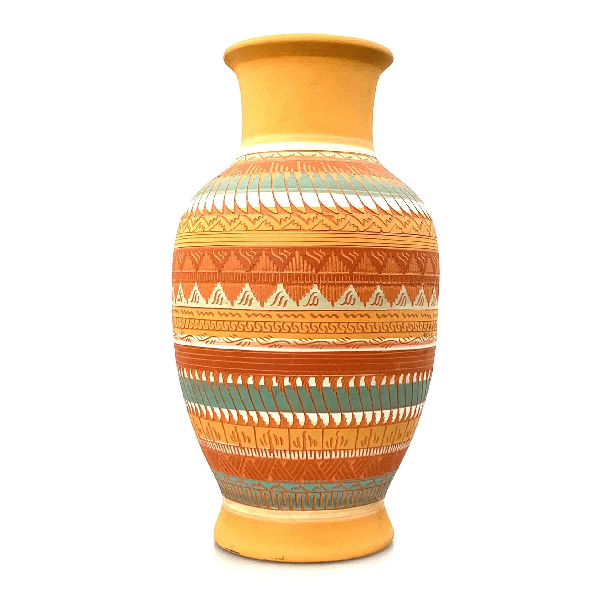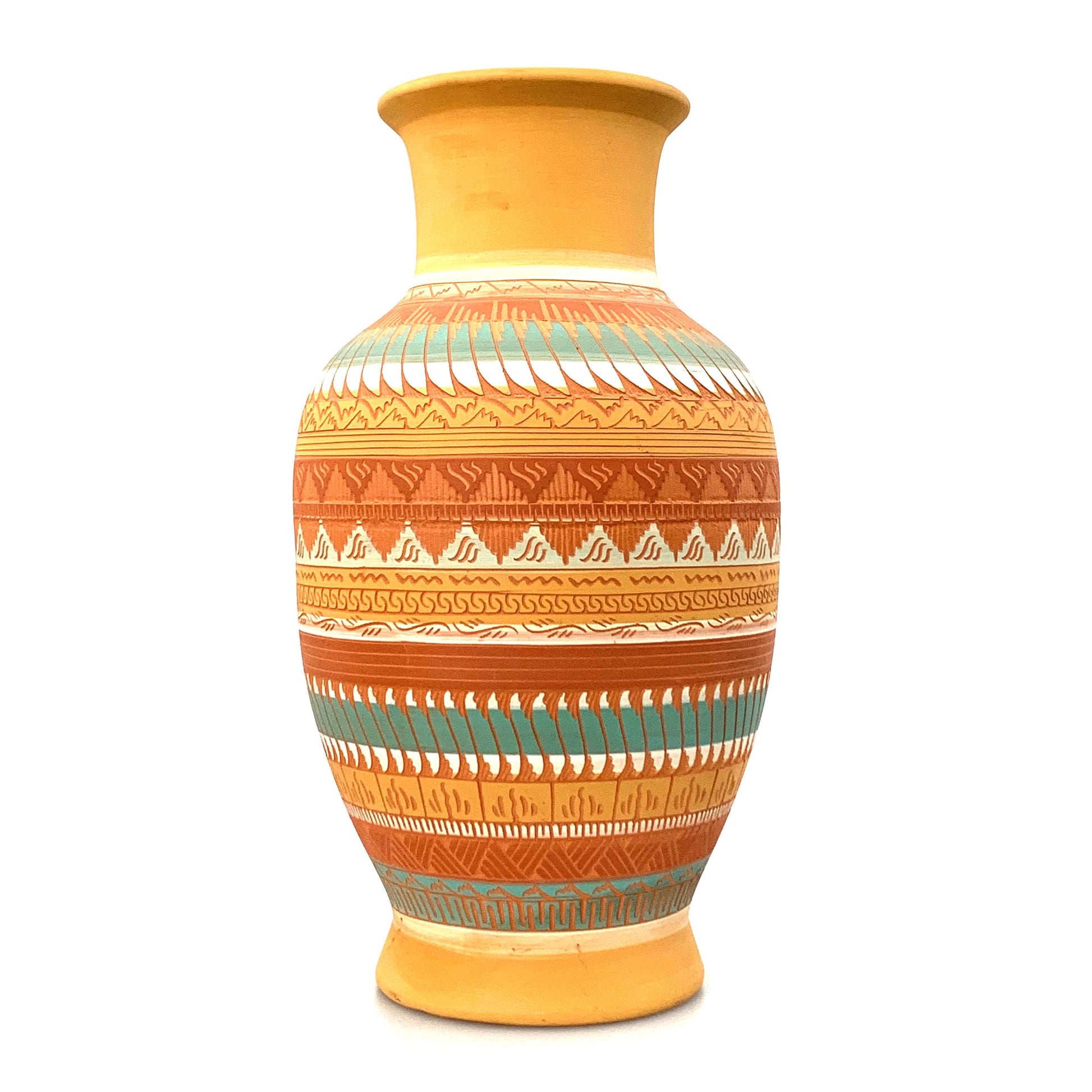 Add a touch of Native American artistry to your home with this stunning Navajo pottery vase. Hand etched by Anna Tsosie, this large 18" terra cotta vase showcases intricate designs and vibrant orange hues. Perfect for adding a pop of color to any space, this vase is a true work of art.