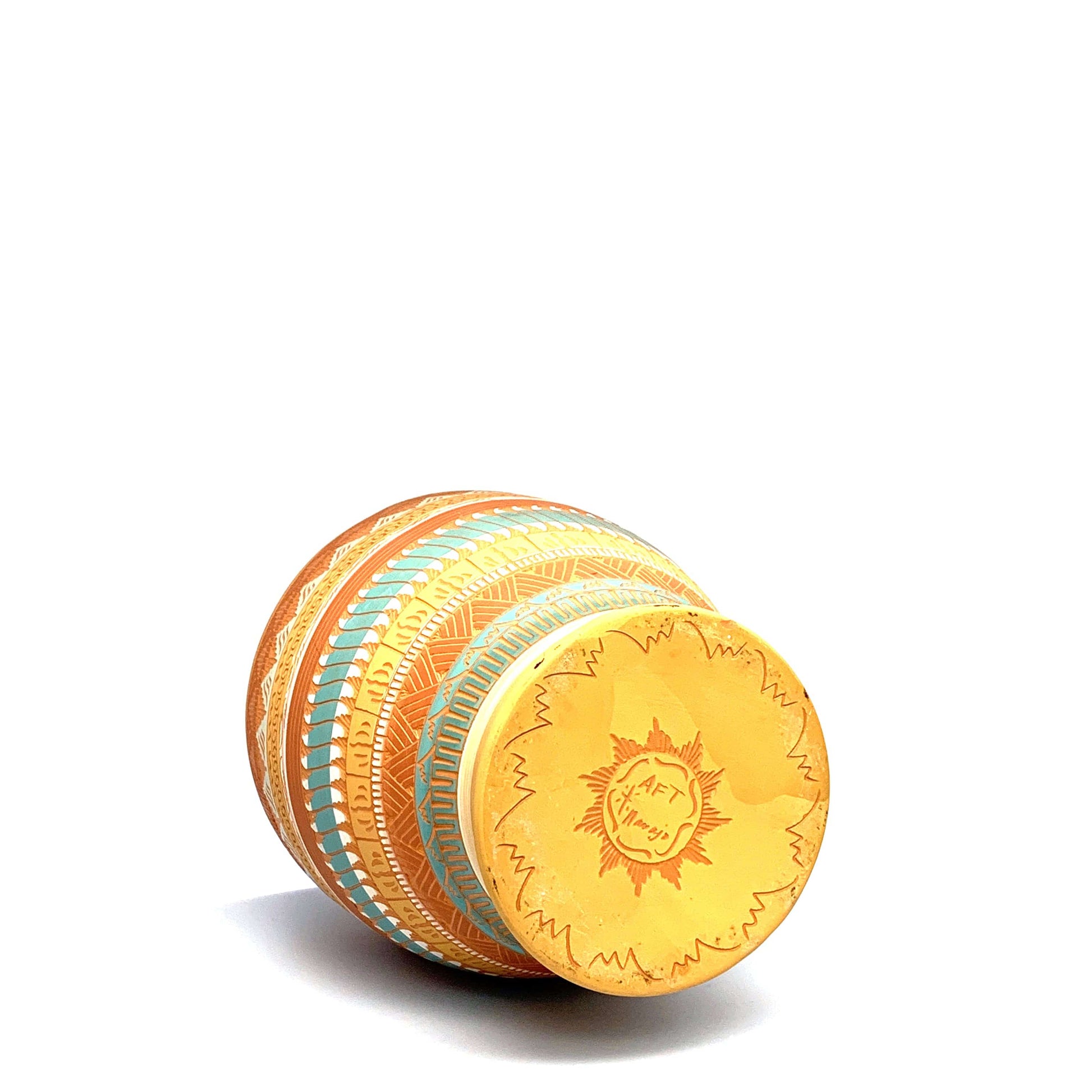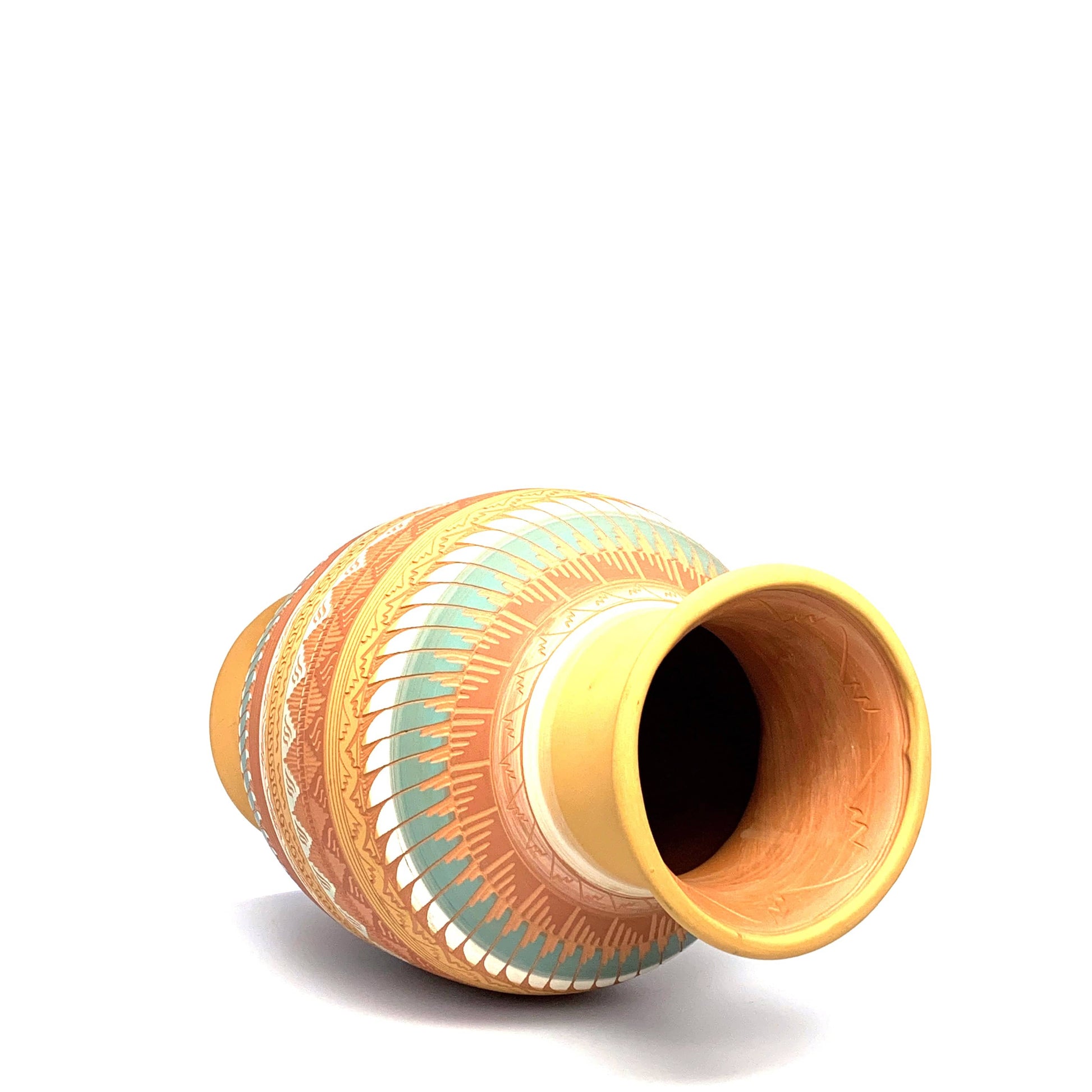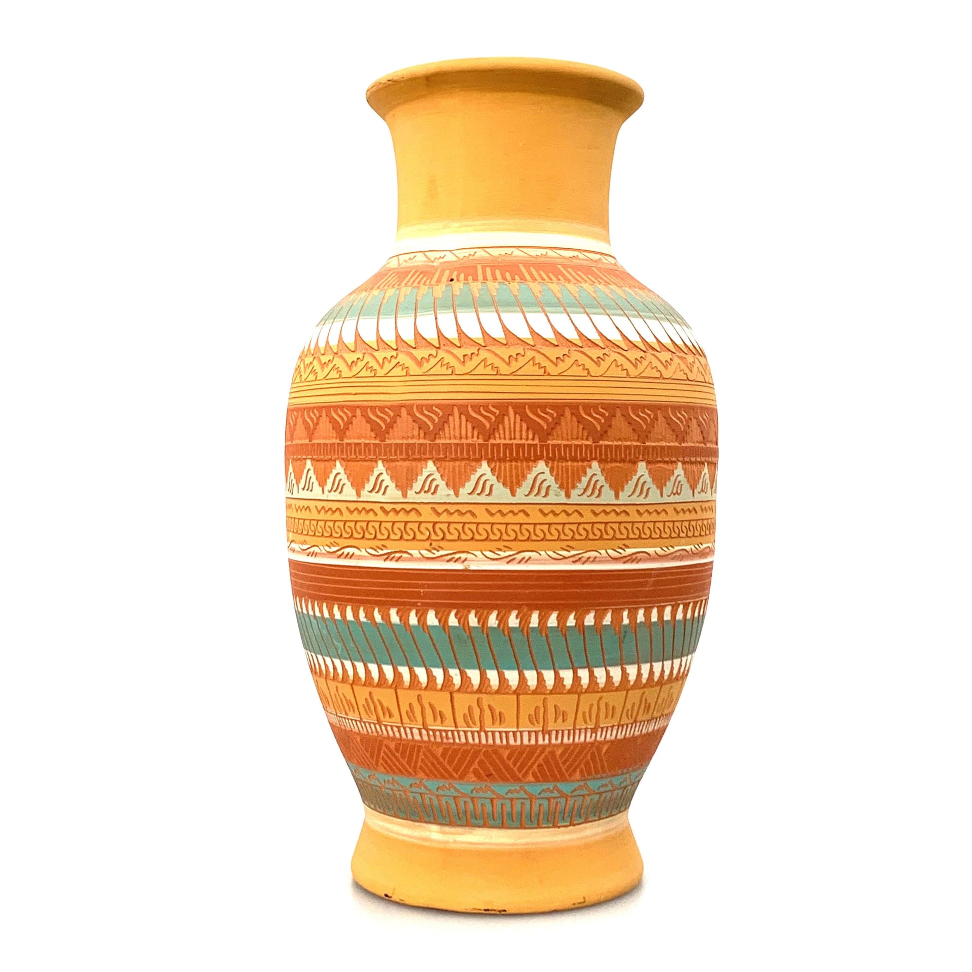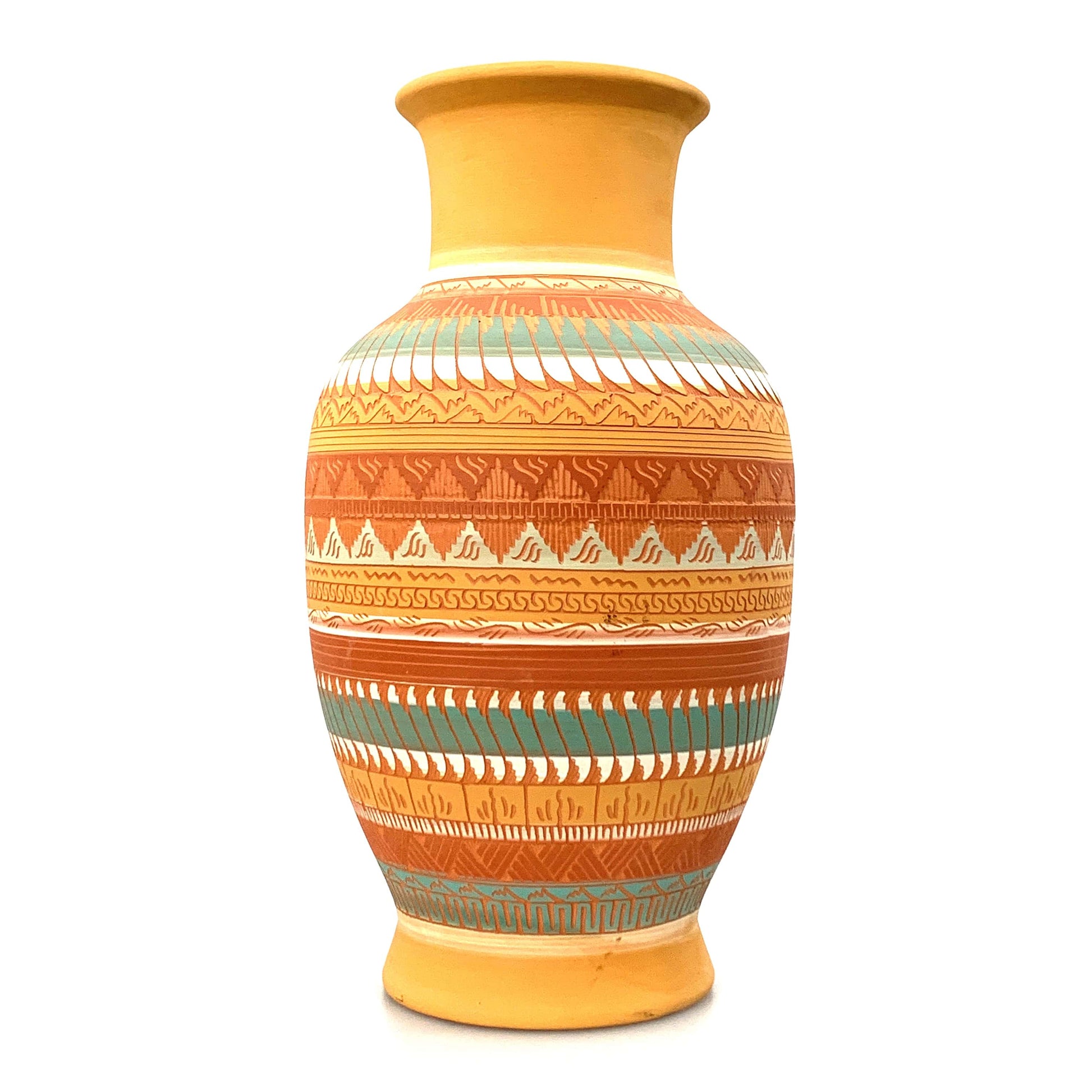 Add a touch of Native American artistry to your home with this stunning Navajo pottery vase. Hand etched by Anna Tsosie, this large 18" terra cotta vase showcases intricate designs and vibrant orange hues. Perfect for adding a pop of color to any space, this vase is a true work of art.