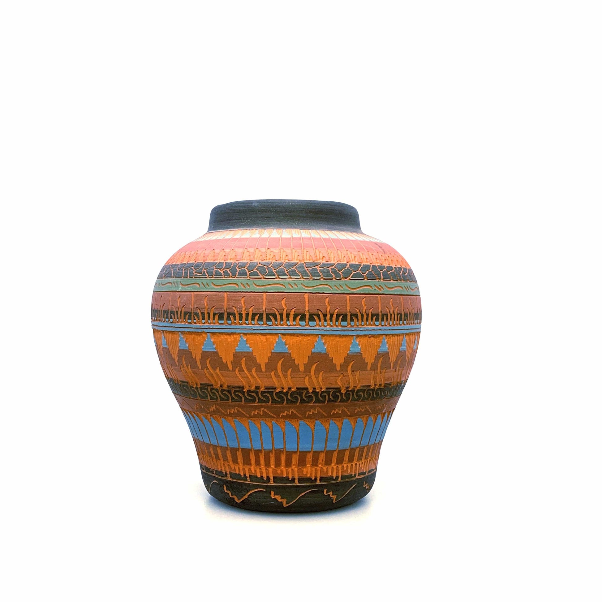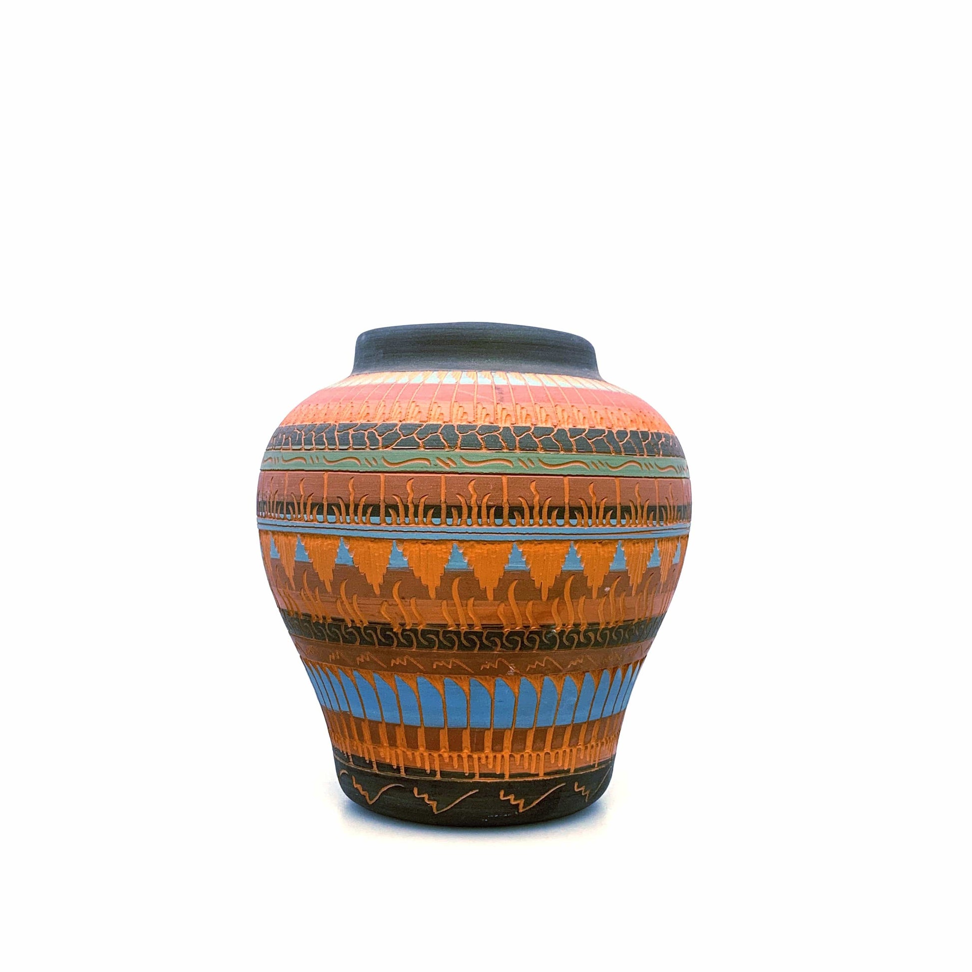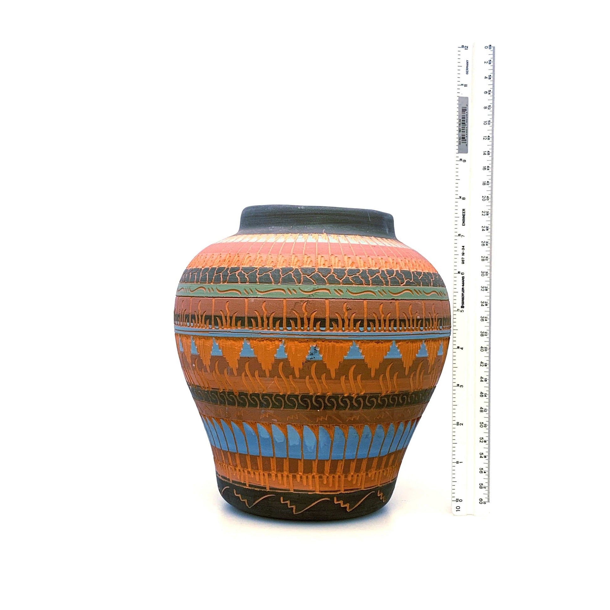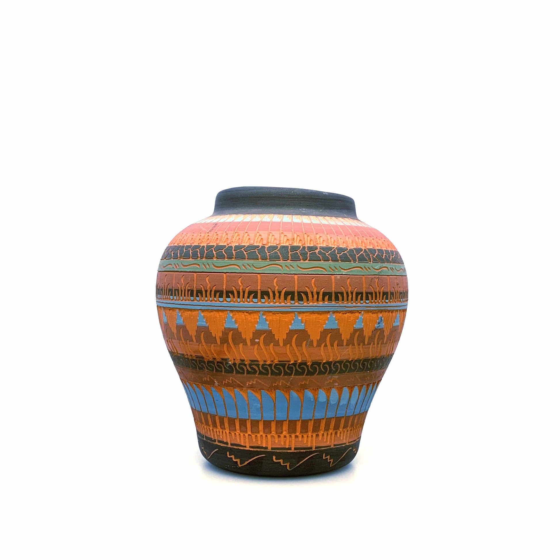 Add a touch of Native American artistry to your home with this stunning Navajo pottery vase. Hand etched by Anna Tsosie, this terra cotta vase showcases intricate designs and is made with love in the USA. Perfect for adding a rustic and unique touch to any space.
