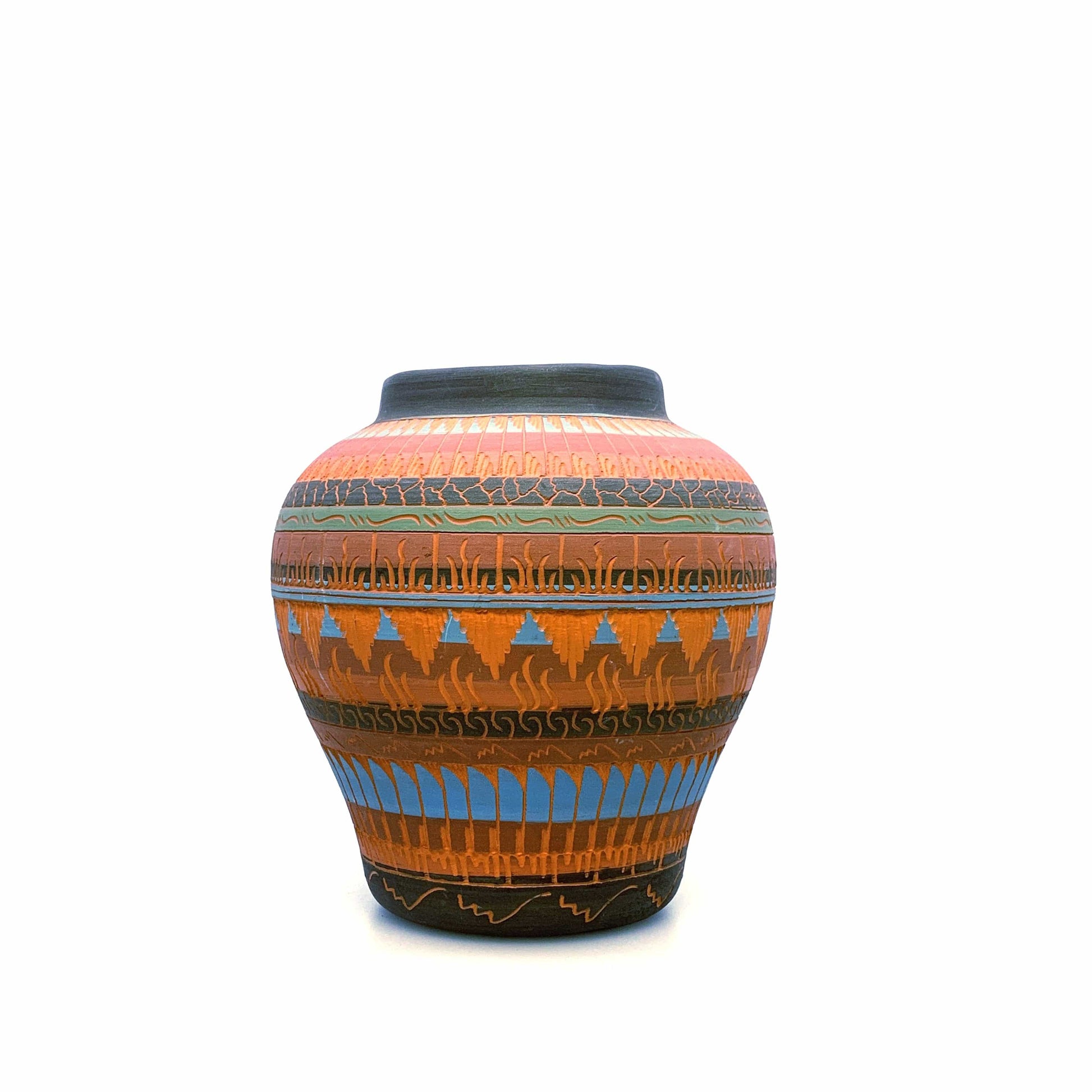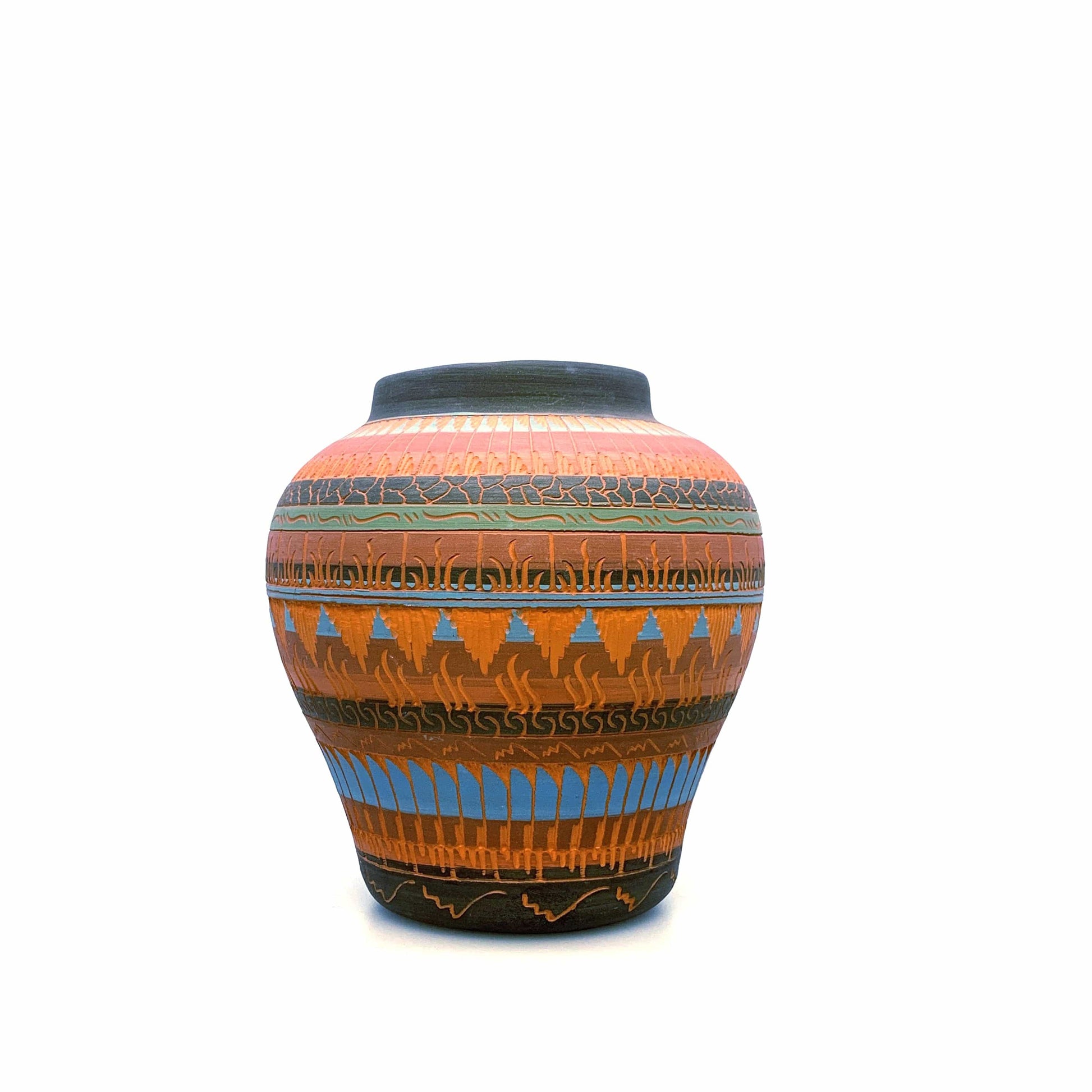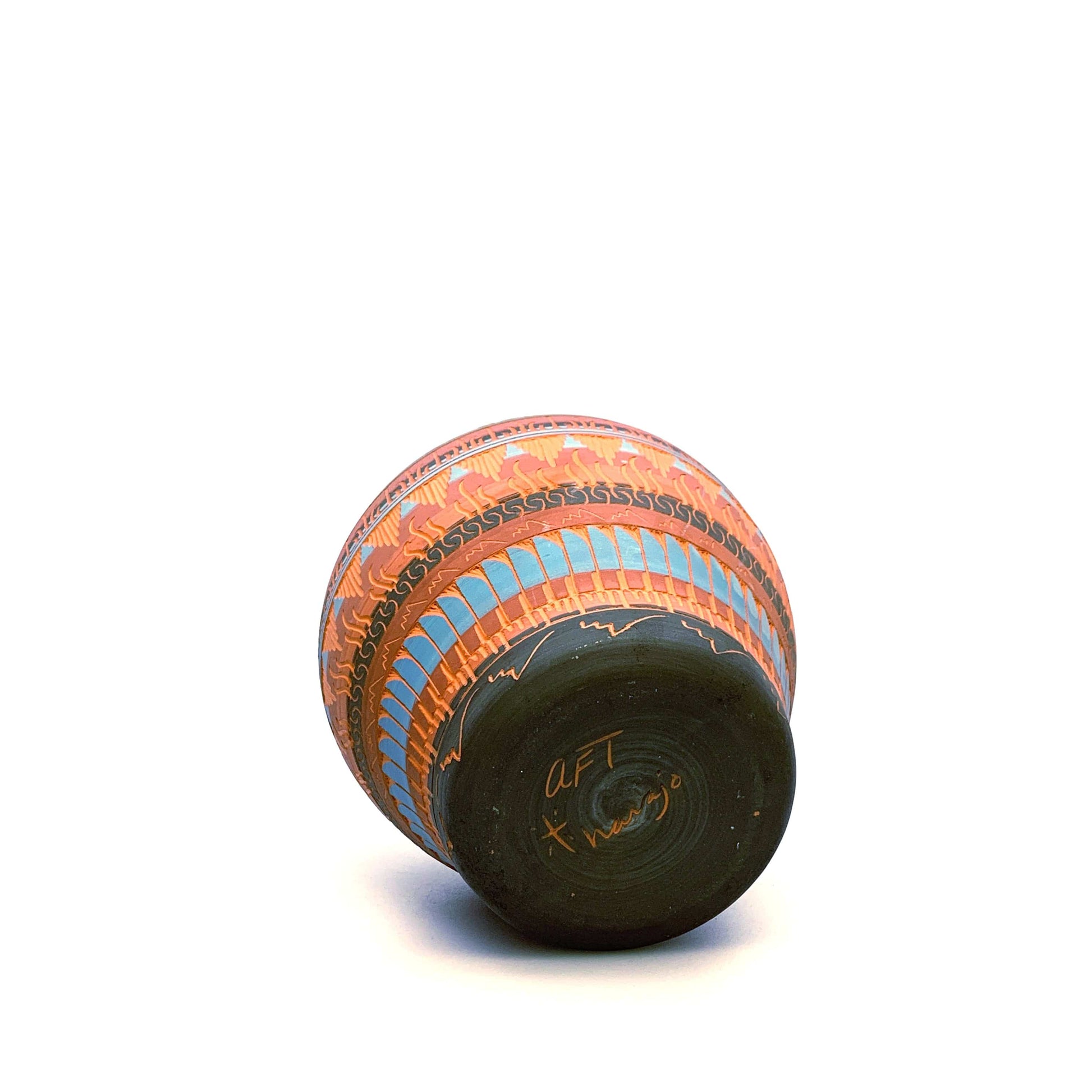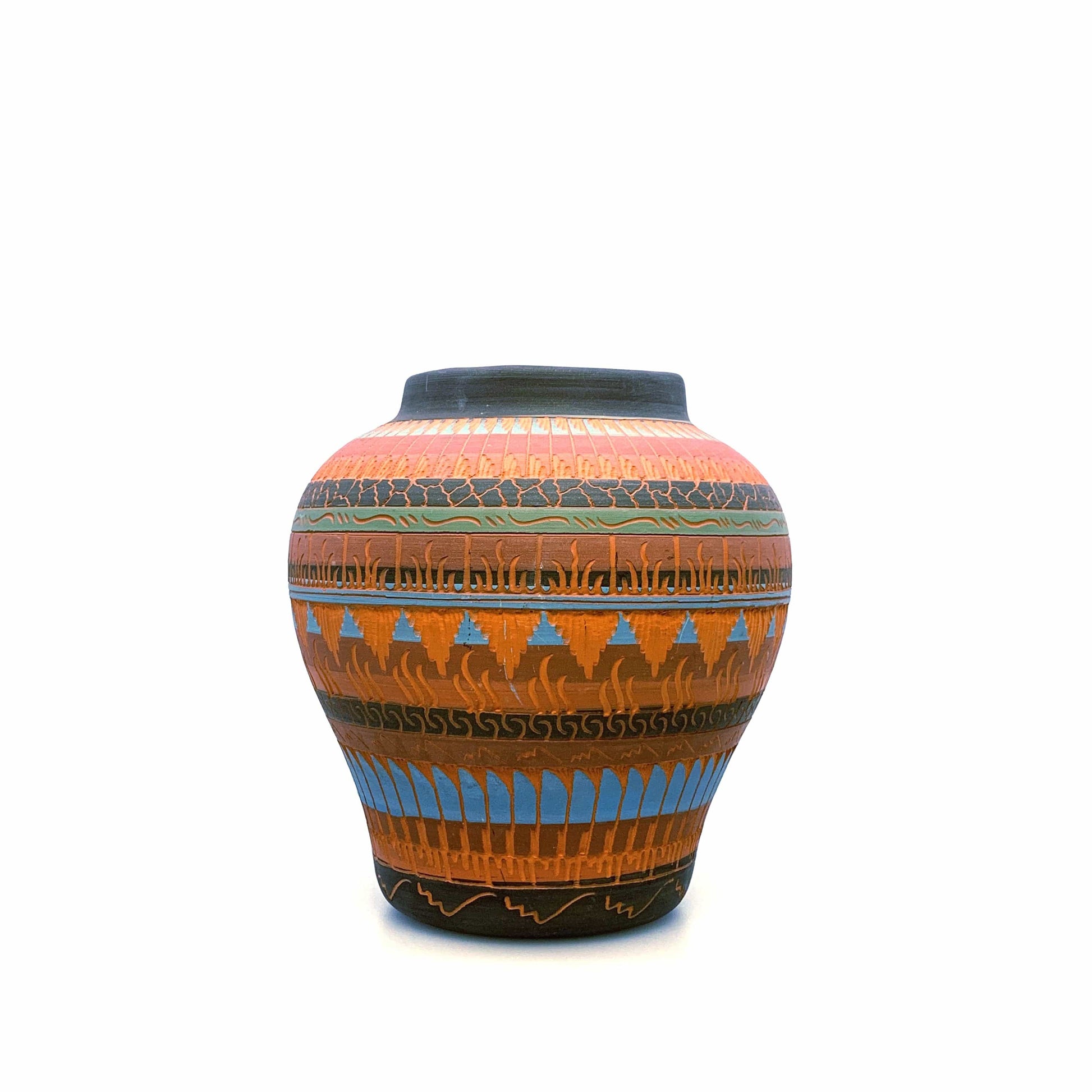 Add a touch of Native American artistry to your home with this stunning Navajo pottery vase. Hand etched by Anna Tsosie, this terra cotta vase showcases intricate designs and is made with love in the USA. Perfect for adding a rustic and unique touch to any space.