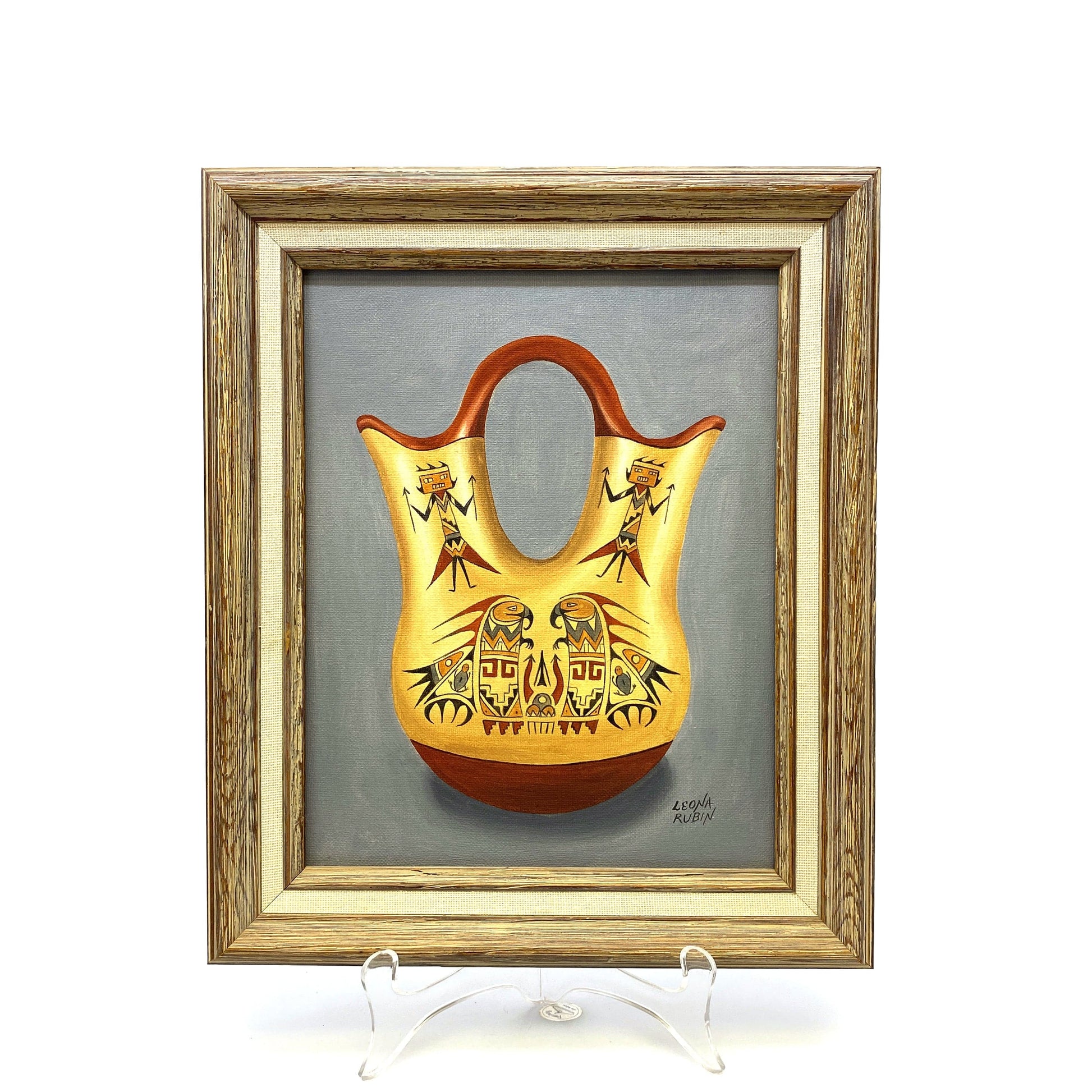 Experience the beauty and tradition of Navajo art with this stunning oil painting. Handcrafted by Leona Rubin, this framed artwork depicts a traditional wedding vase, showcasing the rich heritage of the Navajo people. Made in the USA and featuring vibrant colors, this piece is a true masterpiece. Add a touch of Native American culture to your home with this unique and captivating artwork.