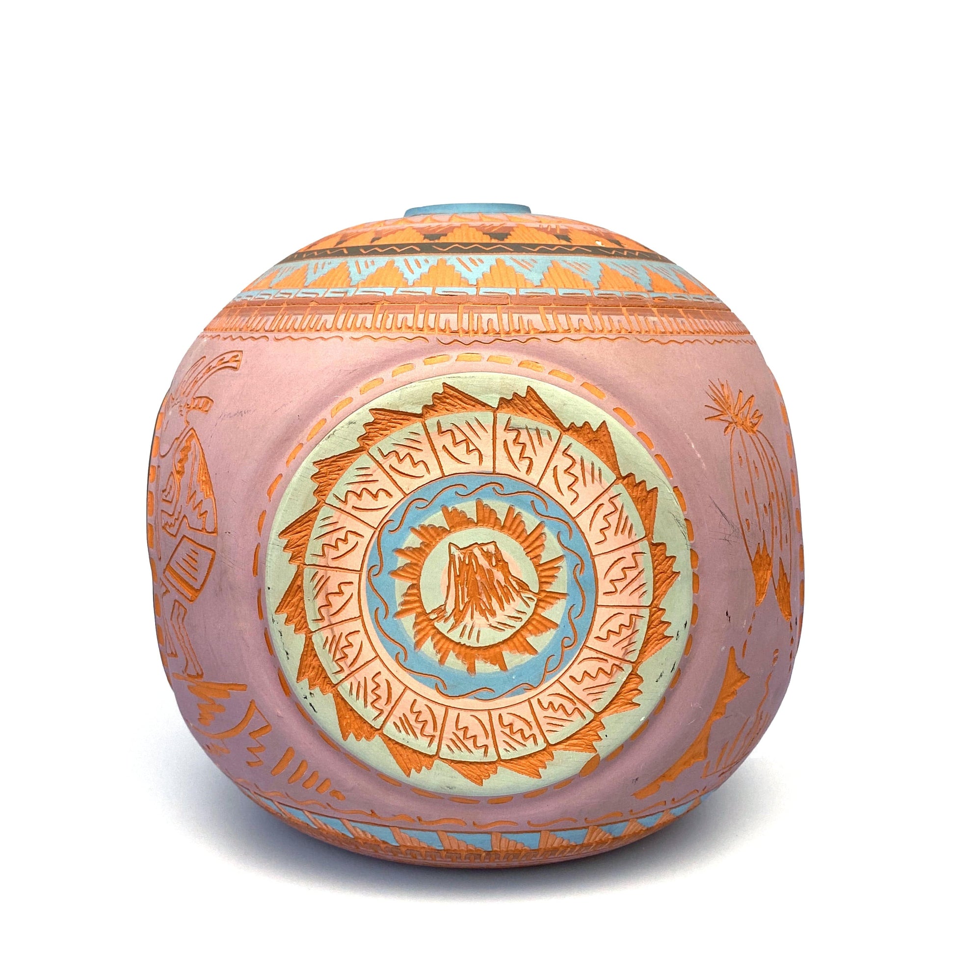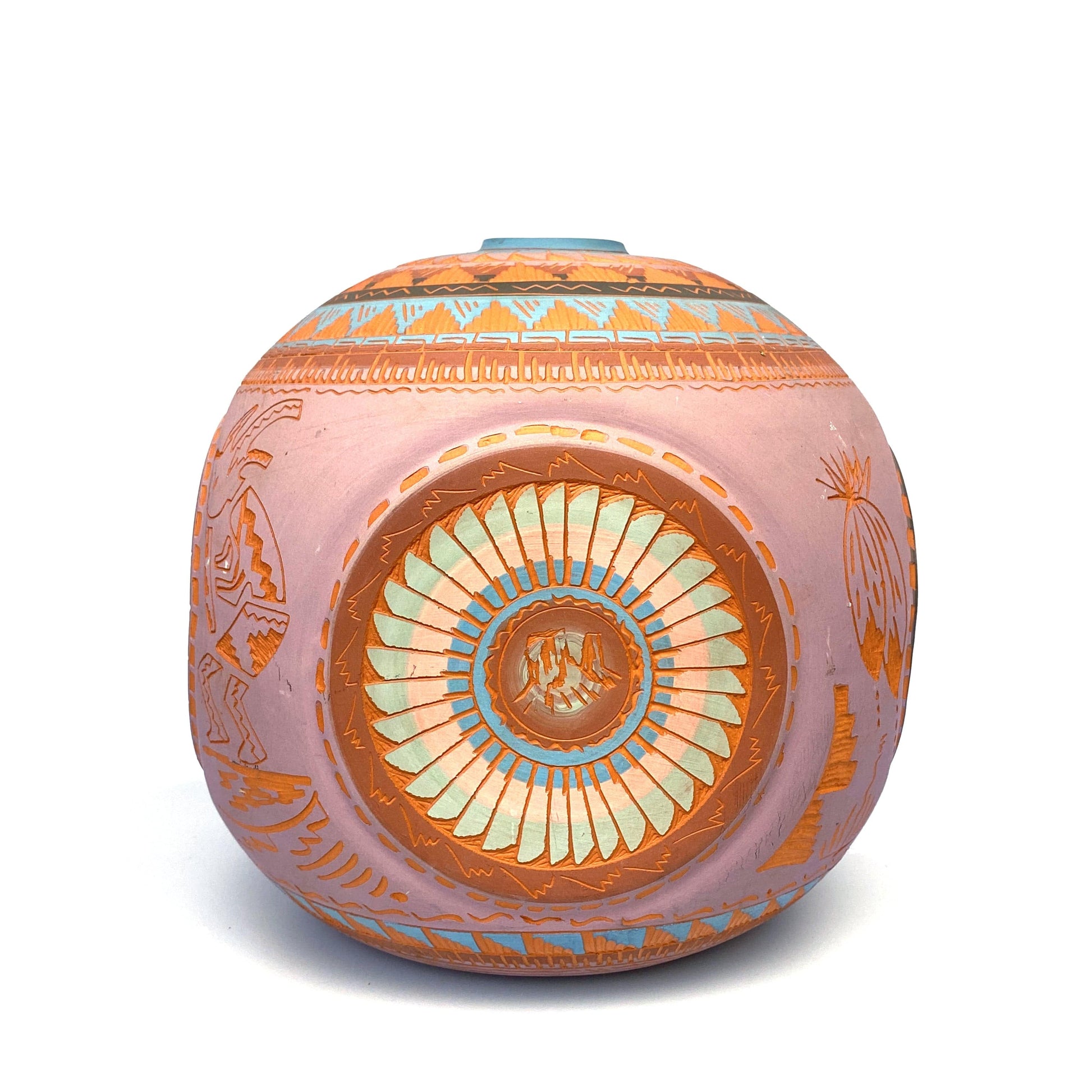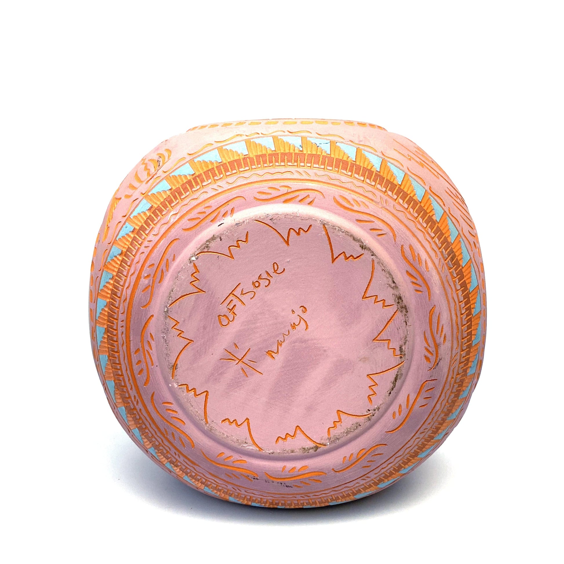 Add a touch of Native American artistry to your home with this stunning Navajo pottery vase. Hand etched by Anna Tsosie, this 9.5" rounded square vase features beautiful pink and brown etched carvings. Perfect for adding a unique and artistic touch to any room.