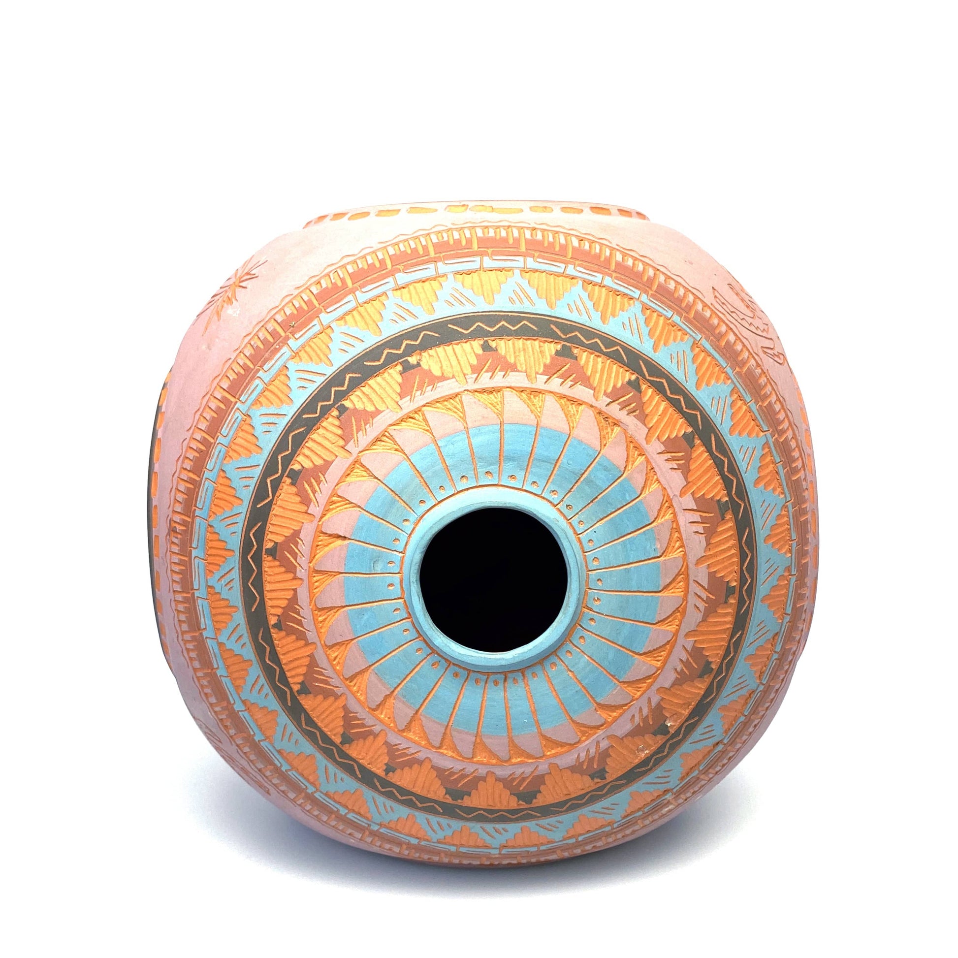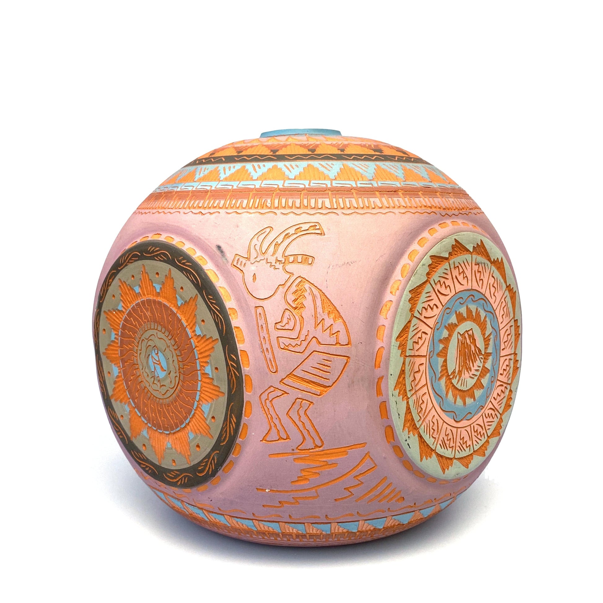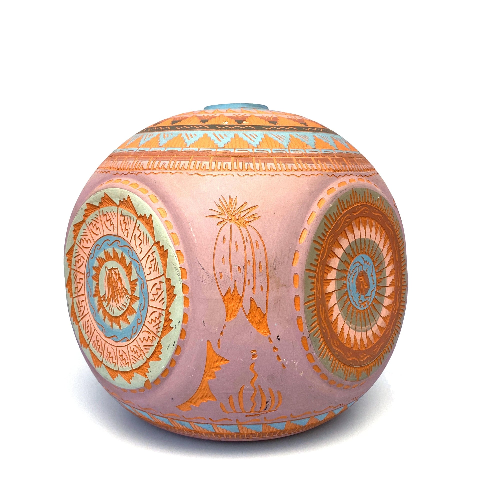 Add a touch of Native American artistry to your home with this stunning Navajo pottery vase. Hand etched by Anna Tsosie, this 9.5" rounded square vase features beautiful pink and brown etched carvings. Perfect for adding a unique and artistic touch to any room.