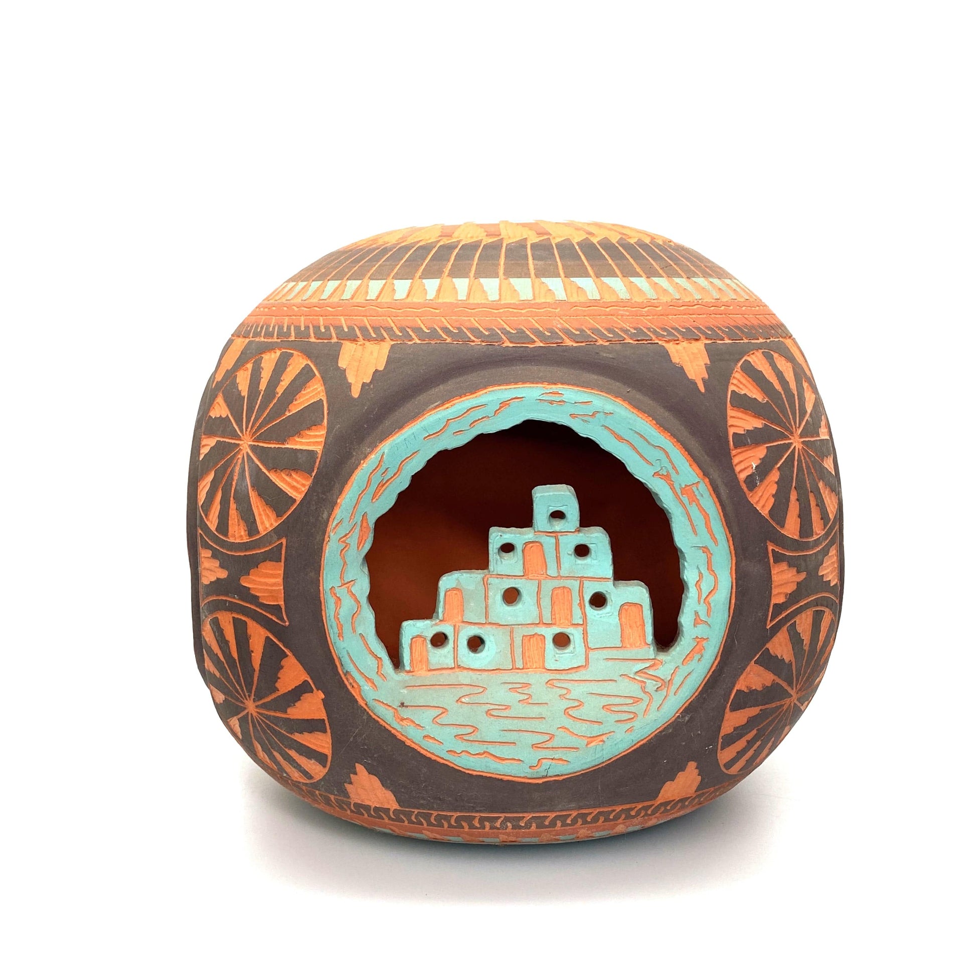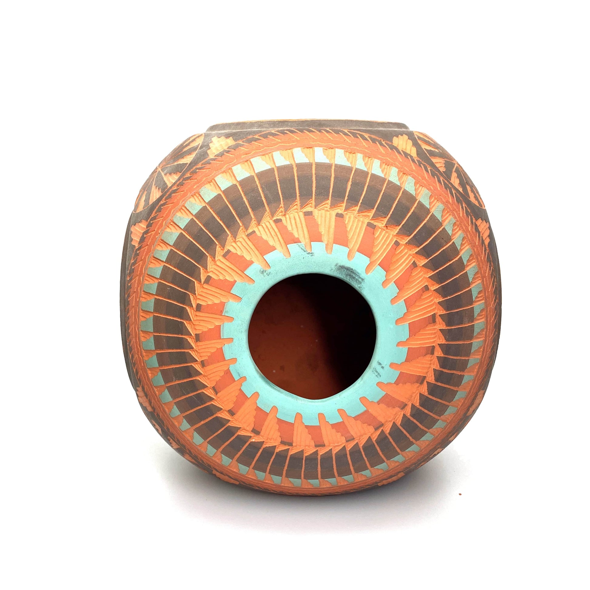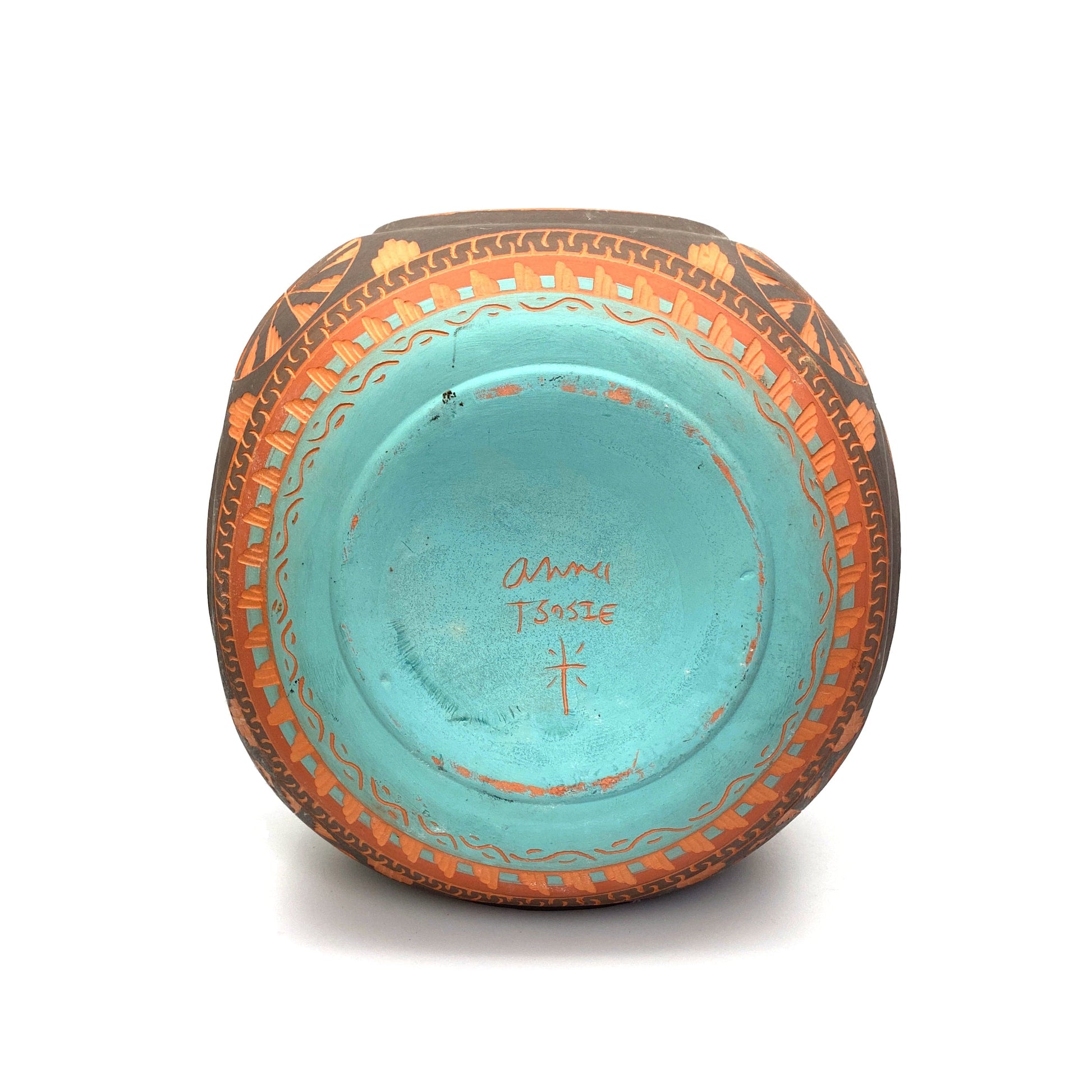 Add a touch of Native American artistry to your home with this stunning Navajo pottery vase. Handcrafted by Anna Tsosie, this 9.5" square vase features intricate etched carvings in a beautiful brown and orange color. Perfect for any decor, this piece is a true work of art.
