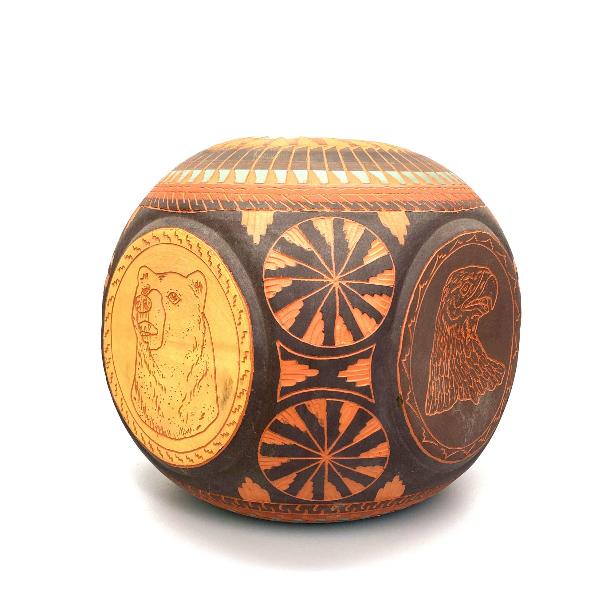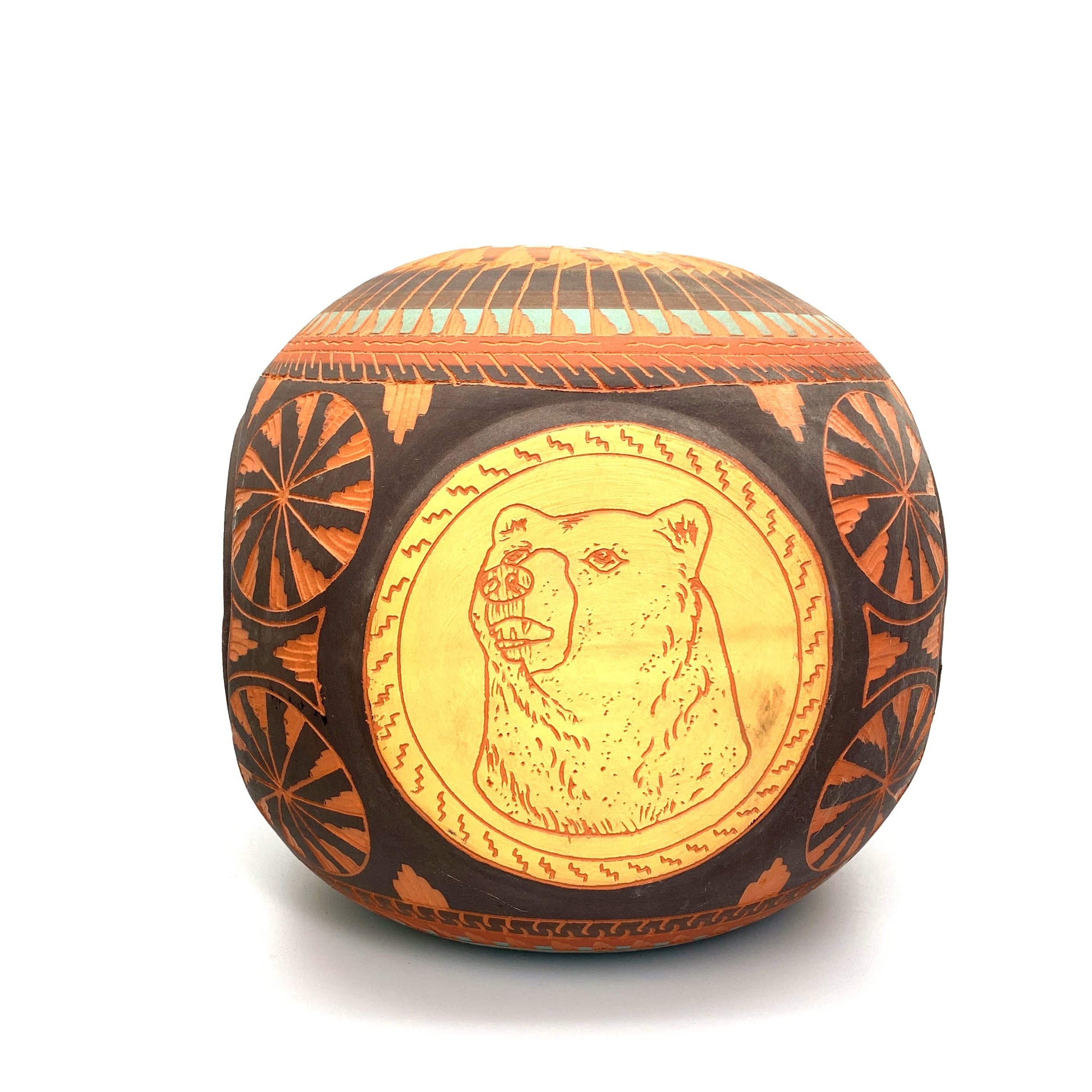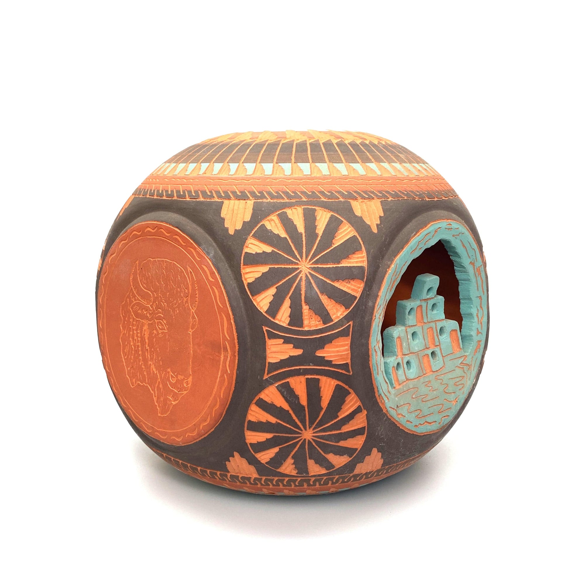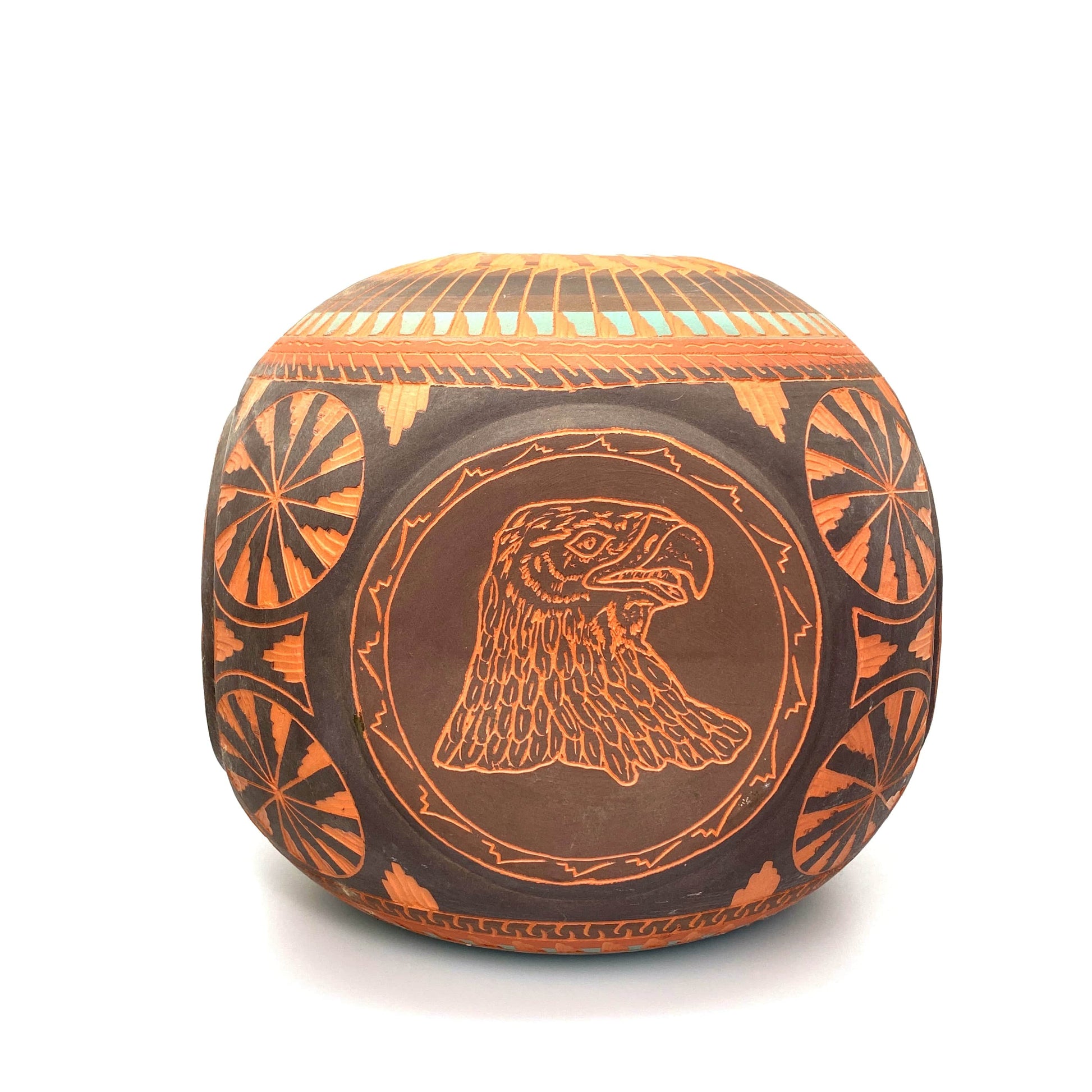 Add a touch of Native American artistry to your home with this stunning Navajo pottery vase. Handcrafted by Anna Tsosie, this 9.5" square vase features intricate etched carvings in a beautiful brown and orange color. Perfect for any decor, this piece is a true work of art.