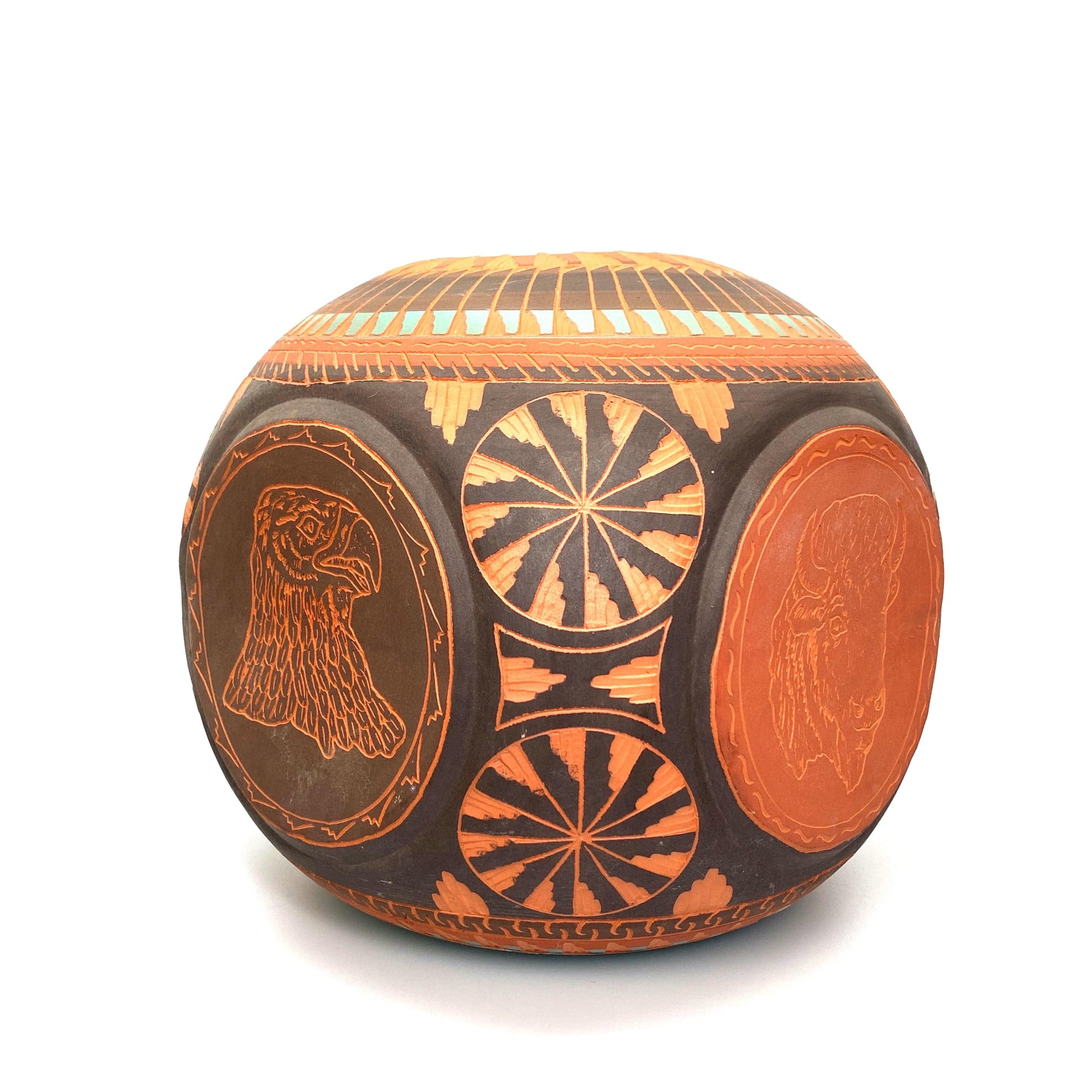 Navajo Pottery Anna Tsosie Signed Terra Cotta Hand Etched Relief 9.5” Large Rounded Square Vase
