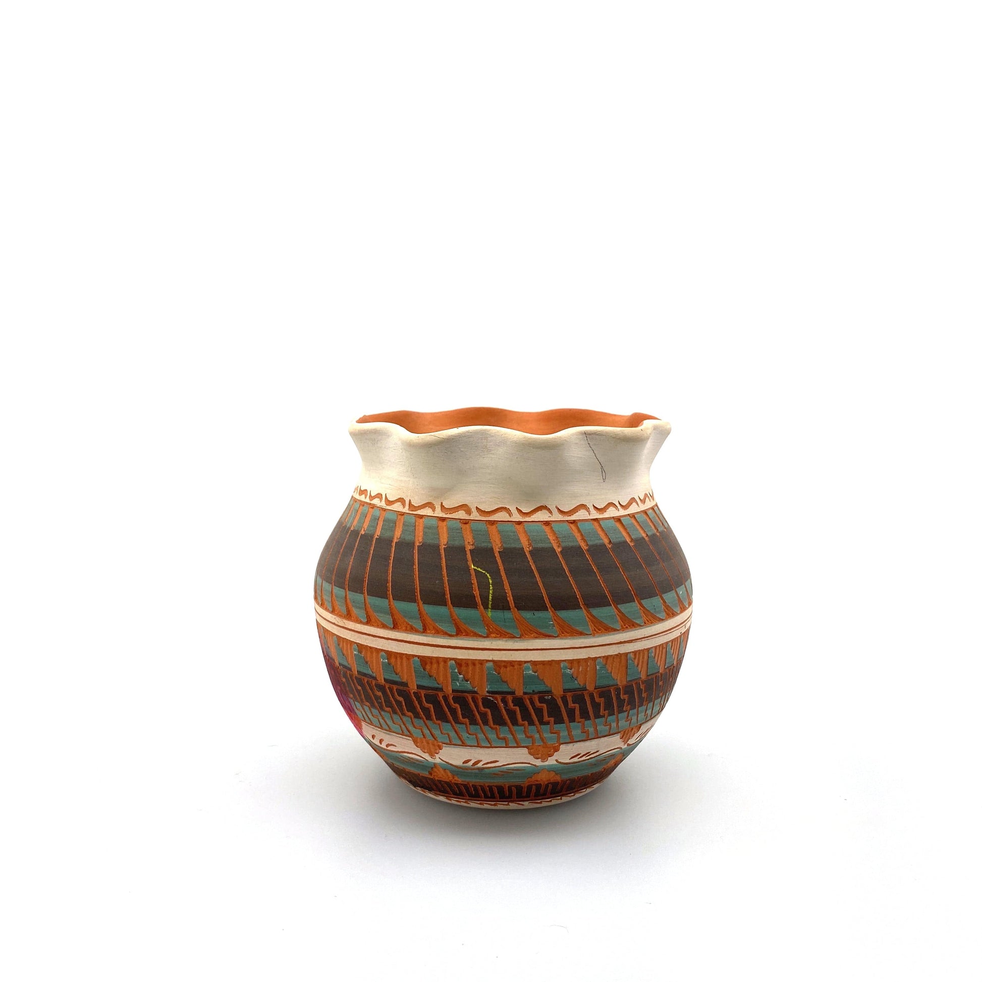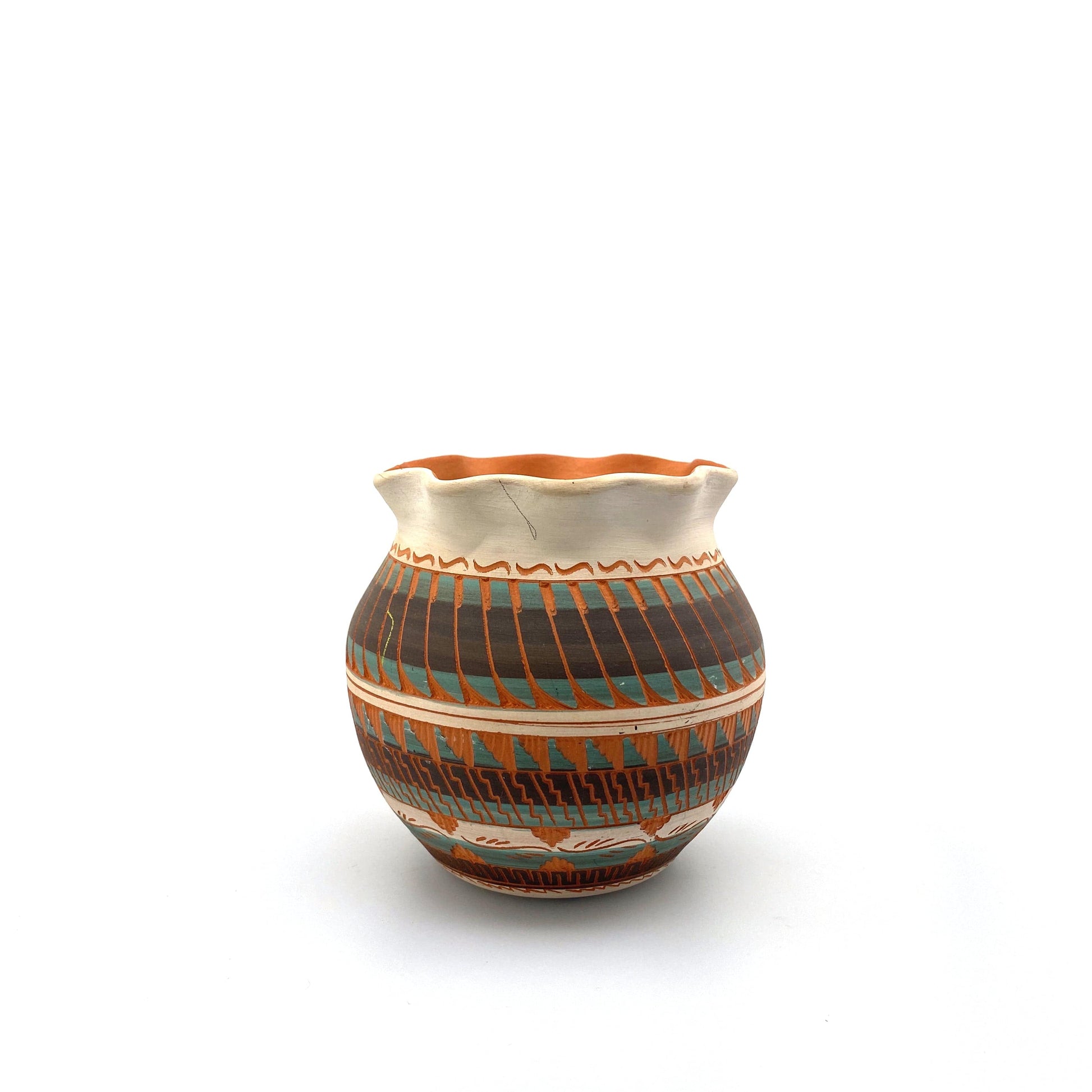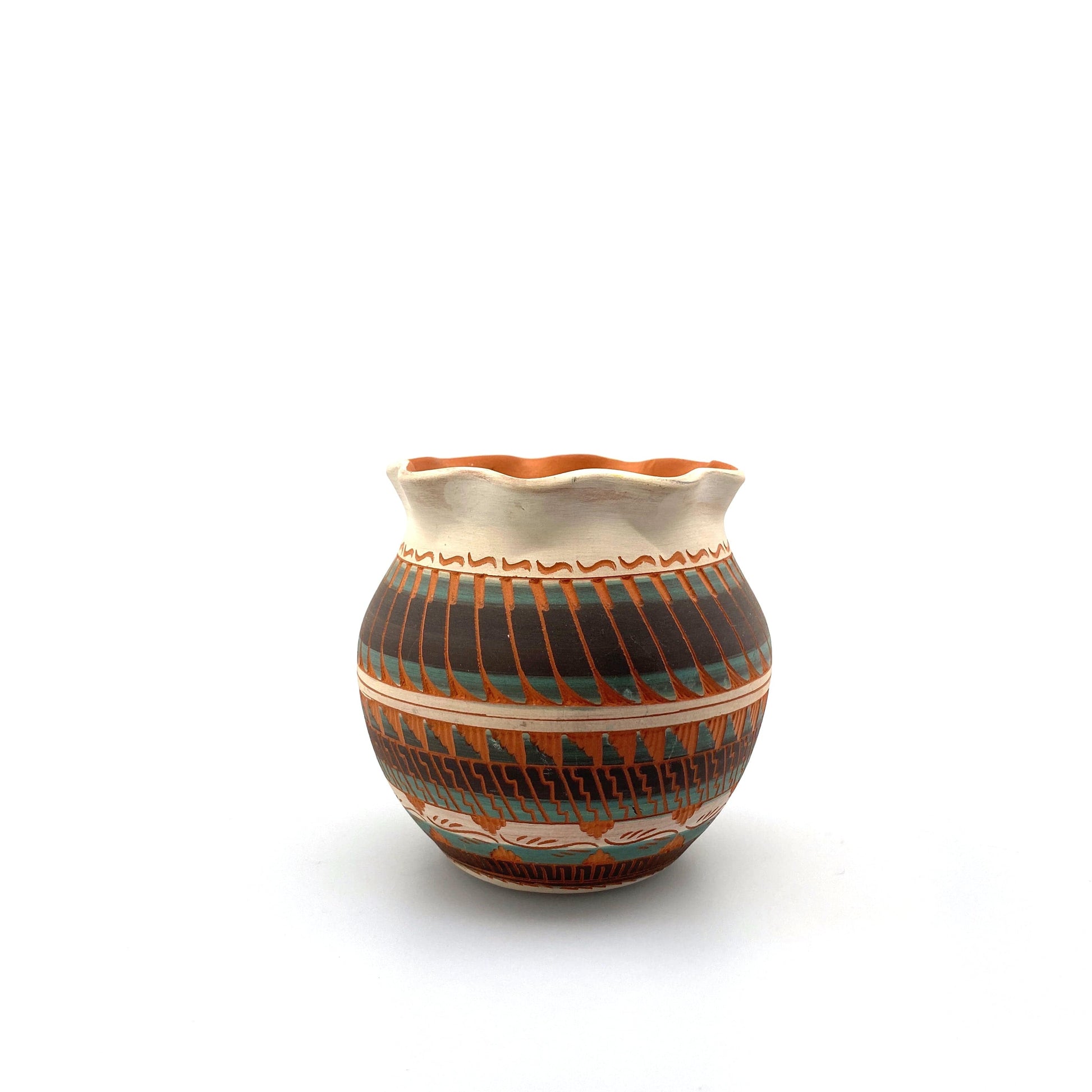 Navajo Pottery by Anna Tsosie Terra Cotta Hand Etched Jar 4.5” White Orange Blue