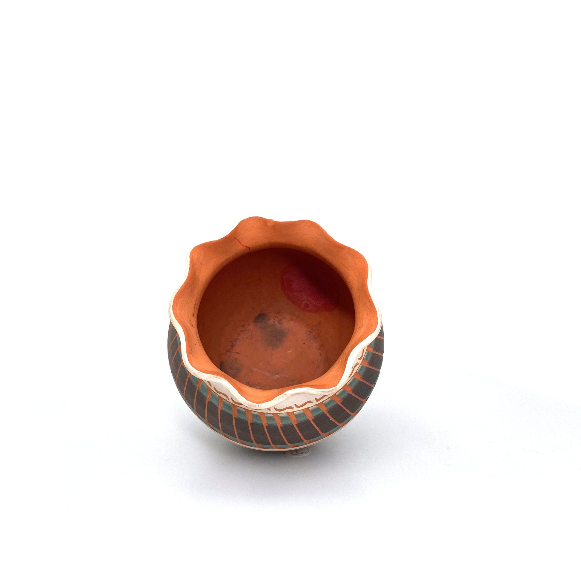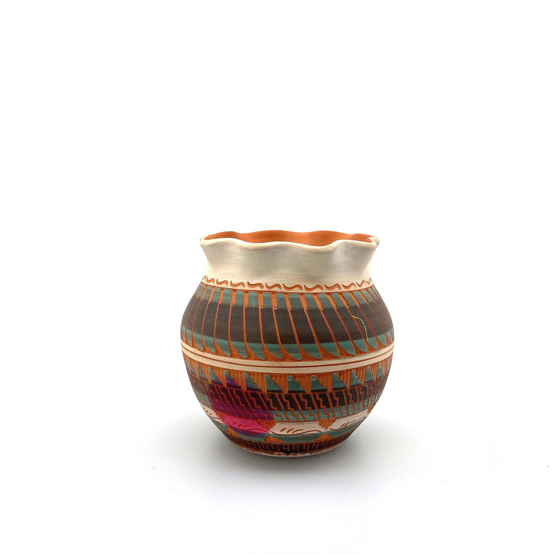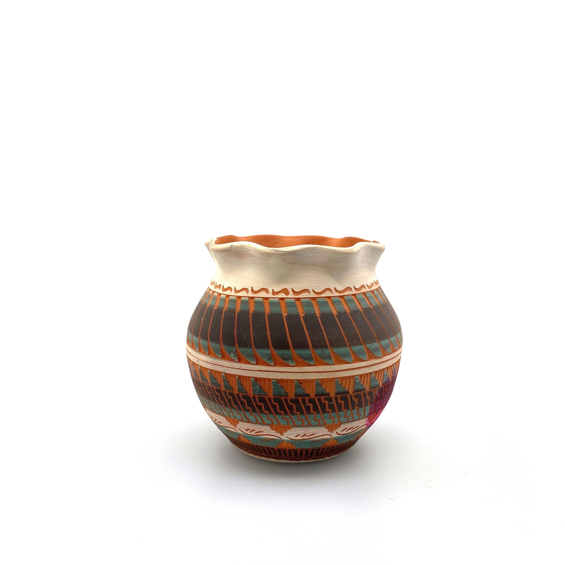 Navajo Pottery by Anna Tsosie Terra Cotta Hand Etched Jar 4.5” White Orange Blue