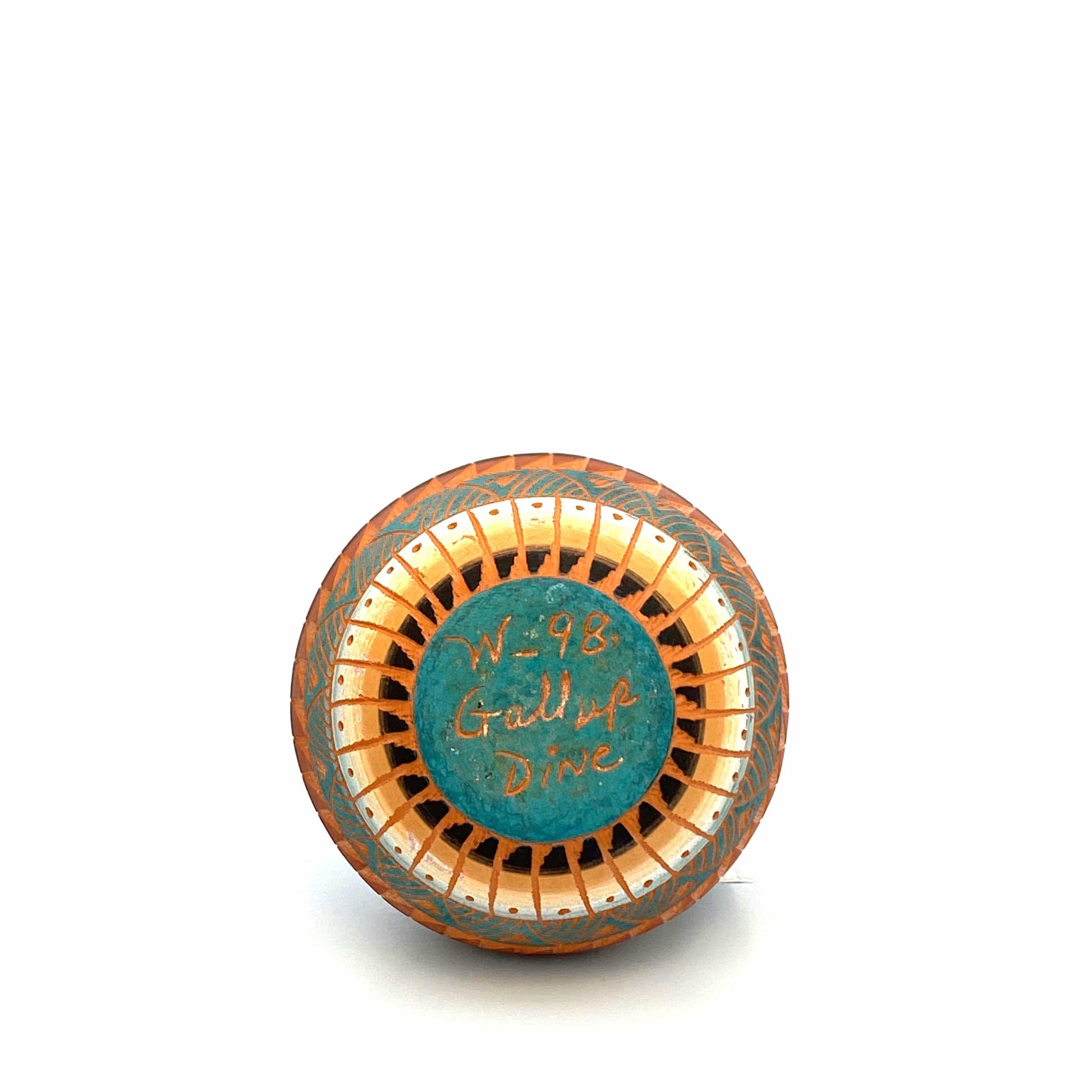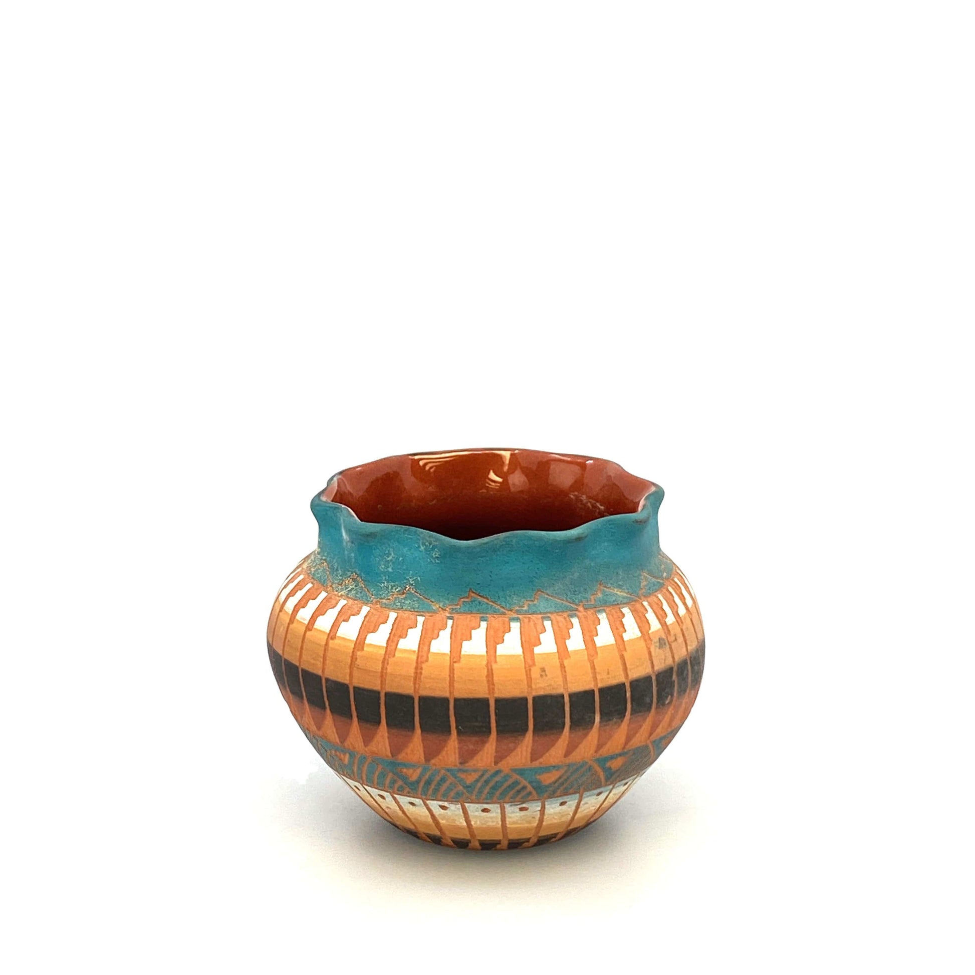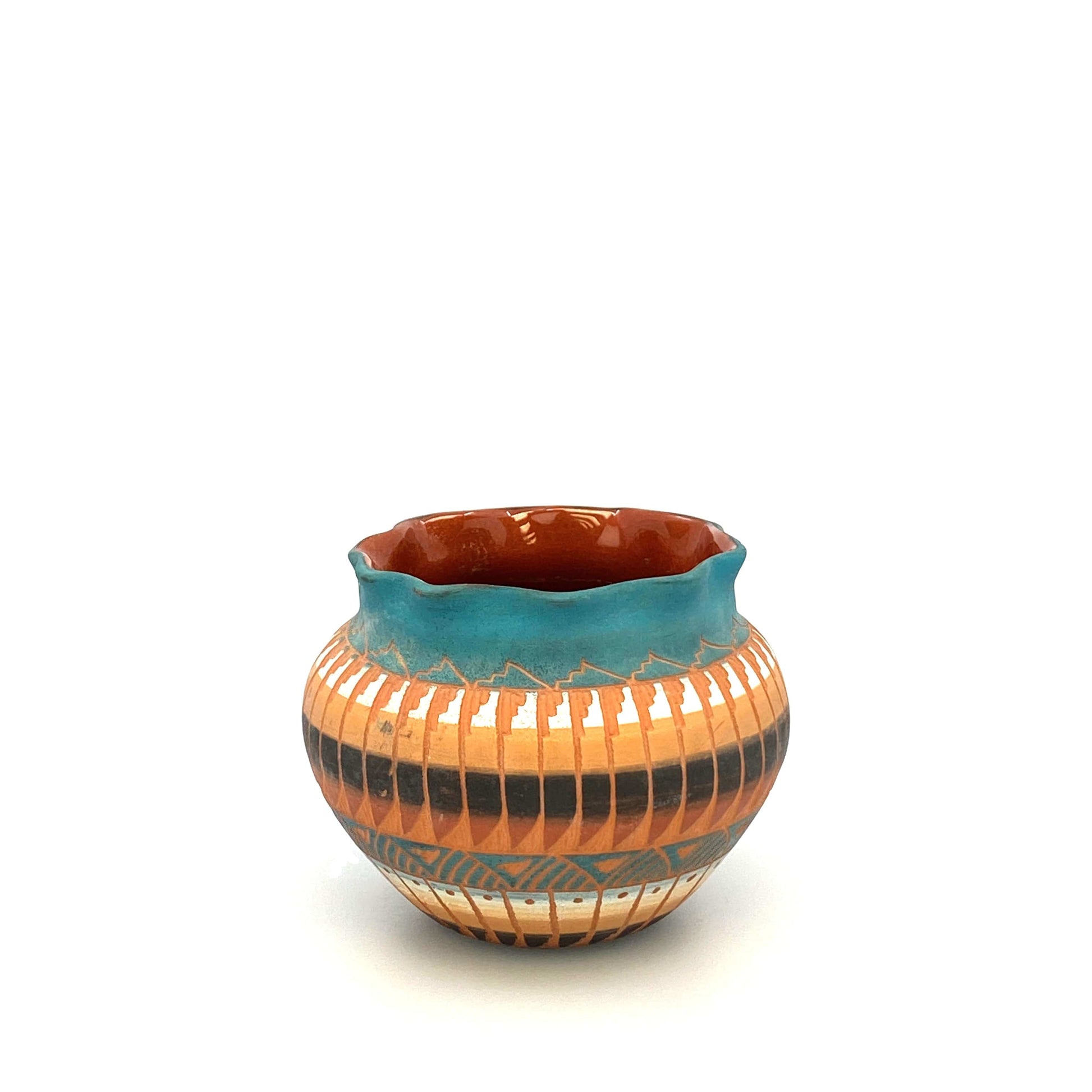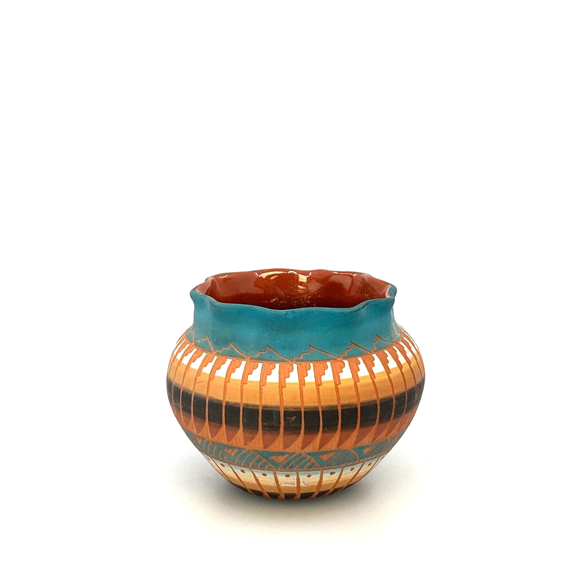 Navajo Pottery by Anna Tsosie Terra Cotta Hand Etched Small Pot 3.5” Blue Orange Brown