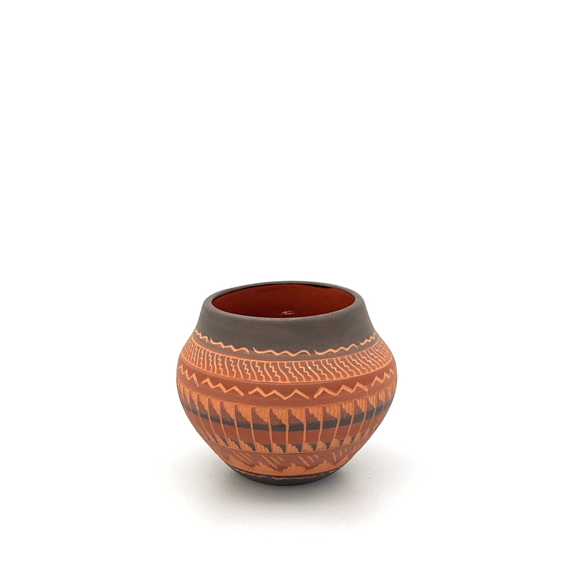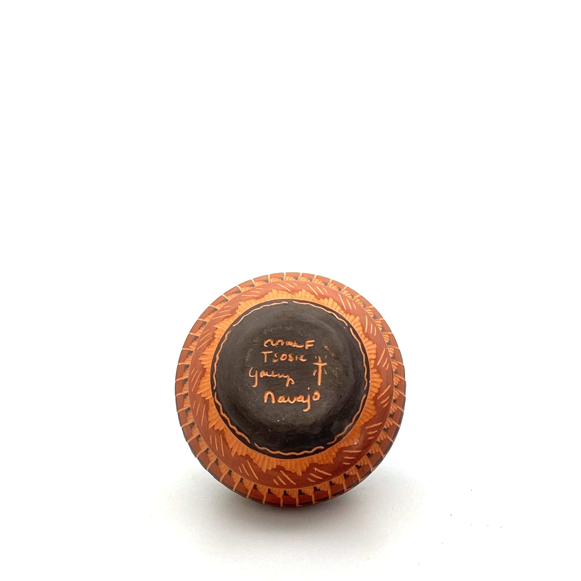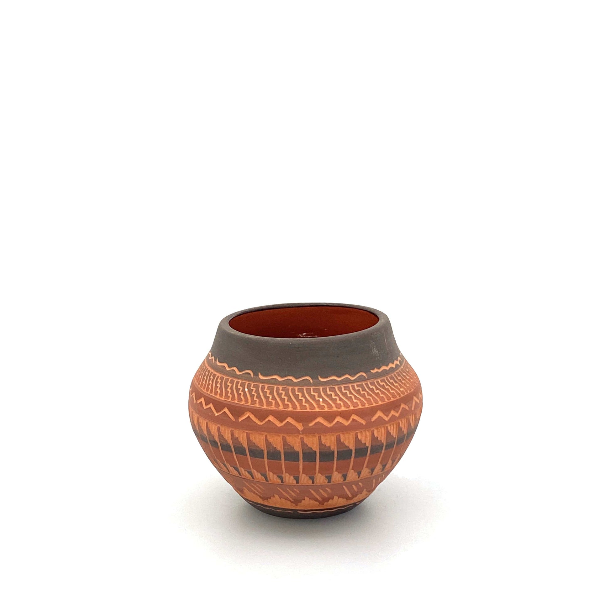 Add a touch of Native American artistry to your home with this stunning Navajo Pottery by Anna Tsosie. Hand-etched and made in the USA, this small terra cotta pot features a beautiful orange and brown design. Perfect for adding a pop of color to any space.