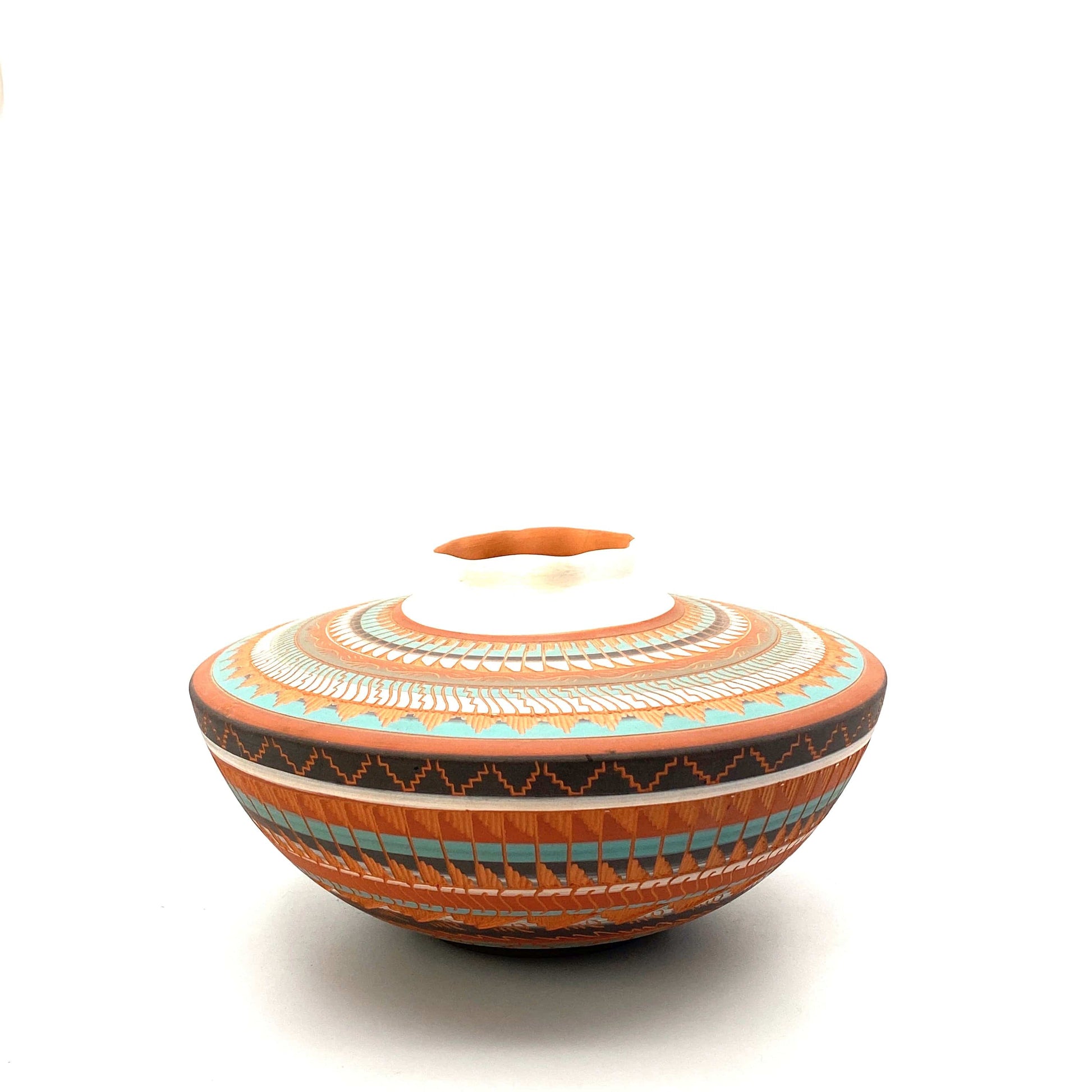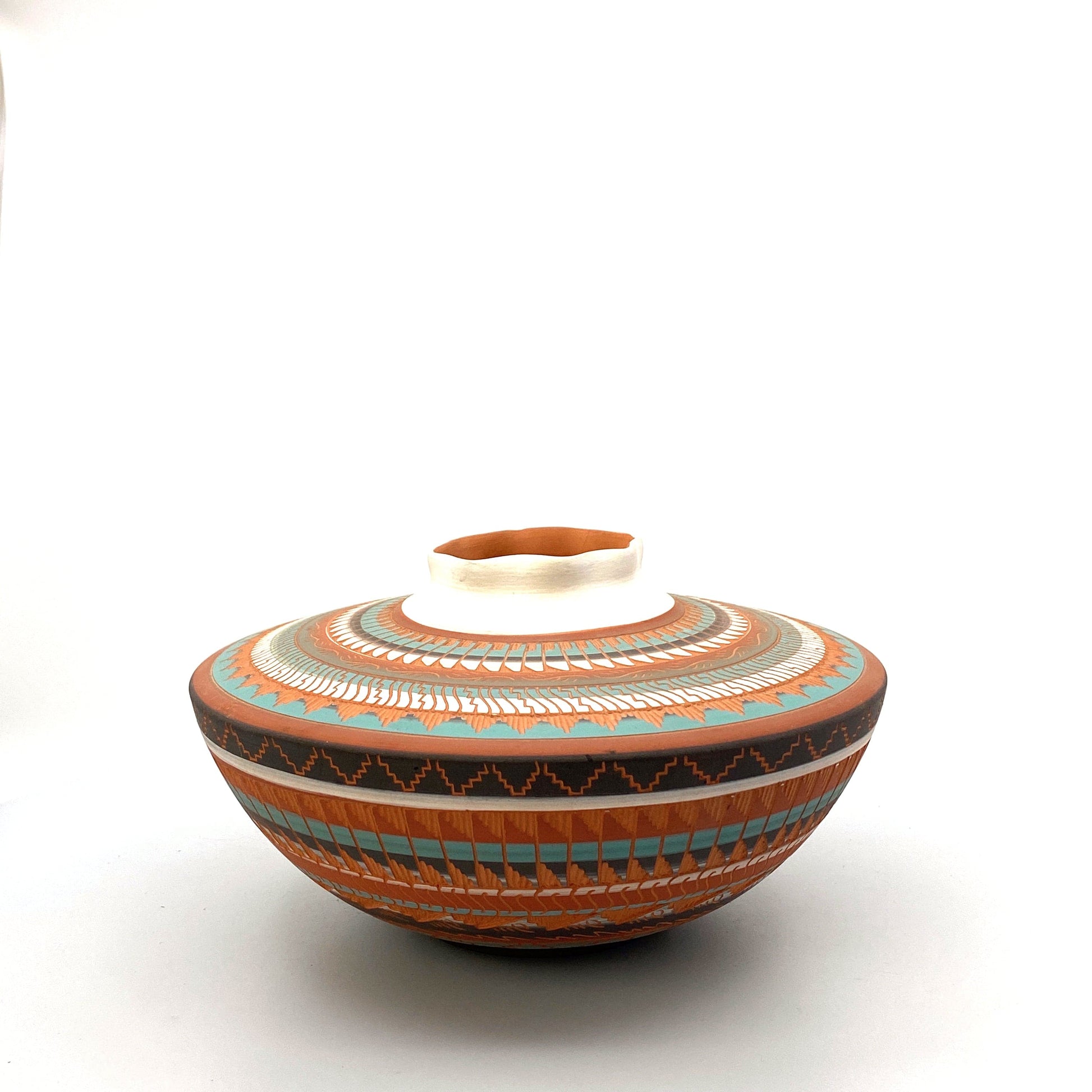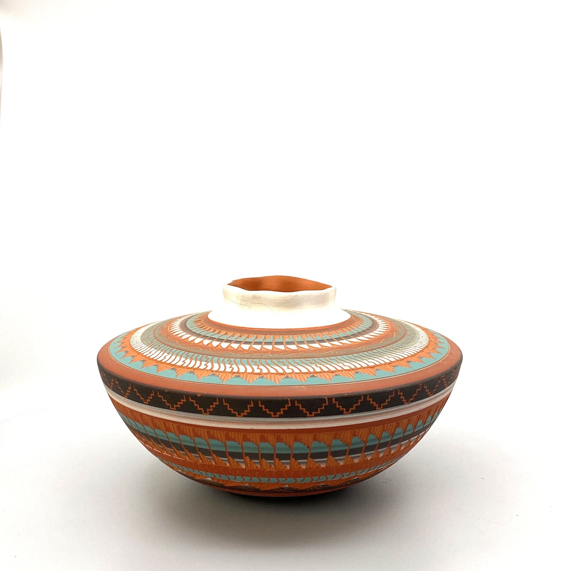Add a touch of Native American artistry to your home with this stunning Navajo Pottery water bowl. Hand-etched with intricate designs, this terra cotta bowl features a scalloped top and a beautiful combination of white, orange, and brown colors. Made in the USA by Anna Tsosie, this piece is a true work of art.