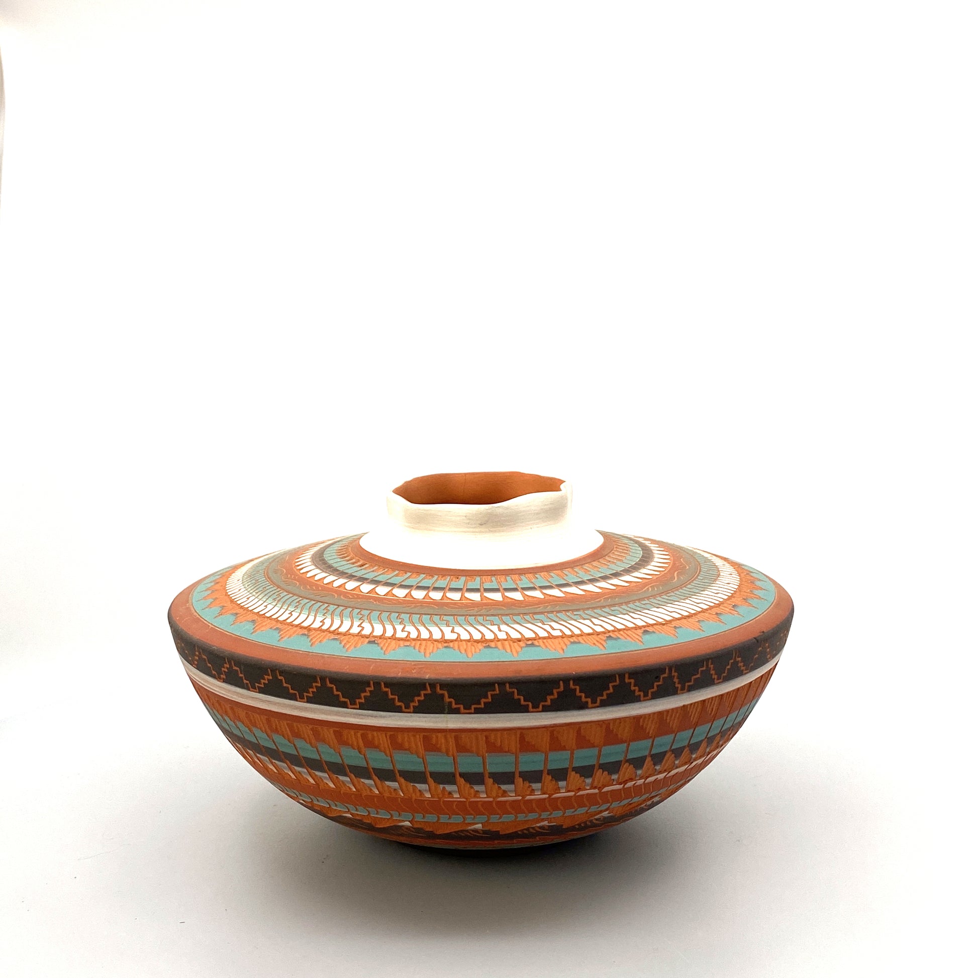 Navajo Pottery by Anna Tsosie Water Bowl Scalloped Top Terra Cotta white Orange Brown Hand Etched 7”