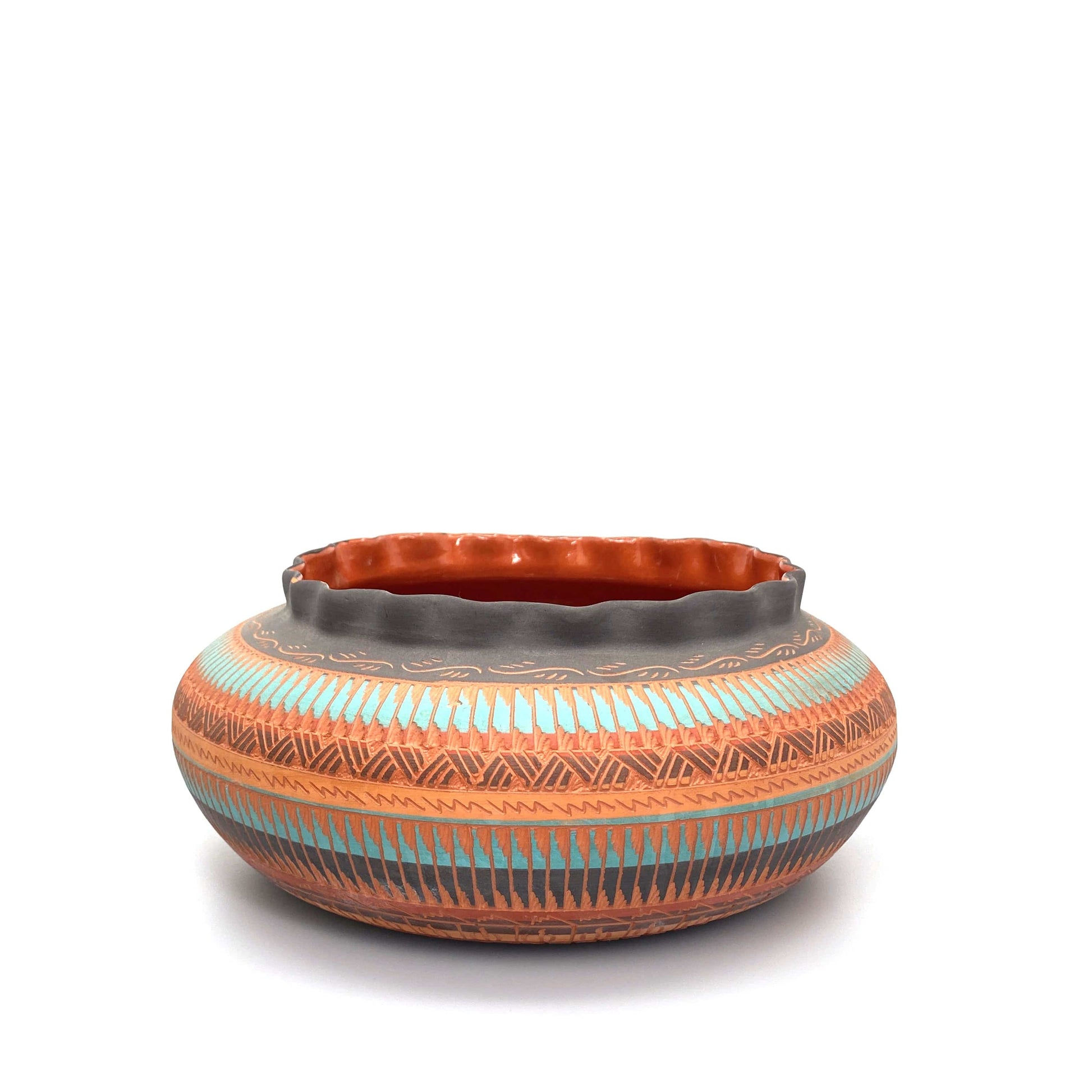 Add a touch of Native American artistry to your home with this stunning Navajo Pottery water bowl. Hand etched by Anna Tsosie, this terra cotta bowl features a scalloped top and vibrant orange color. Perfect for adding a pop of color to any space.