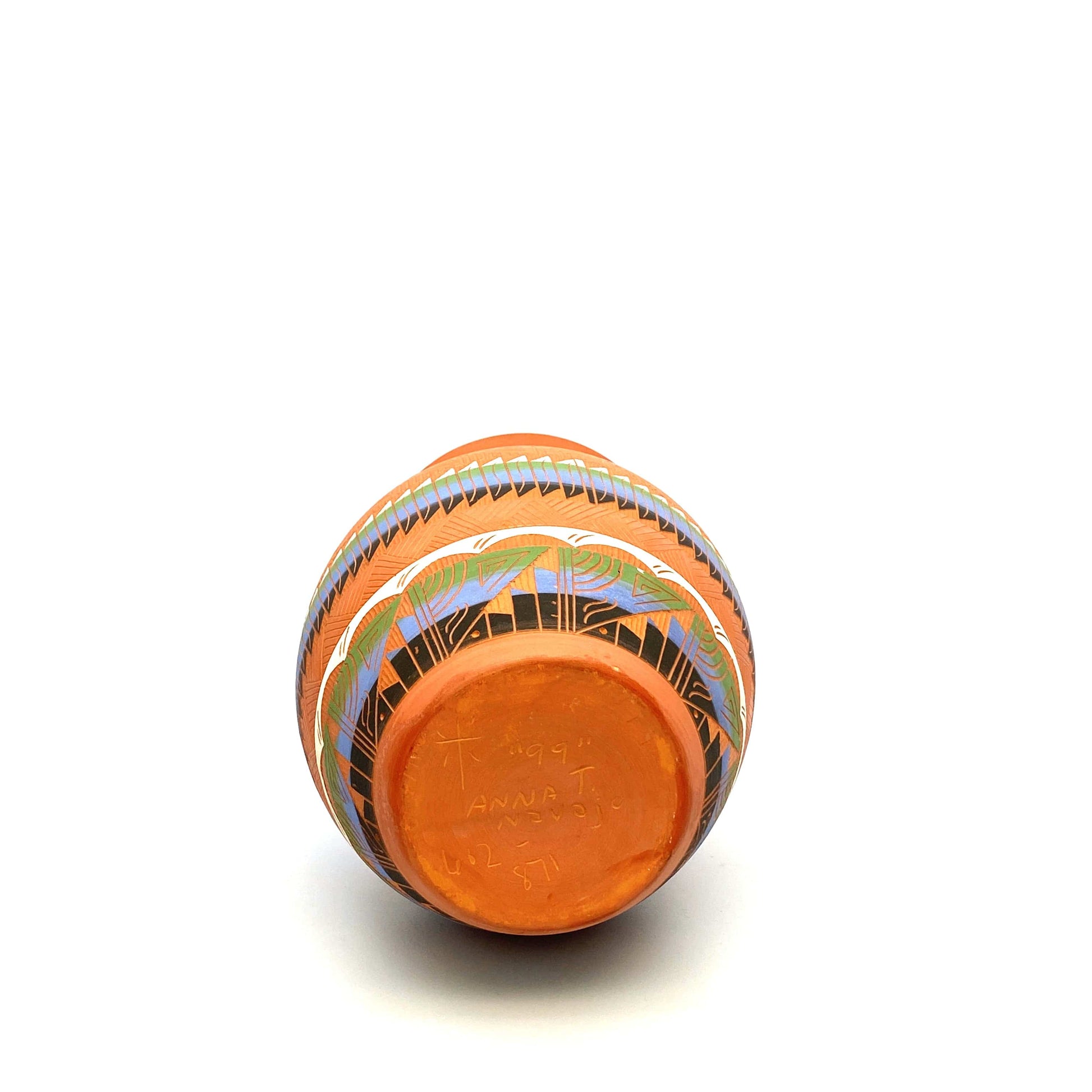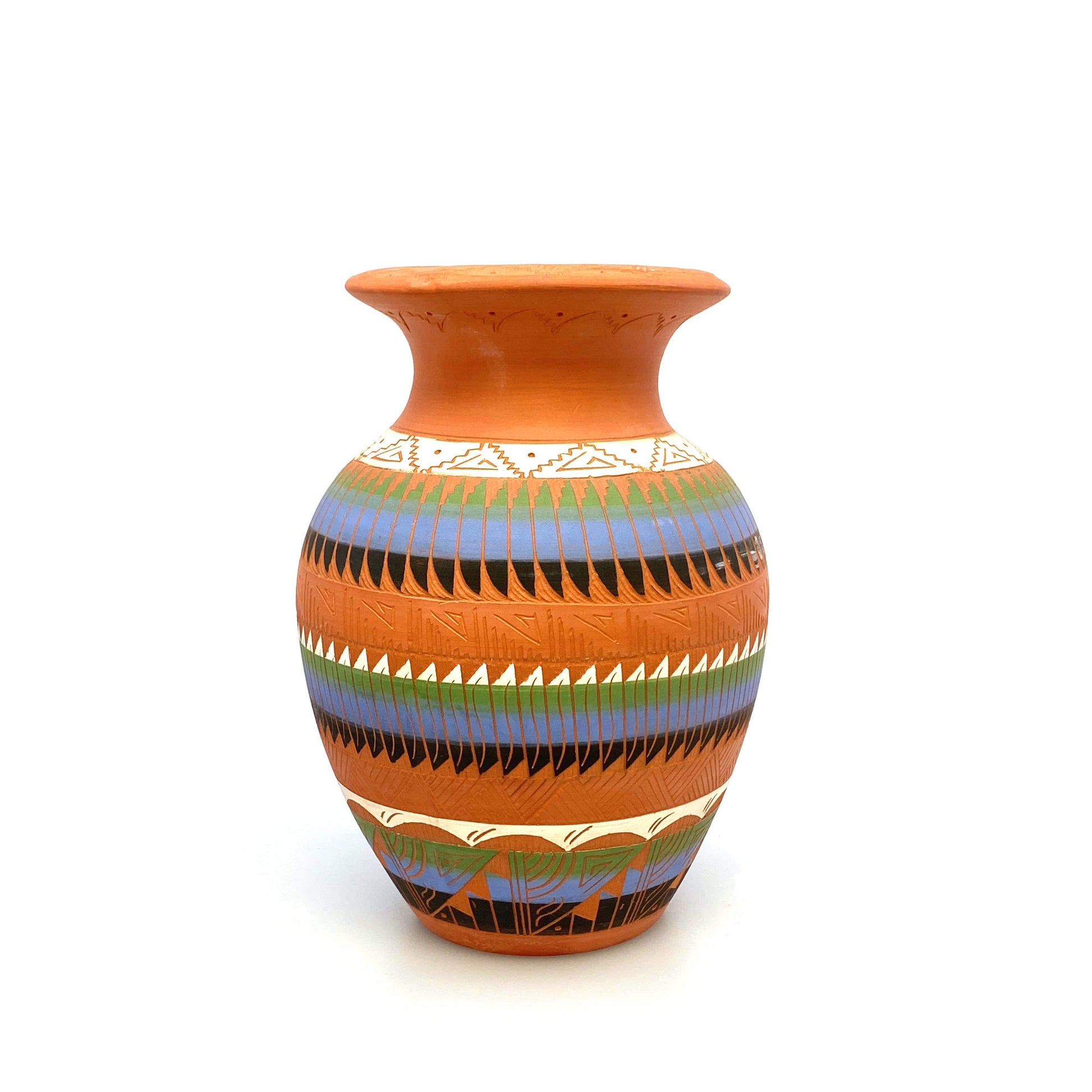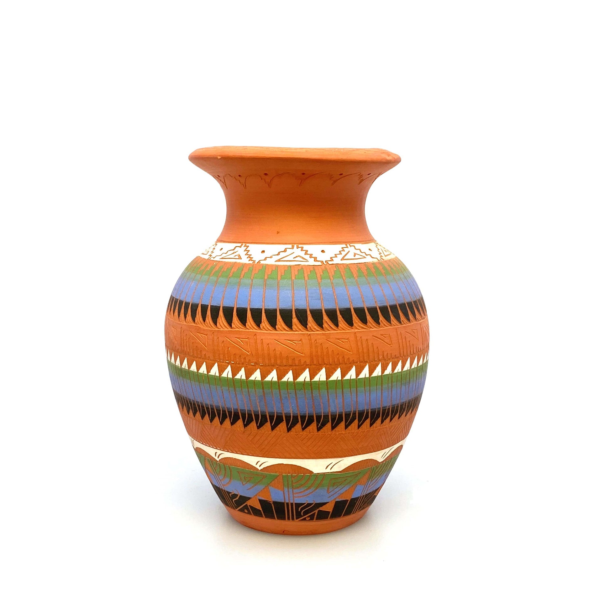 Add a touch of Native American artistry to your home with this stunning Navajo Pottery Vase. Hand etched by Anna Tsosie, this terra cotta vase features beautiful orange and blue colors. Perfect for adding a pop of color to any room.