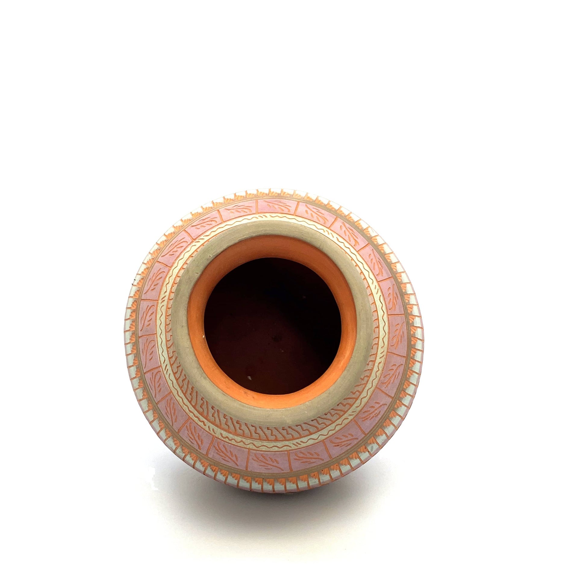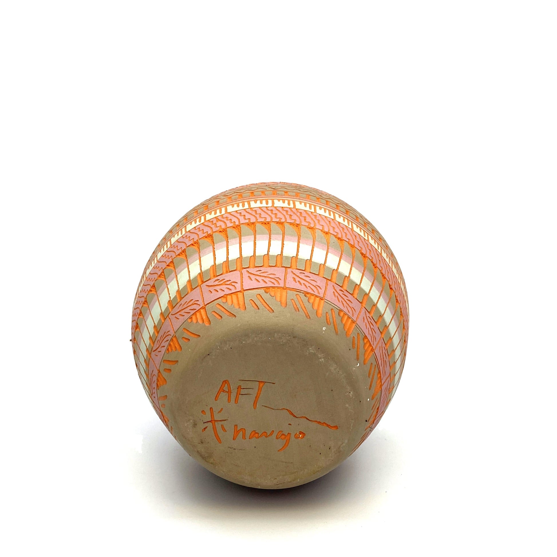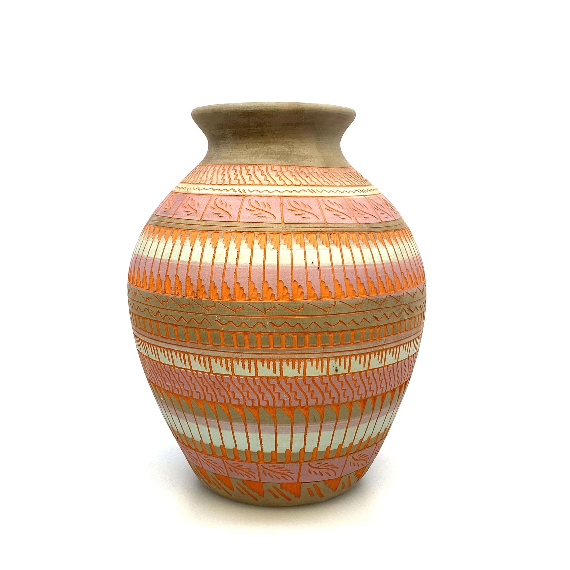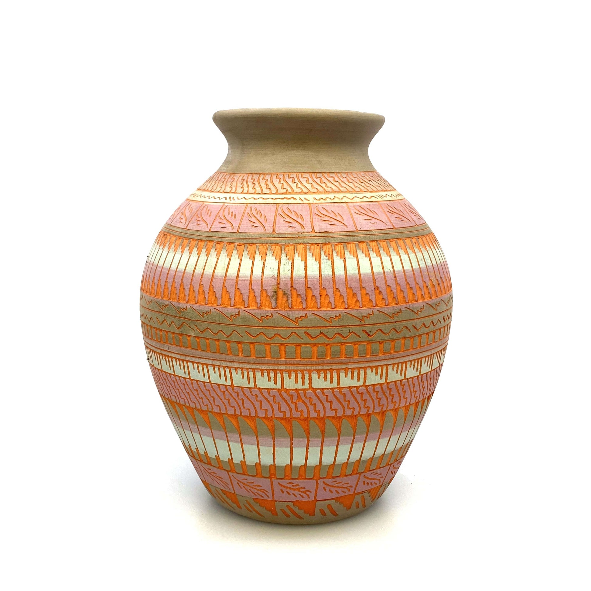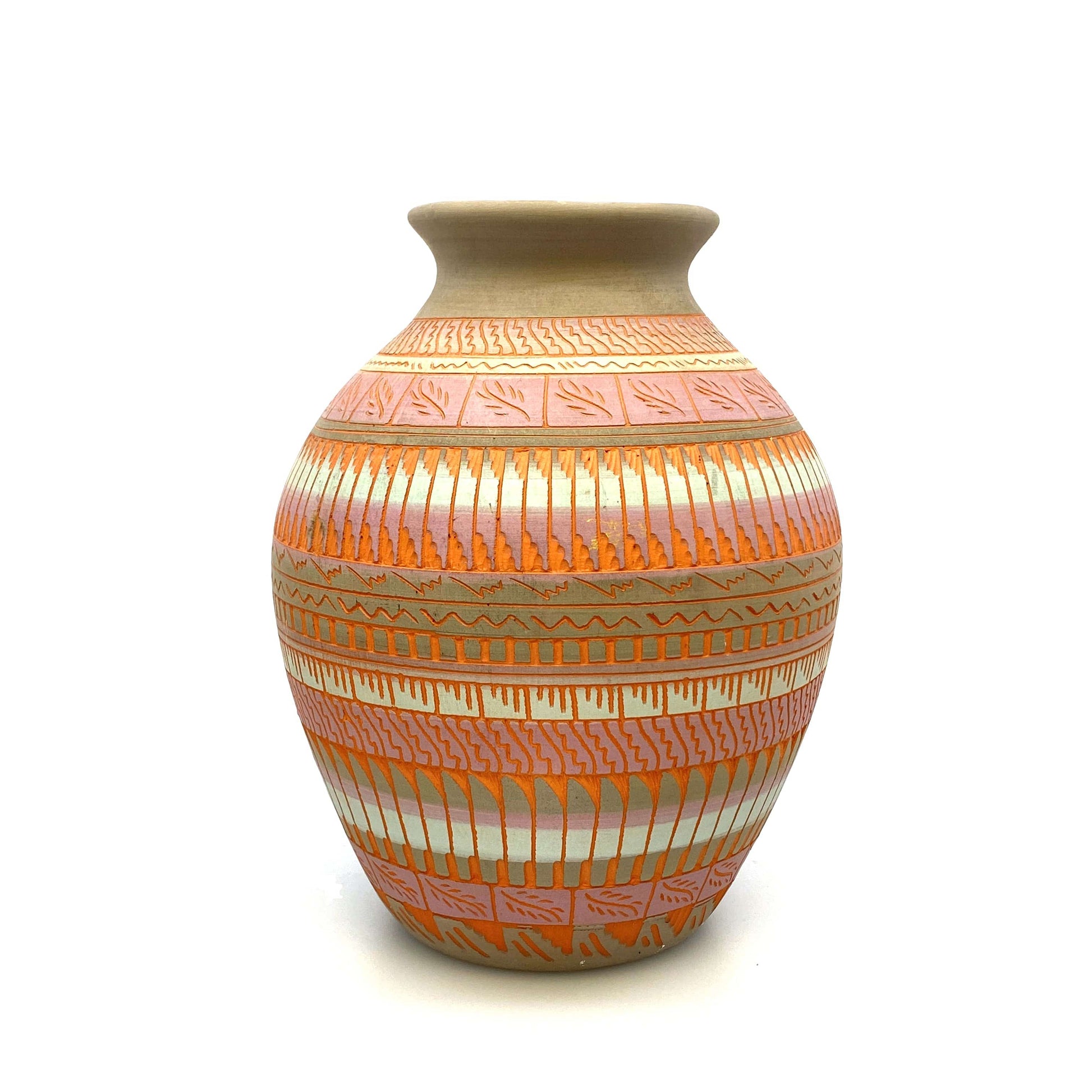 Add a touch of Native American artistry to your home with this stunning Navajo Pottery Vase. Hand etched by Anna Tsosie, this terra cotta vase features beautiful pink and orange hues. Perfect for adding a pop of color to any space.